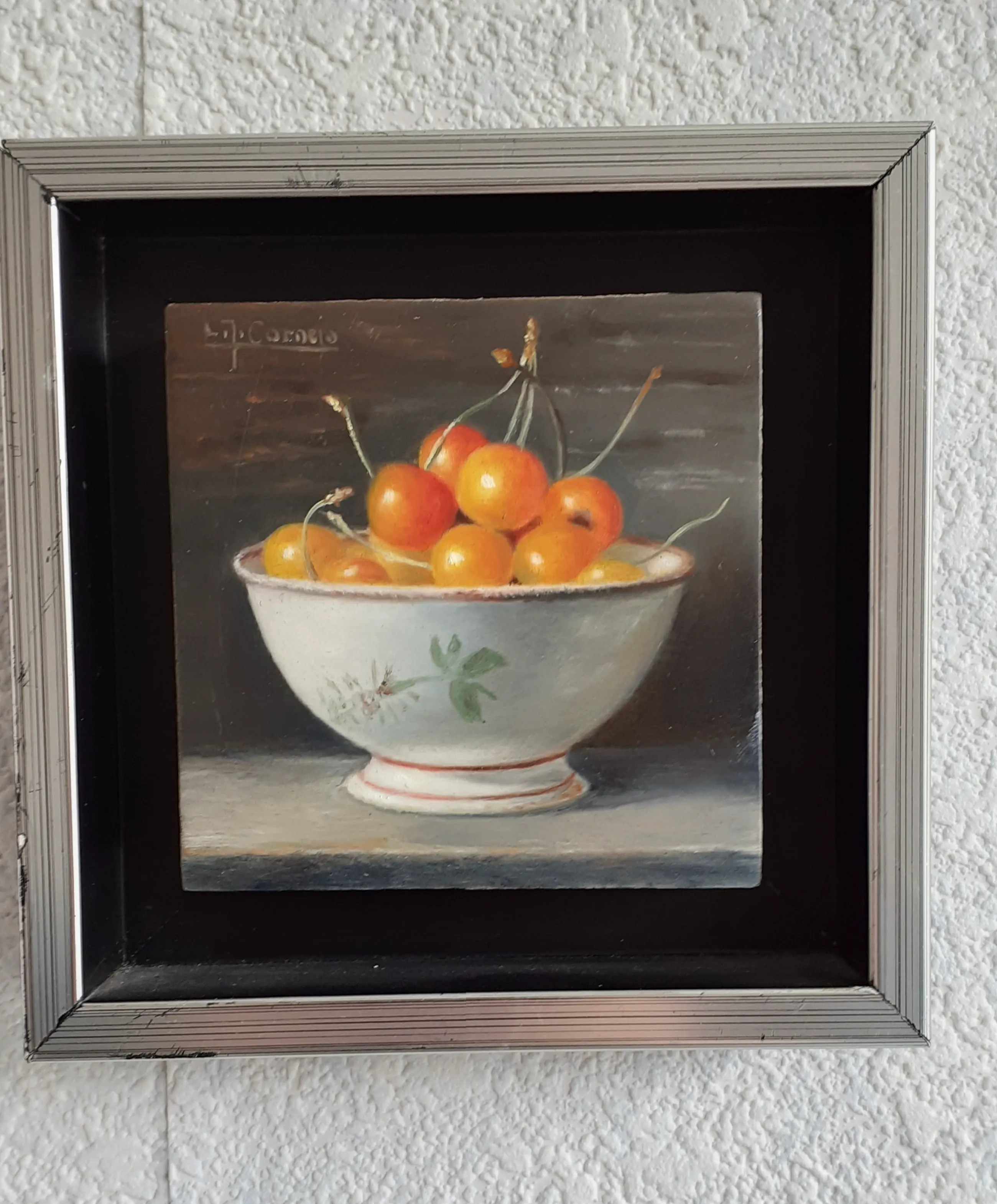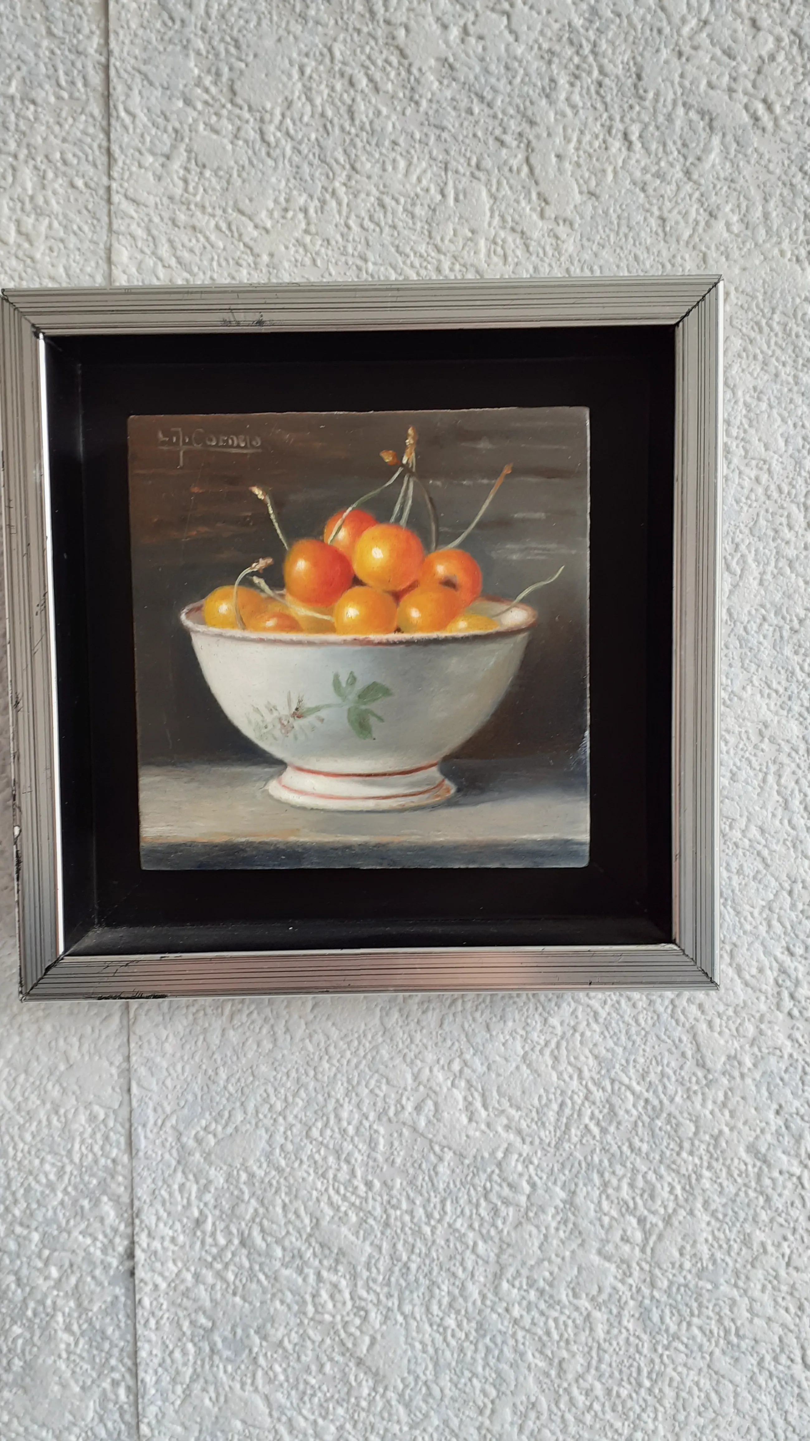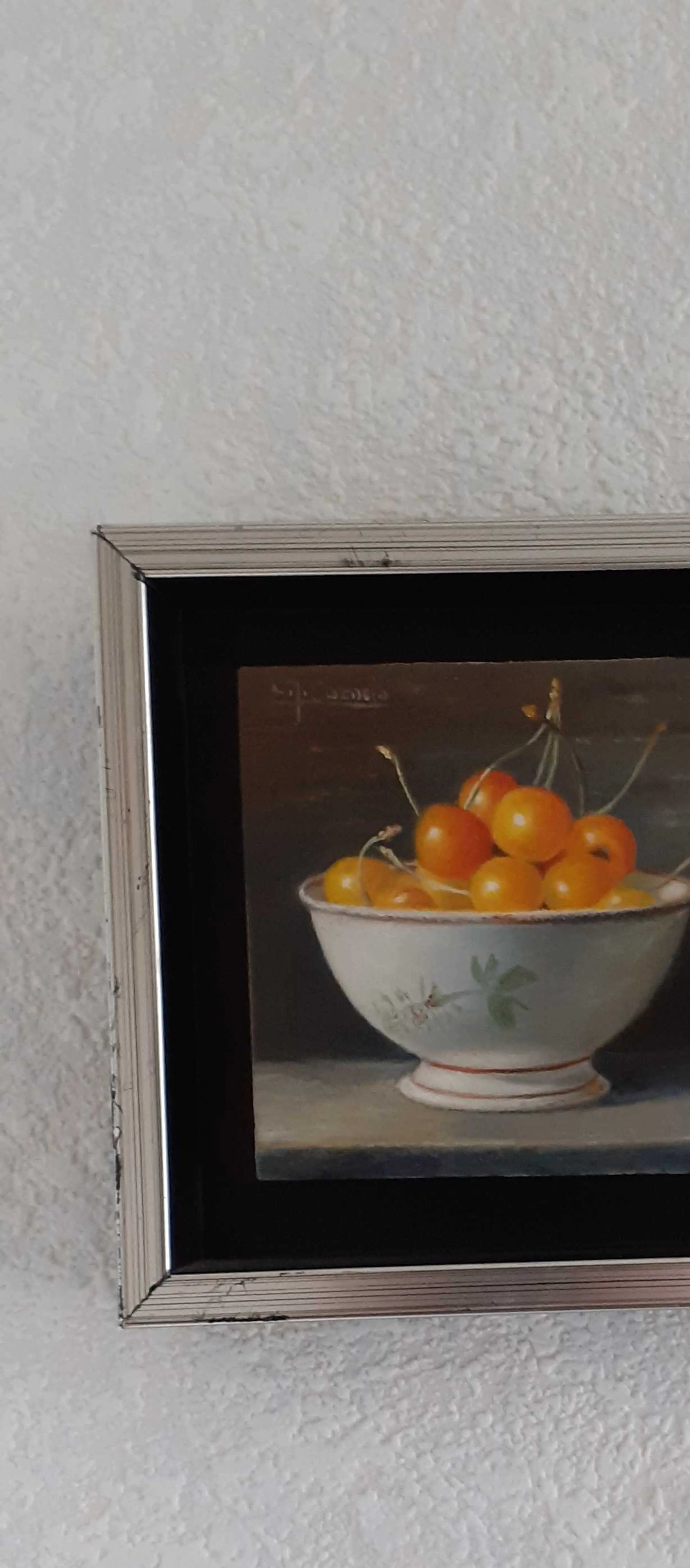 Klein schilderijtje in stevig zilveren lijstje Heel gedetailleerd. Grote witte keramieken schaal met daarin kersen met steeltjes