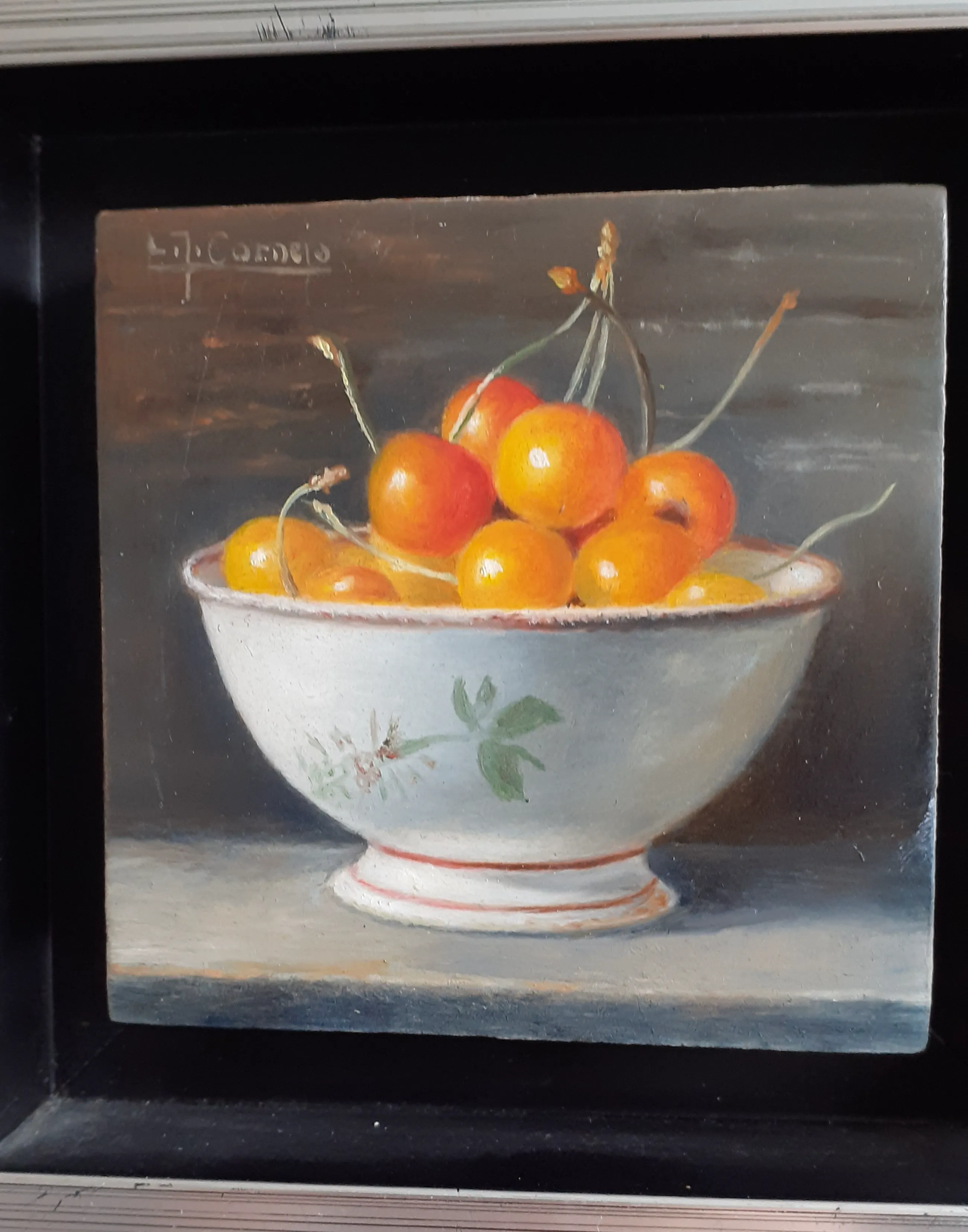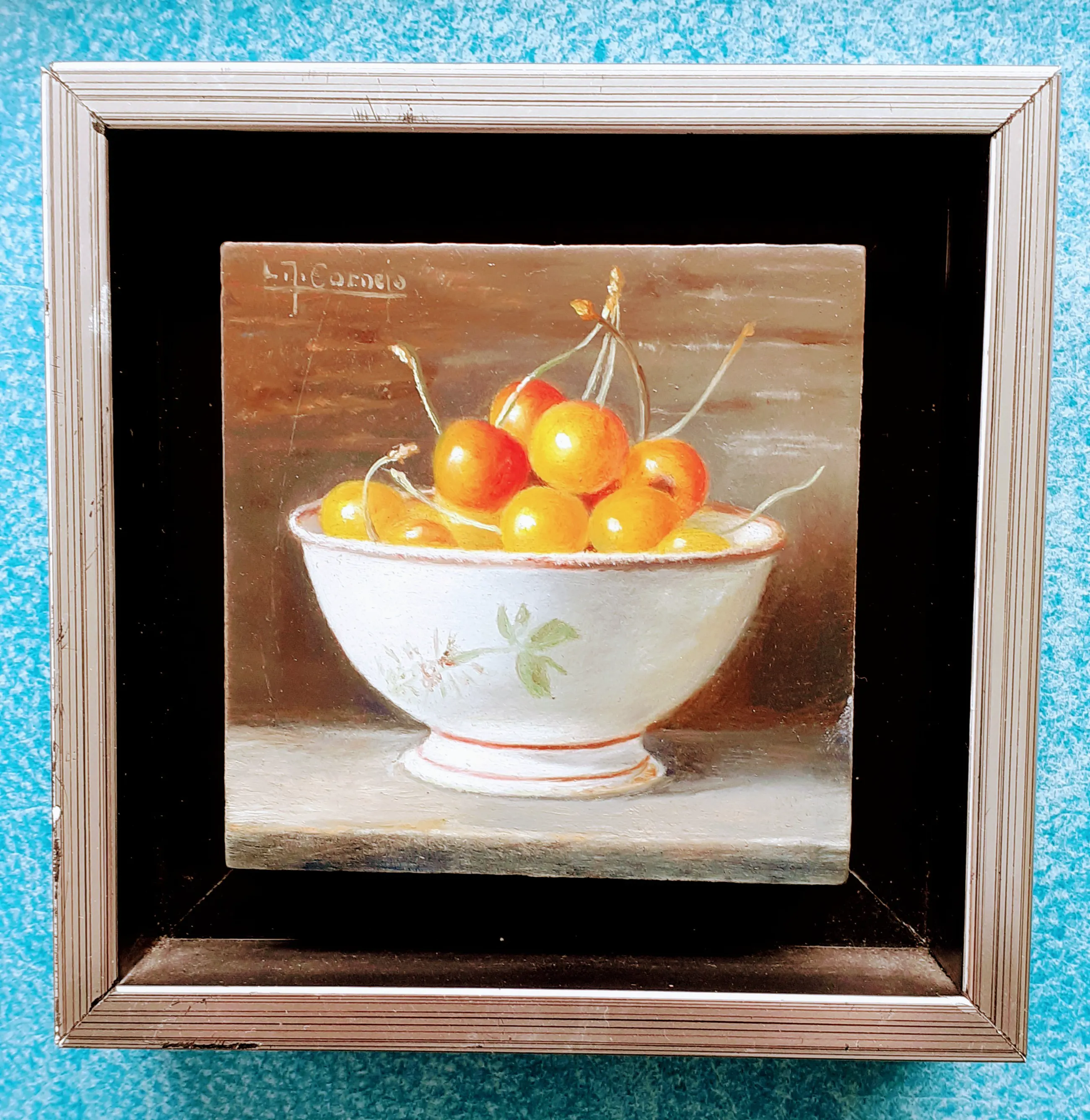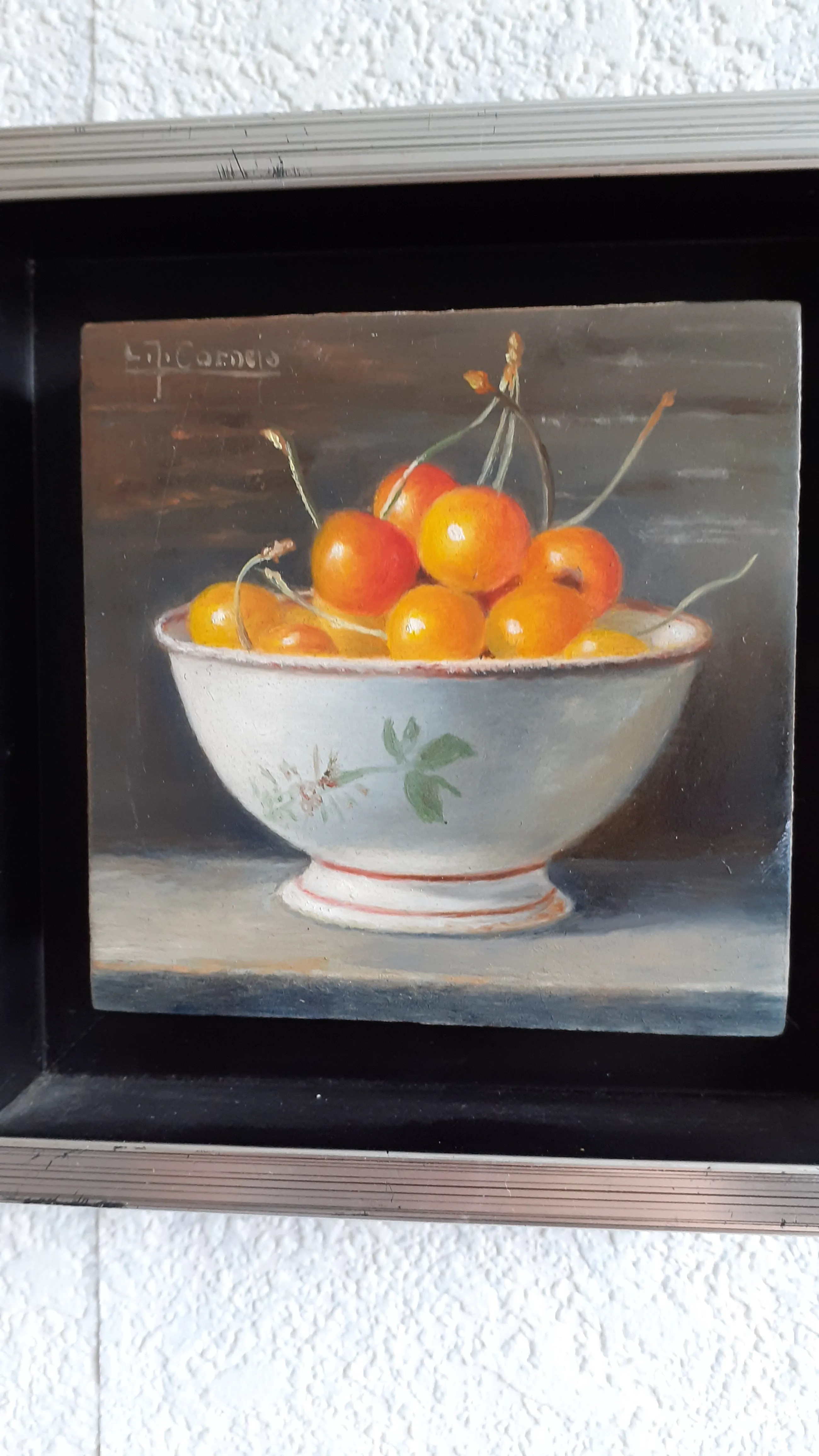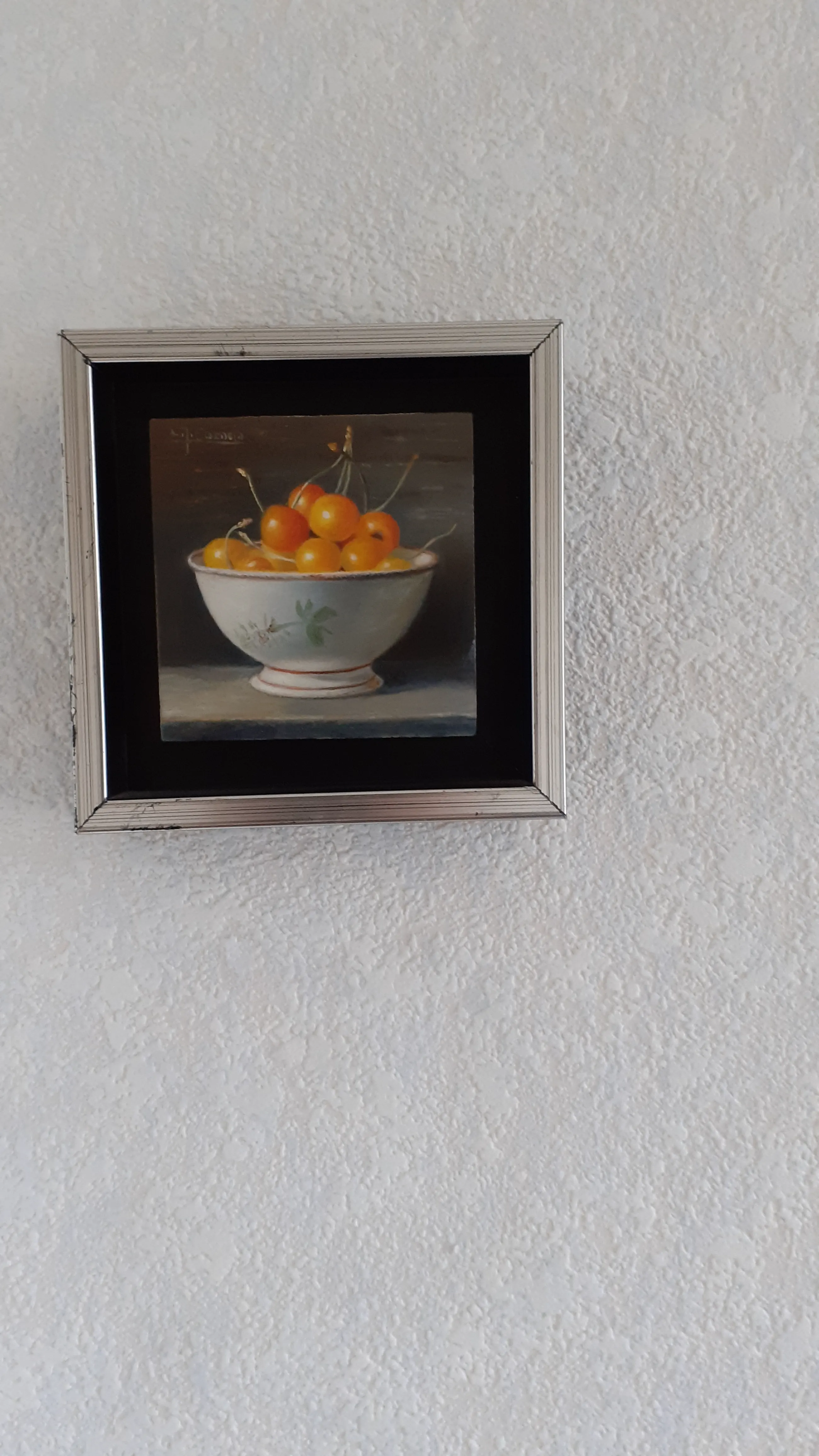 Klein schilderijtje in stevig zilveren lijstje Heel gedetailleerd. Grote witte keramieken schaal met daarin kersen met steeltjes