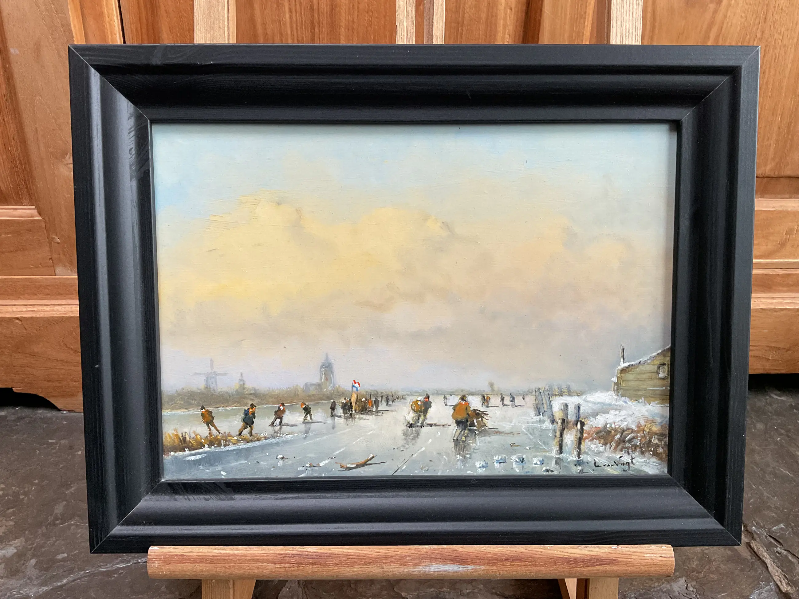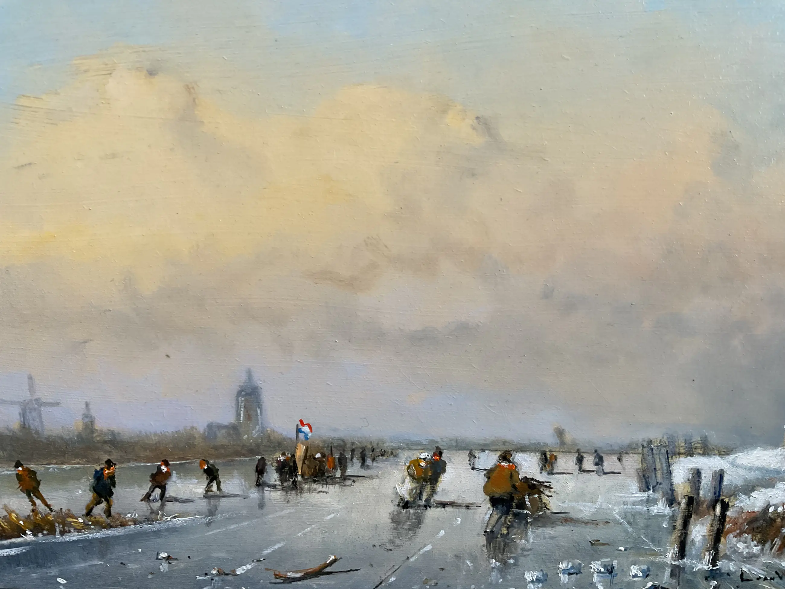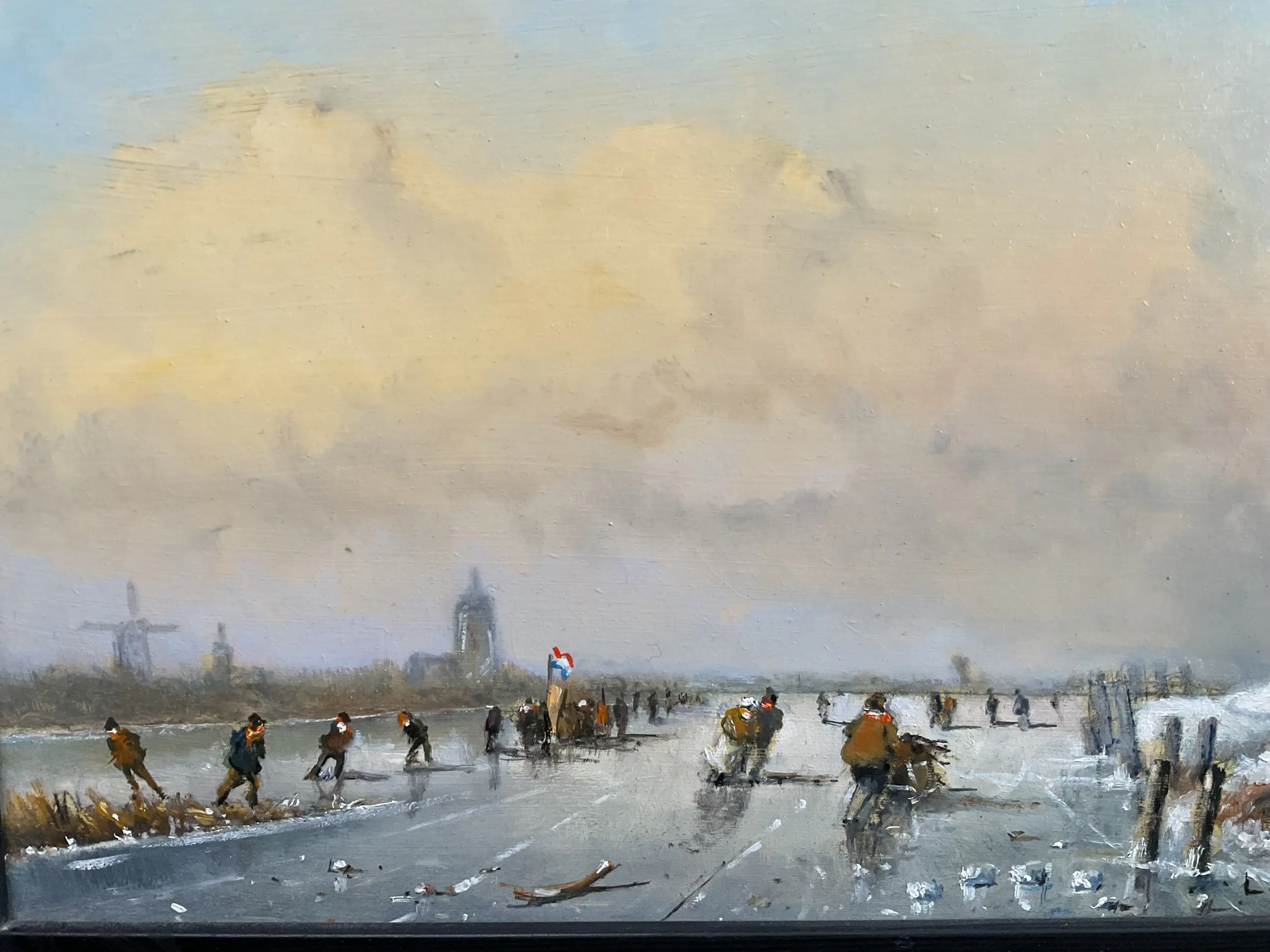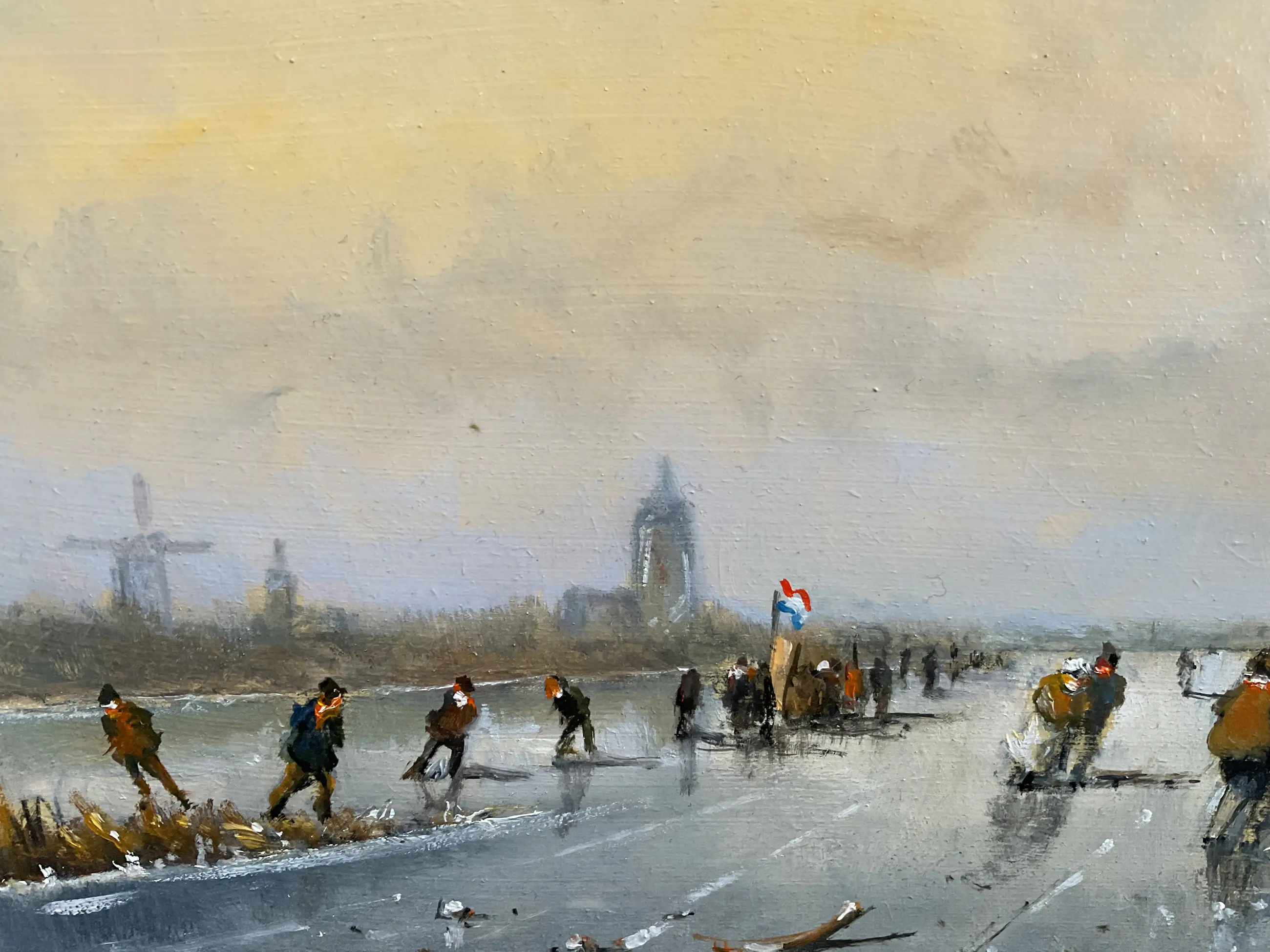Sfeervol nostalgisch beeld van een Hollandse winter. Schaatspret! Leen van Vugt is een Zeeuw die bekend is om zijn nostalgische werkjes.