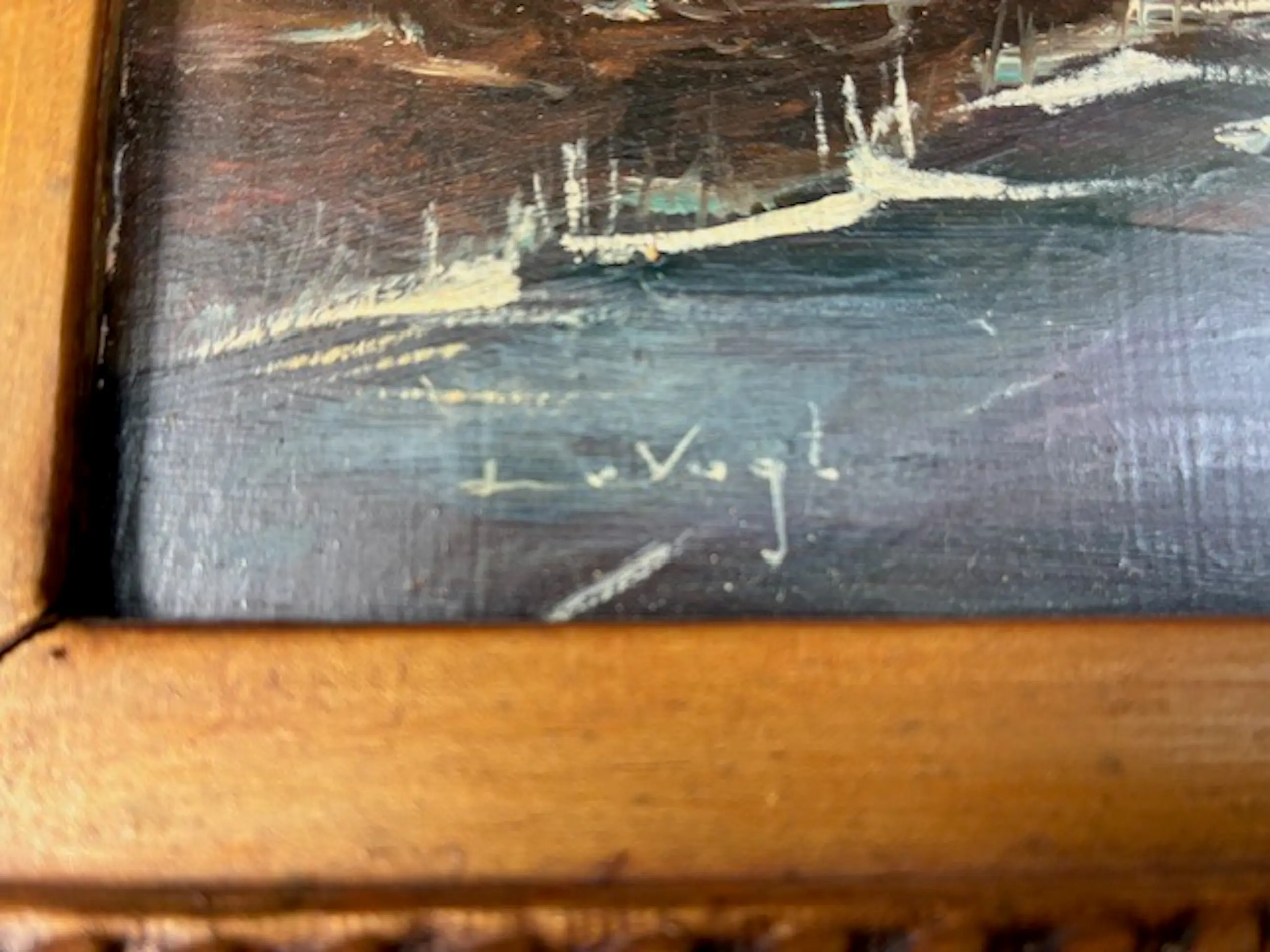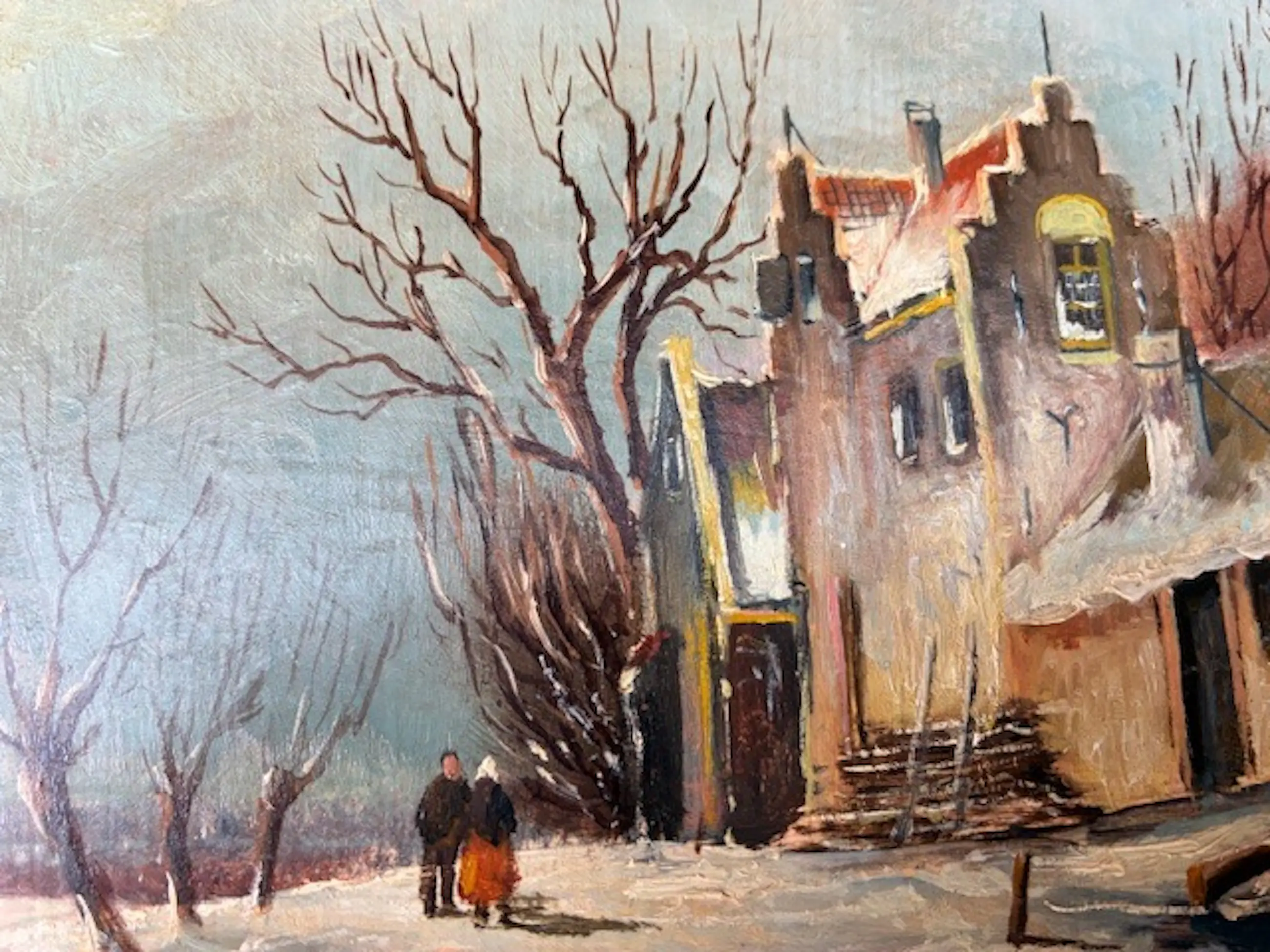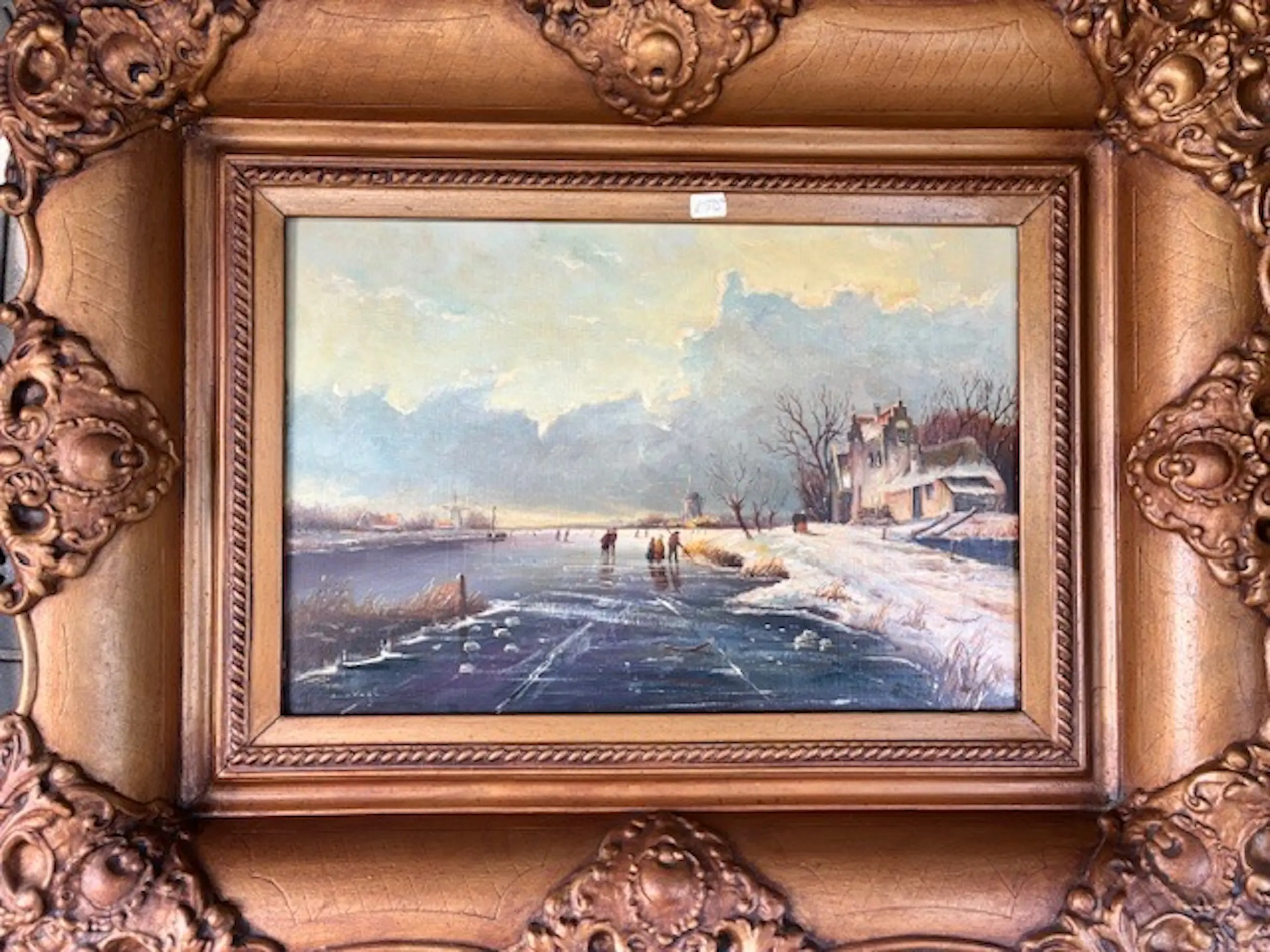 Nostalgische voorstelling van ijspret op een koude winterdag. Lijst en schilderij zijn in erg goede staat.