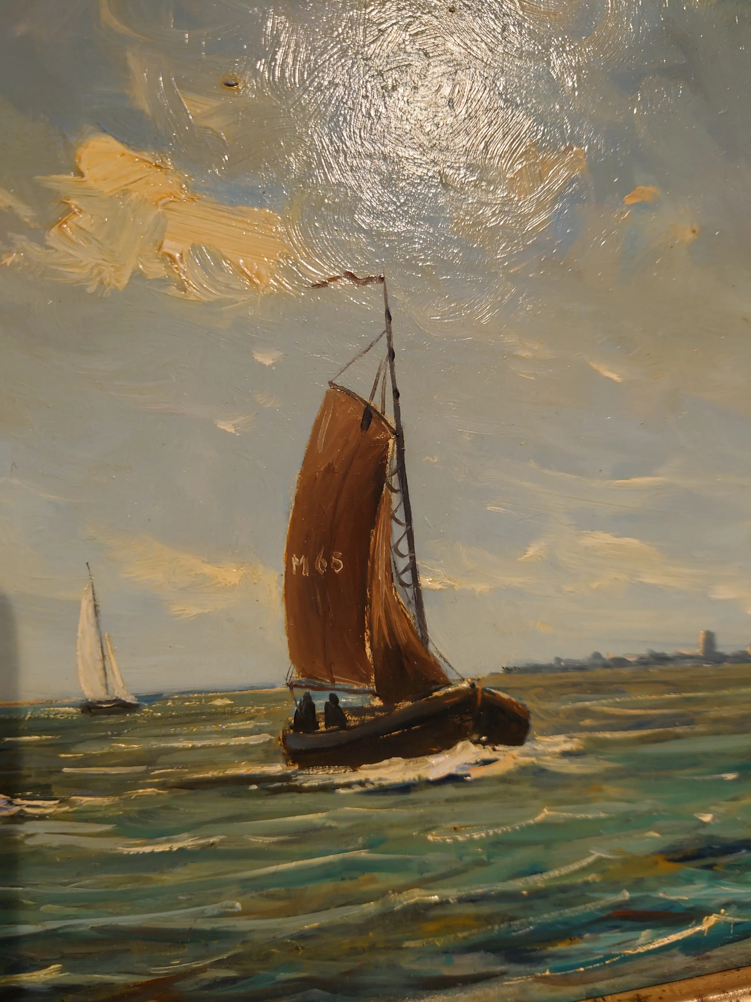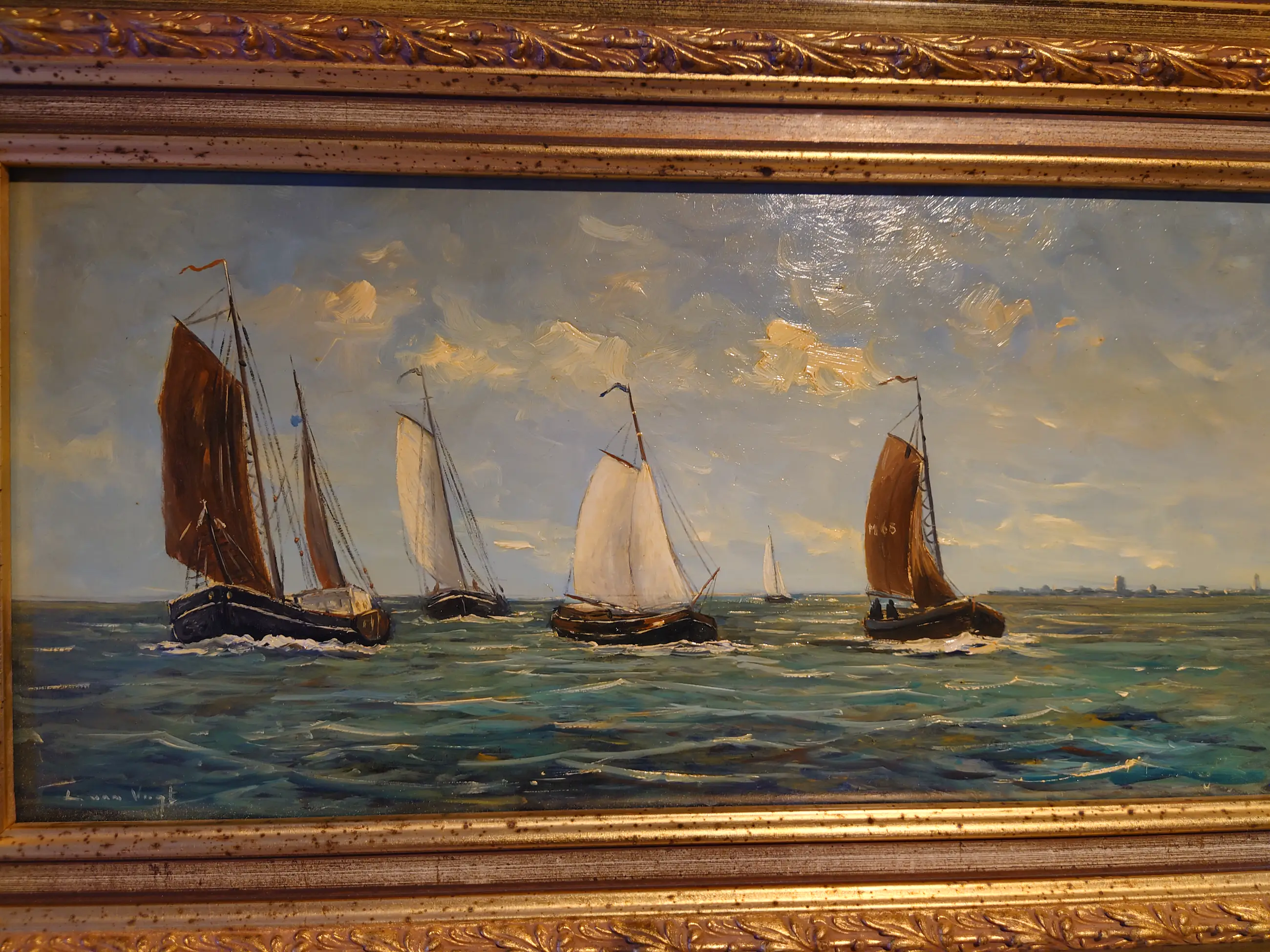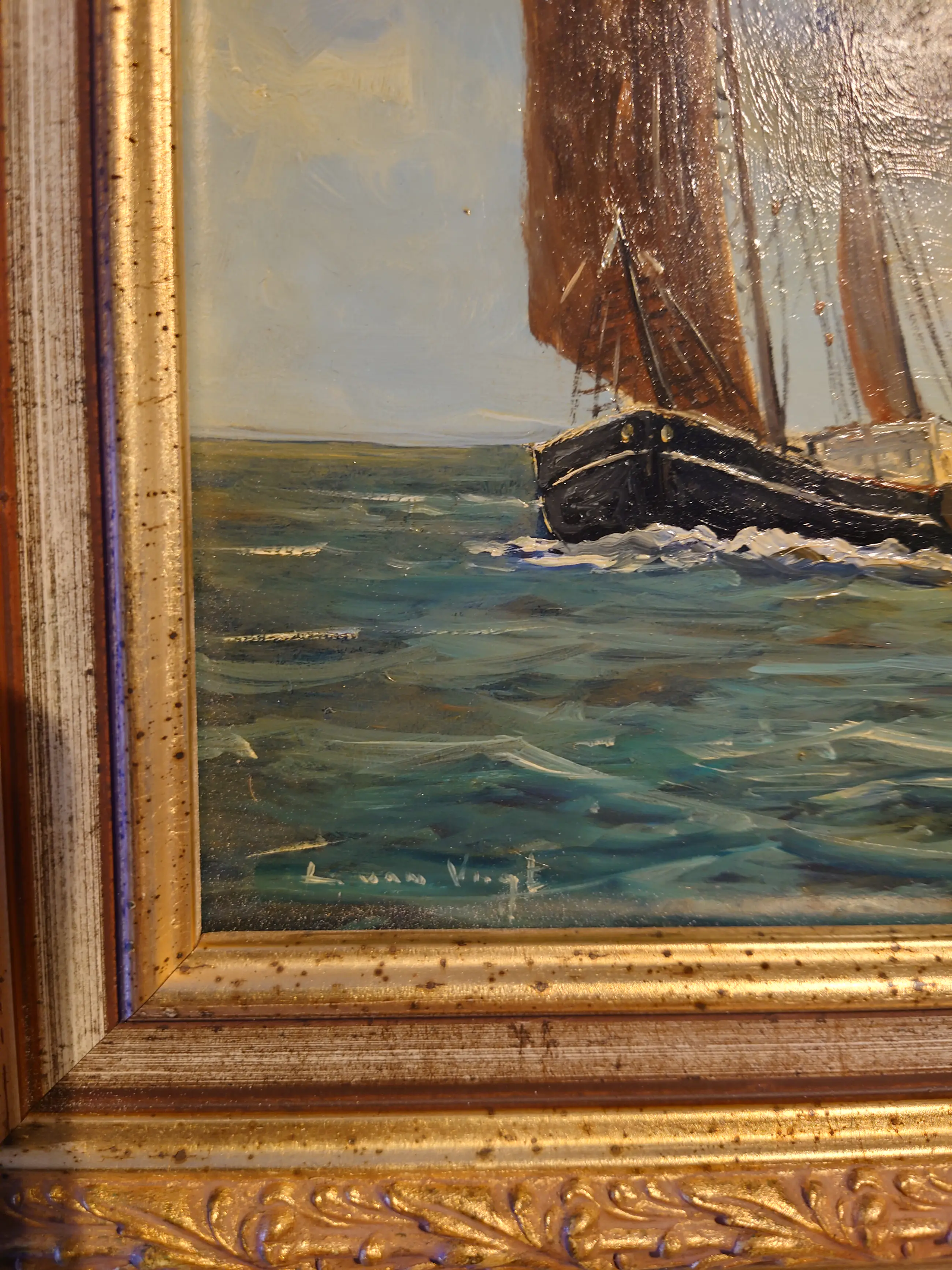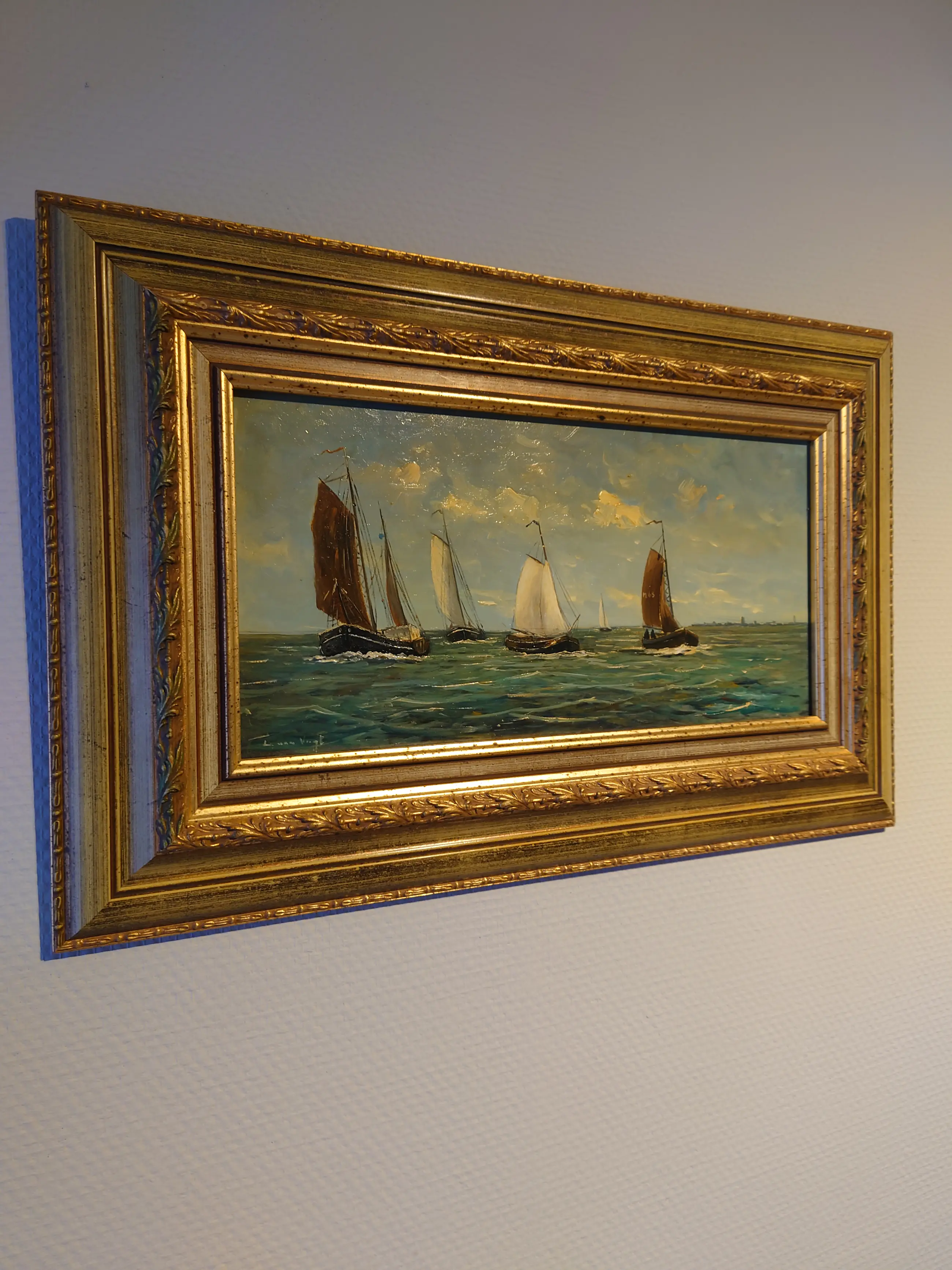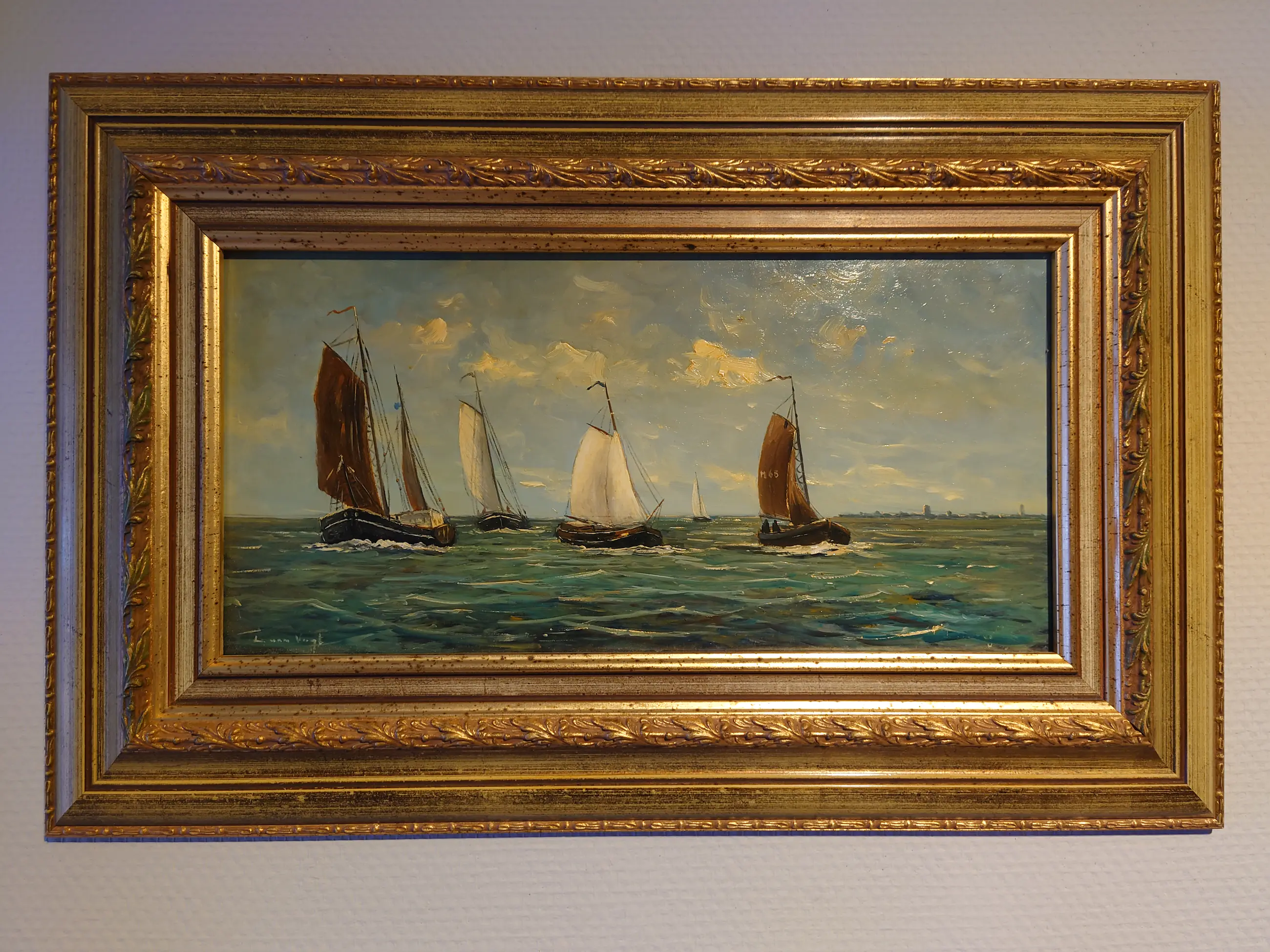 Zeil schepen , waarschijnlijk op het IJsselmeer, in zeer goede staat zowel paneel als lijst. Geschilderd door L. van Vugt.