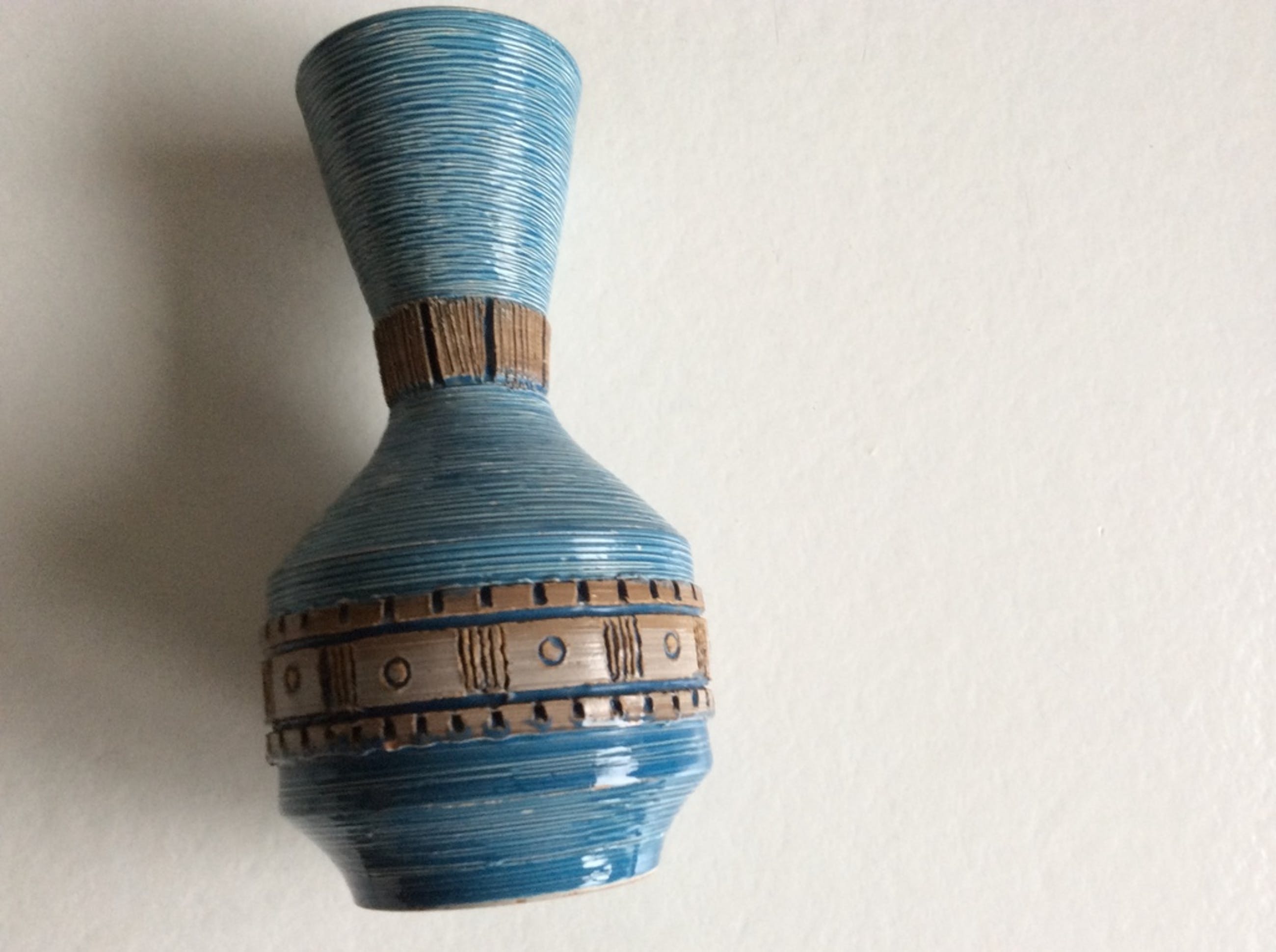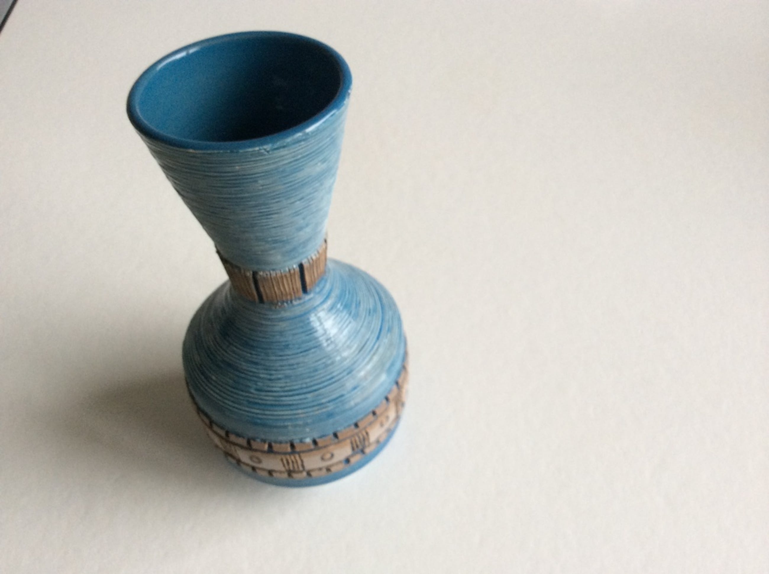 Vintage jaren '70 Ital. Sgrafitto vaas, ofwel uit de bekende keramiekstal van Bitossi danwel de Fratelli Fanciullaci. Blauw met omber sgrafitto. Hoogte: 20 cm. Doorsnede buik: 11 cm. Onderop genummerd plus vermelding Italy. Lichte gebruikssporen.