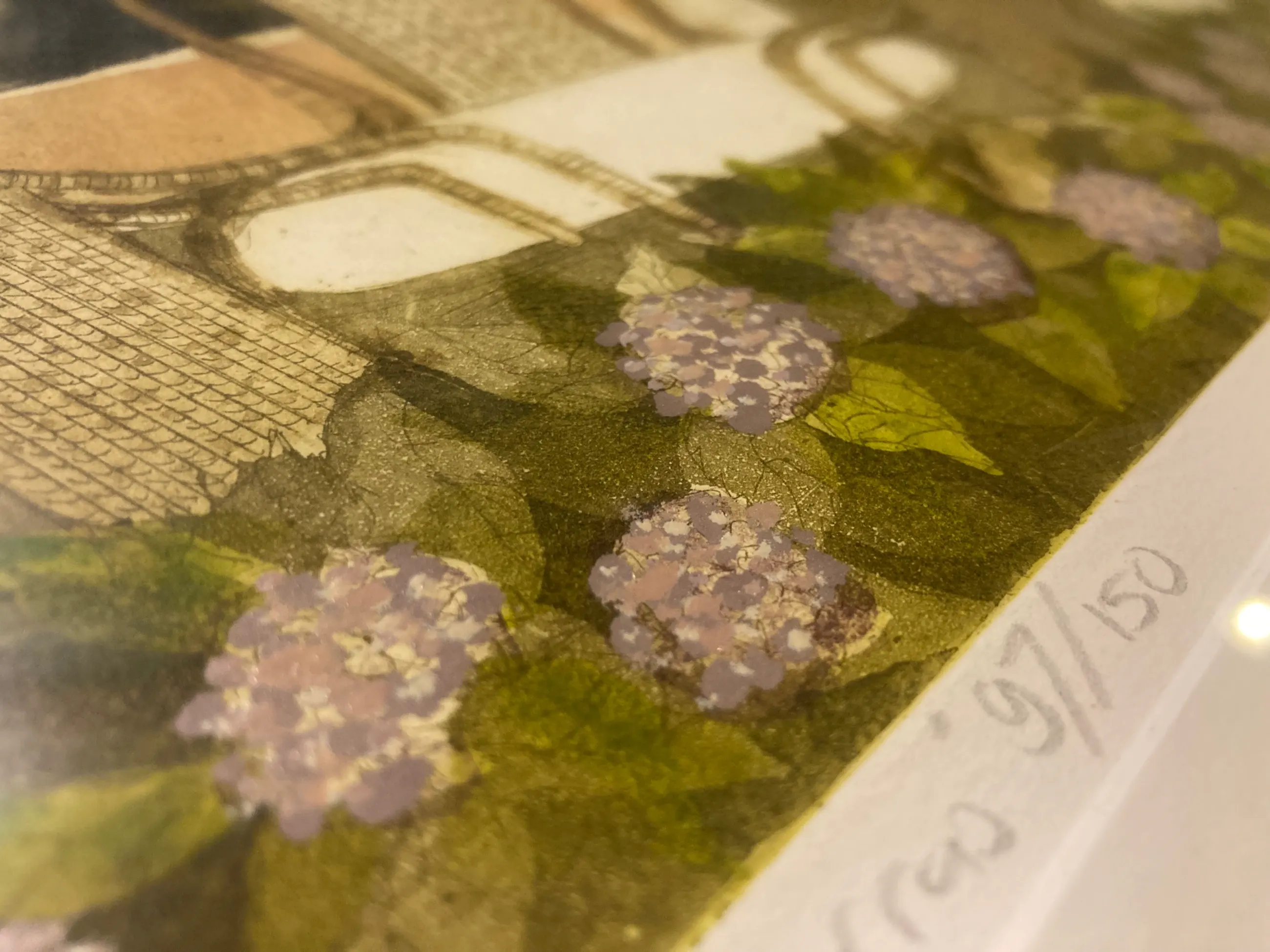 Prachtige en sfeervolle ets/aquatint van Laetitia de Haas. De hortensia's op de voorgrond lijken met de hand bewerkt te zijn.
