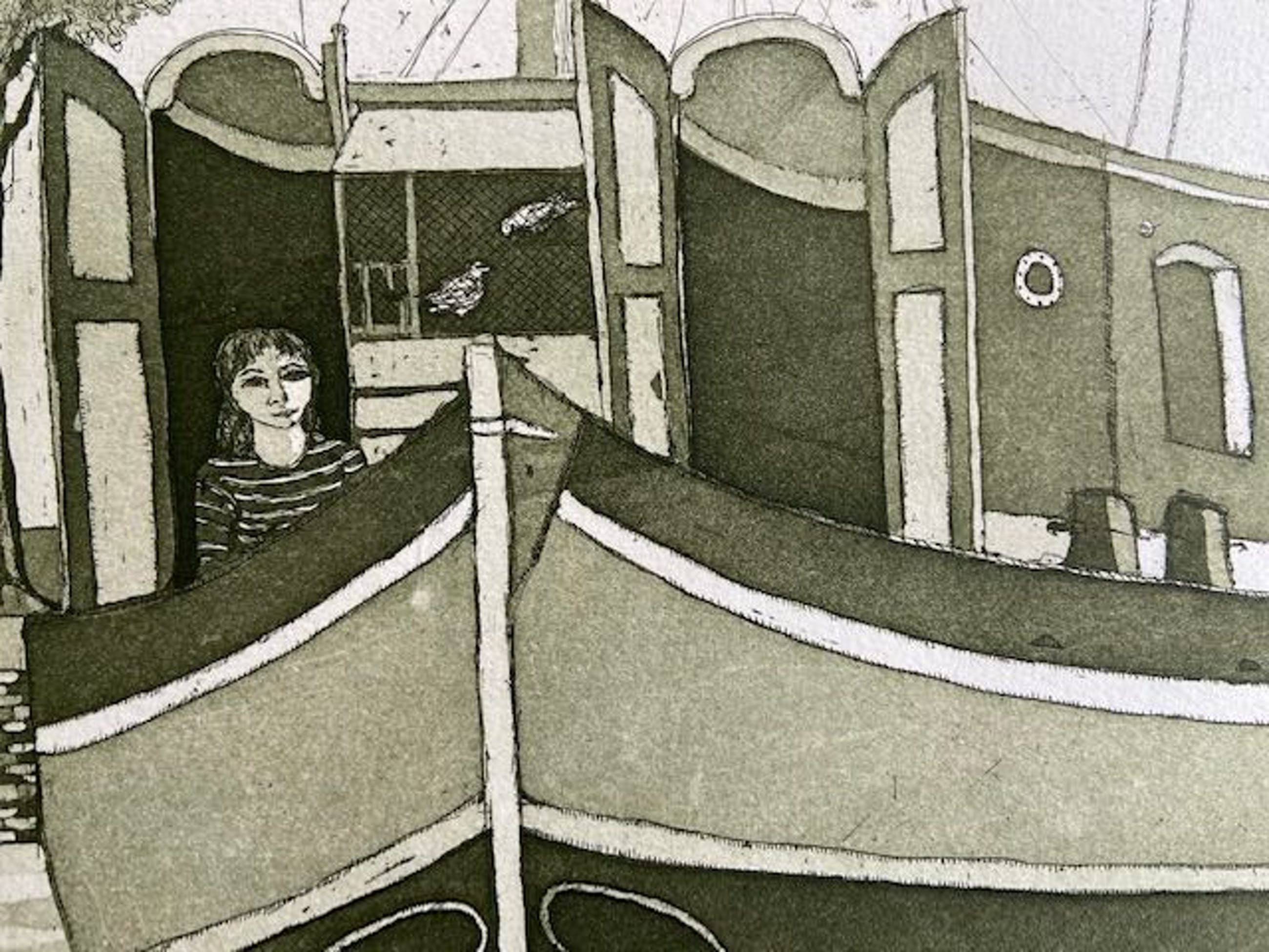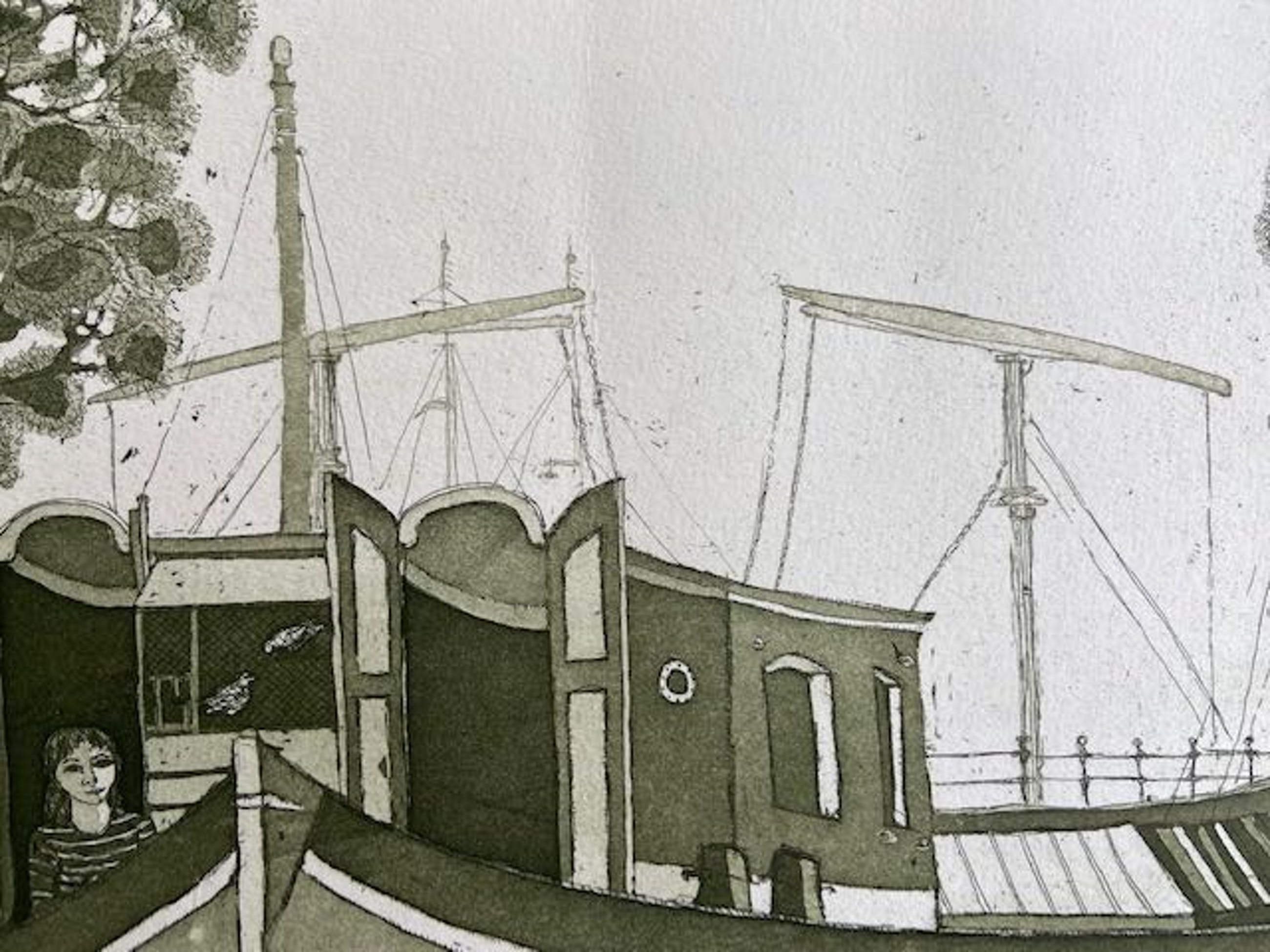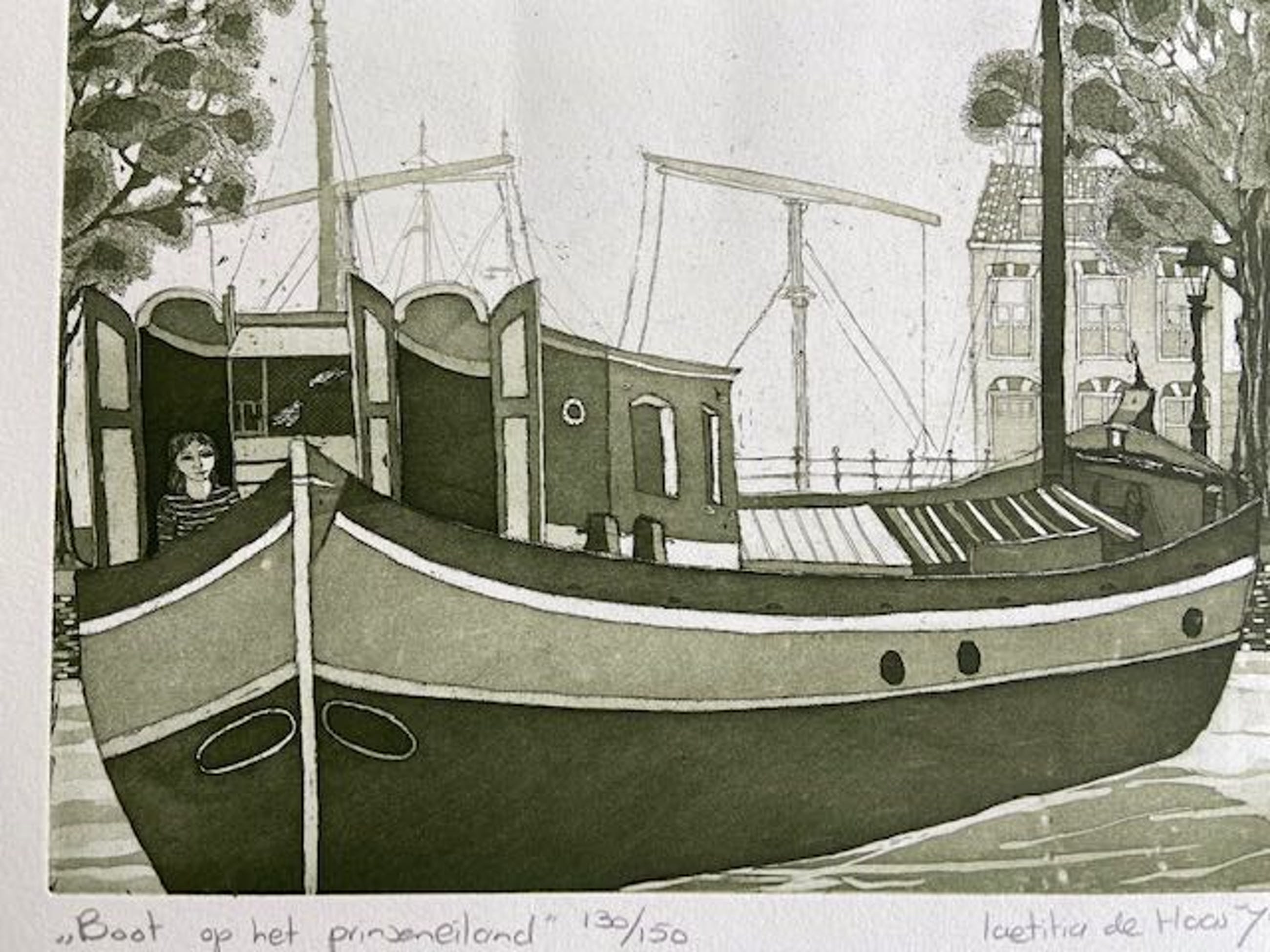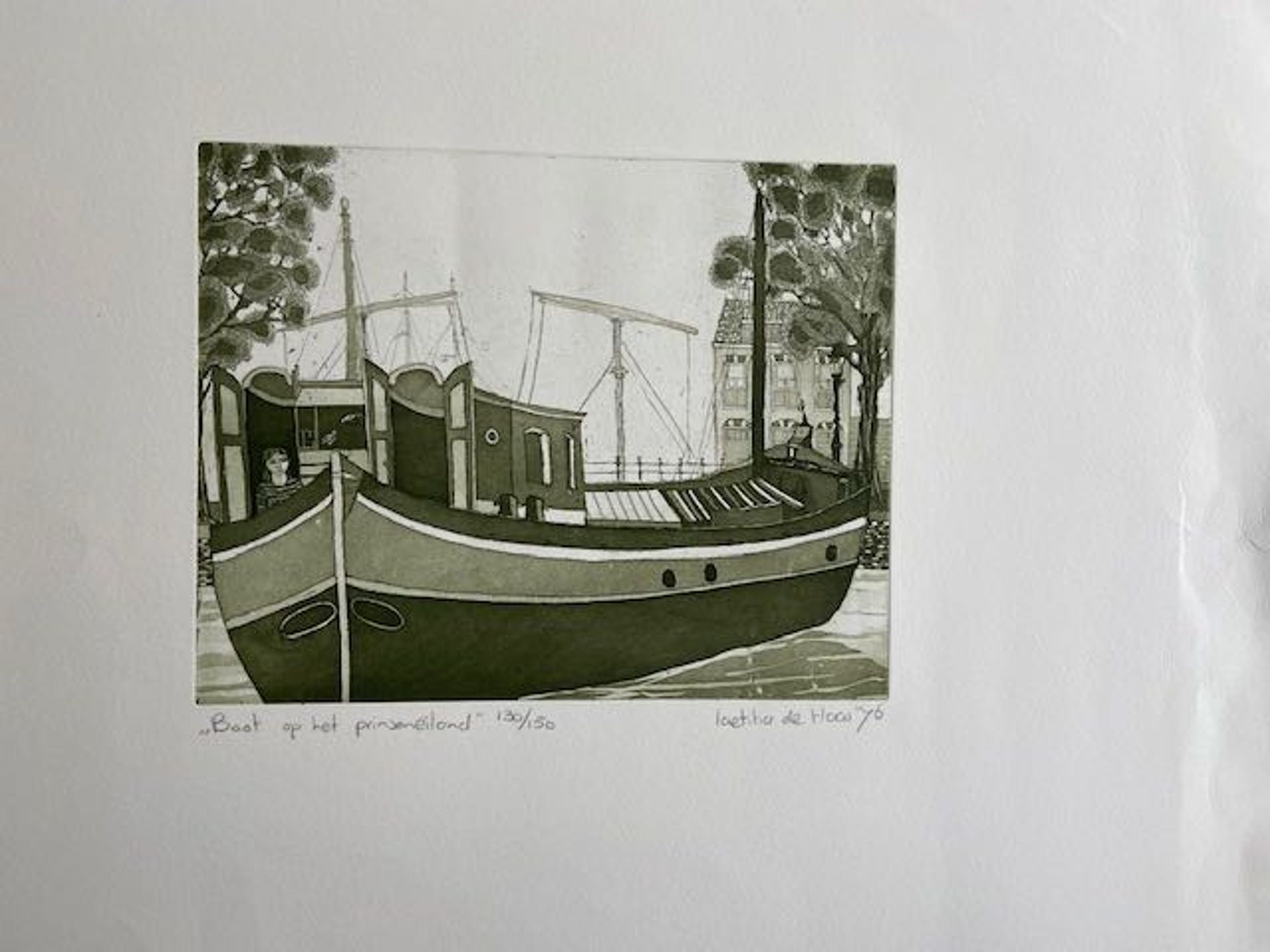 Leuke kleurenets van Laetitia de Haas, getiteld 'Boor op het Prinseneiland' met potloog gesigneerd 1976, nummer 130/150. Afmeting 65 x 50 de afbeelding is 30 x 24 cm. Het geheel is in een goede conditie na 44 jaar. Is nooit ingelijst geweest en bevond zich in eenn plastic doorzichtige hoes in een lae..