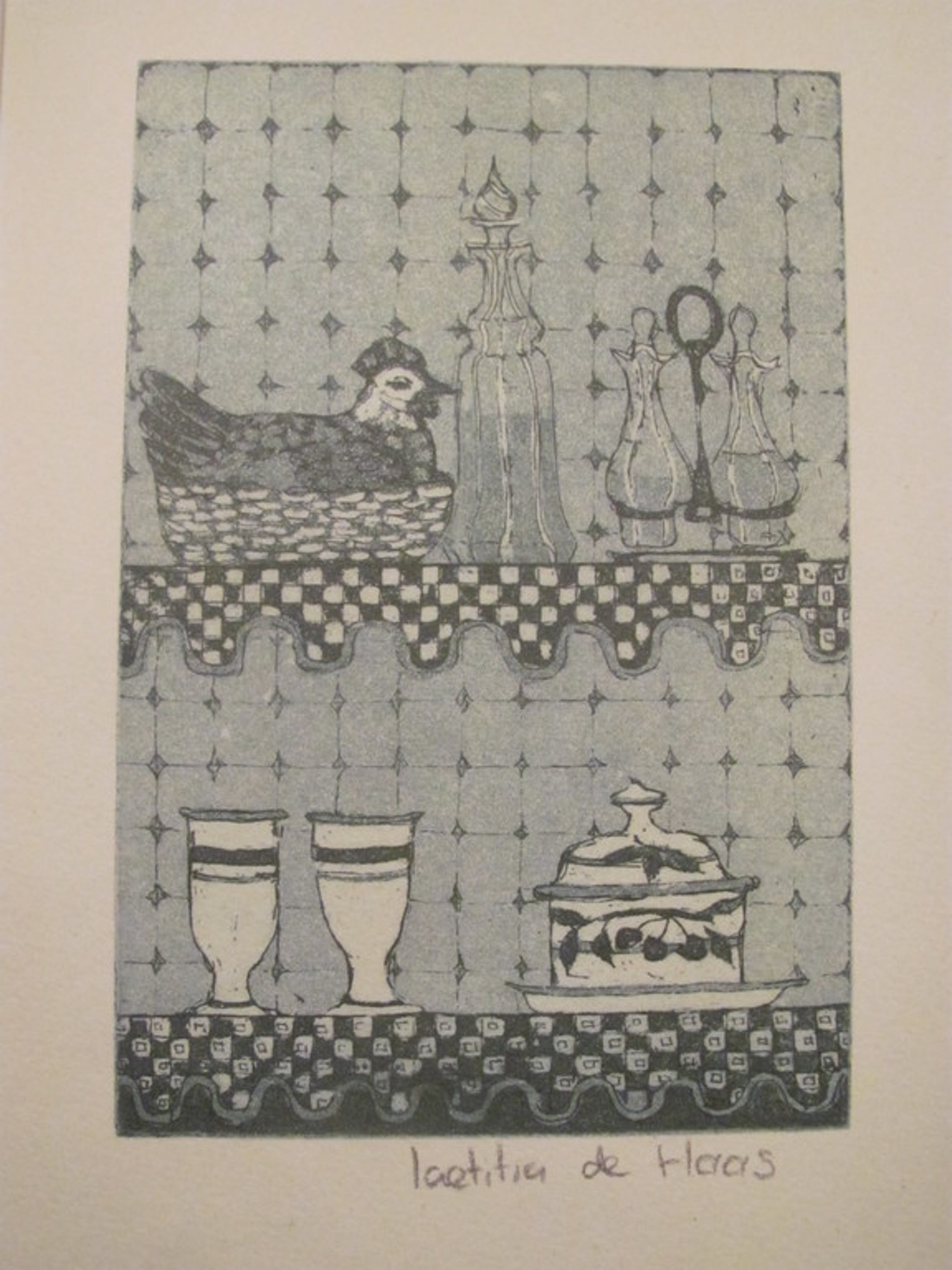 5. Keukengedoe, drukgesigneerde afbeelding. Niet genummerd of gedateerd. Afmeting ca 17 cm x 12 cm. Lijst ca 27 cm x 22 cm.