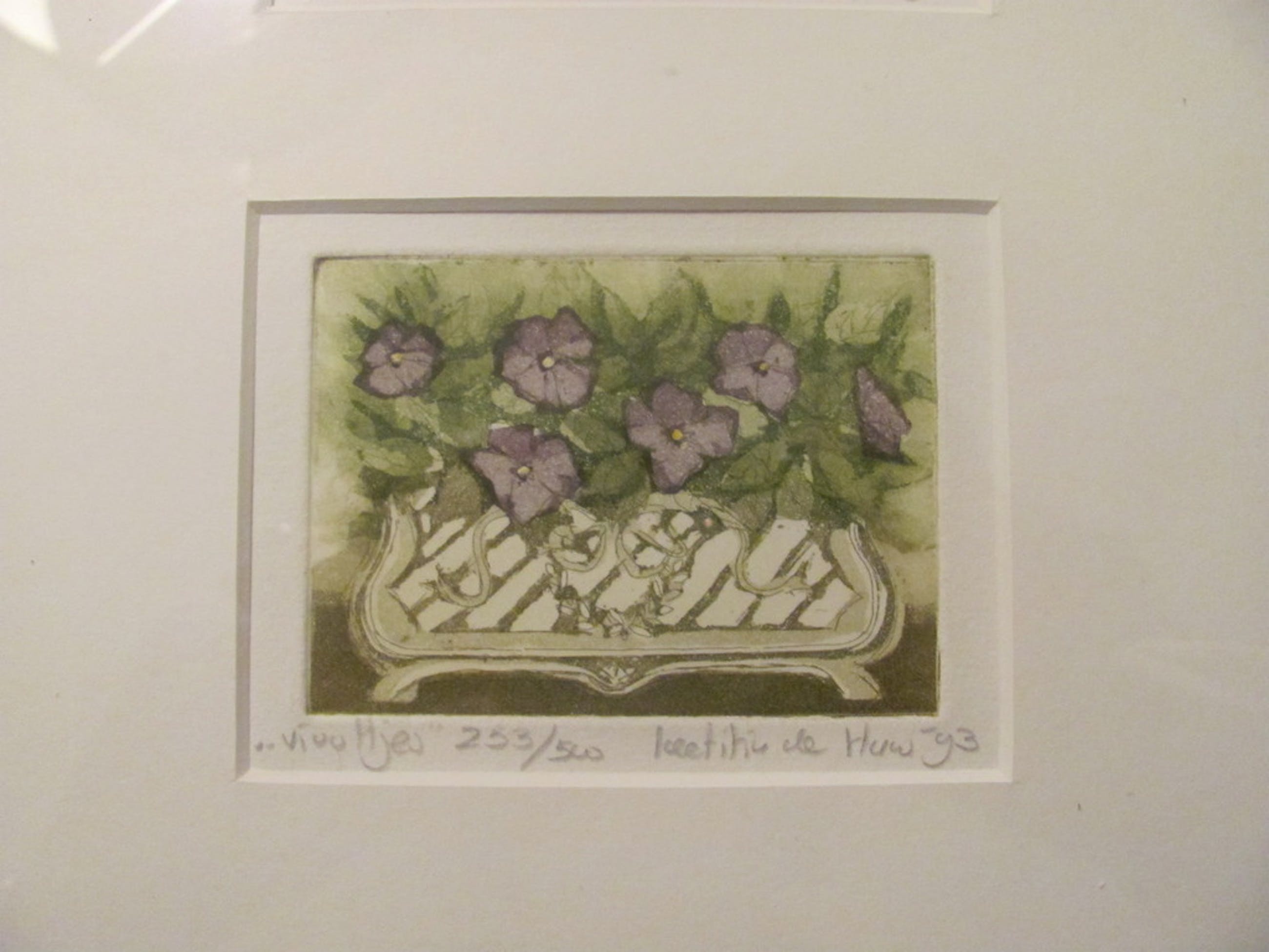 2. Viooltjes, potloodgesigneerde ets. Genummerd 253/500. Gedateerd 1993. Afmeting ca 10 cm x 7 cm. Lijst ca 40 cm x 30 cm.