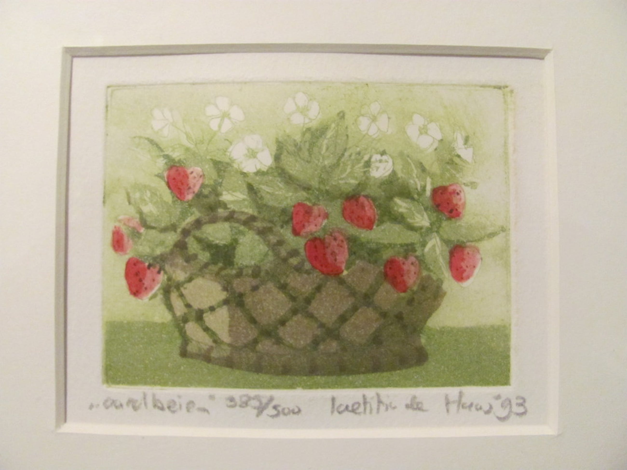 1. Aardbeien, potloodgesigneerde ets. Genummerd 385/500. Gedateerd 1993. Afmeting ca 10 cm x 7 cm. Lijst ca 40 cm x 30 cm.