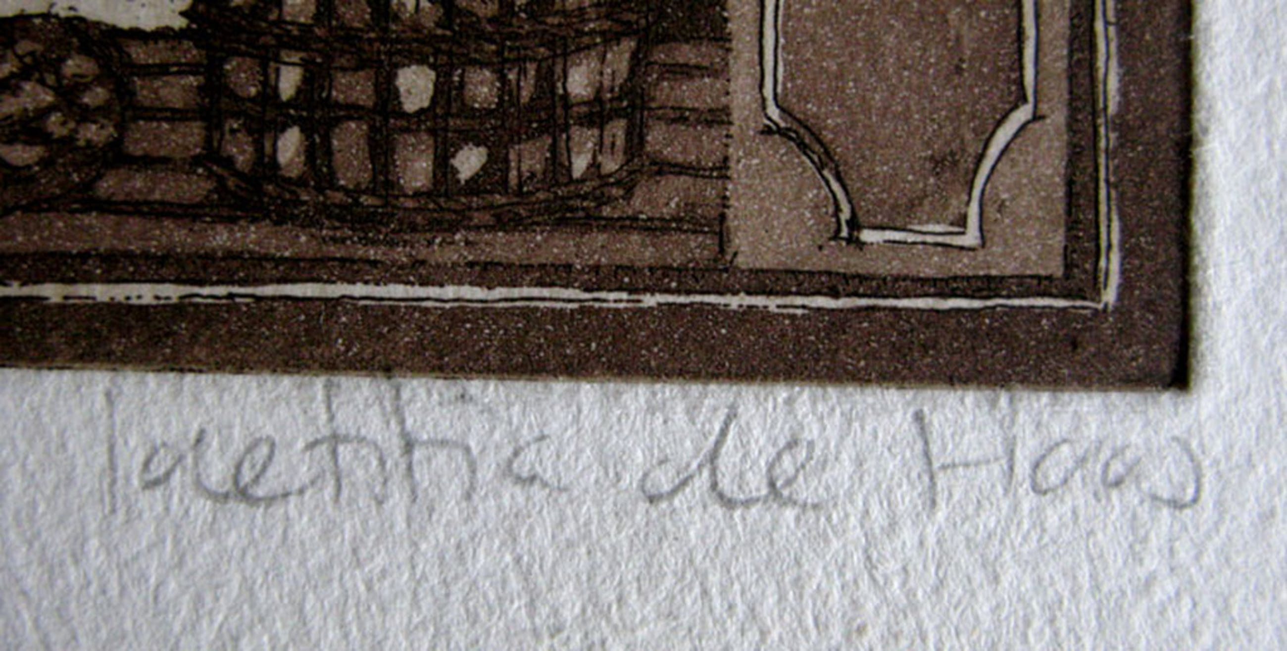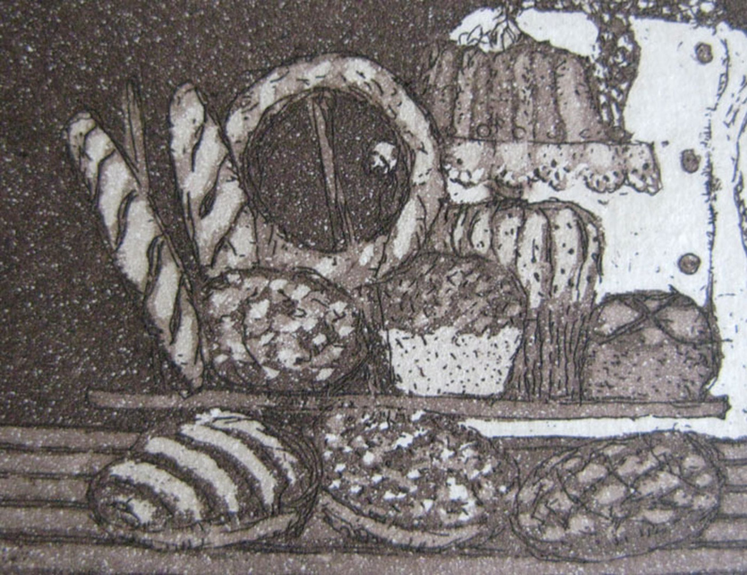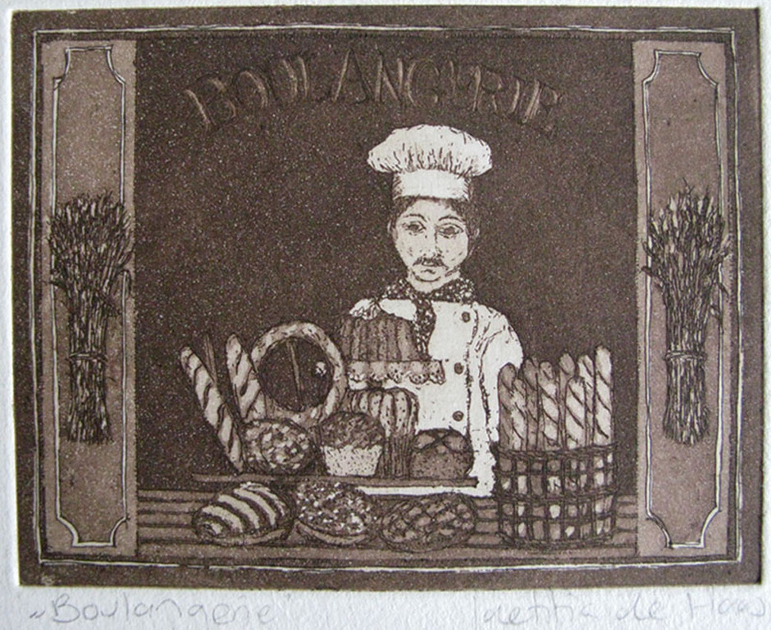 Een kleine ets van 9 x 12 op een blad van 17 x 20 waarop de Franse bakker trots zijn producten toont. De ets is rechtsonder door de kunstenaar gesigneerd en ook van titel voorzien. Volgens opgave in het boek Laetitia de Haas 'Schilderijen en Etsen' uit 1983 is dit een kleurets/aquatint uit 1978, in opdracht van SBK Hoorn gemaakt in een oplage van 100 exemplaren. Door een lichte vouw linksonder in het blad is de conditie goed te noemen. De verzending is aangetekend viaPostNL.