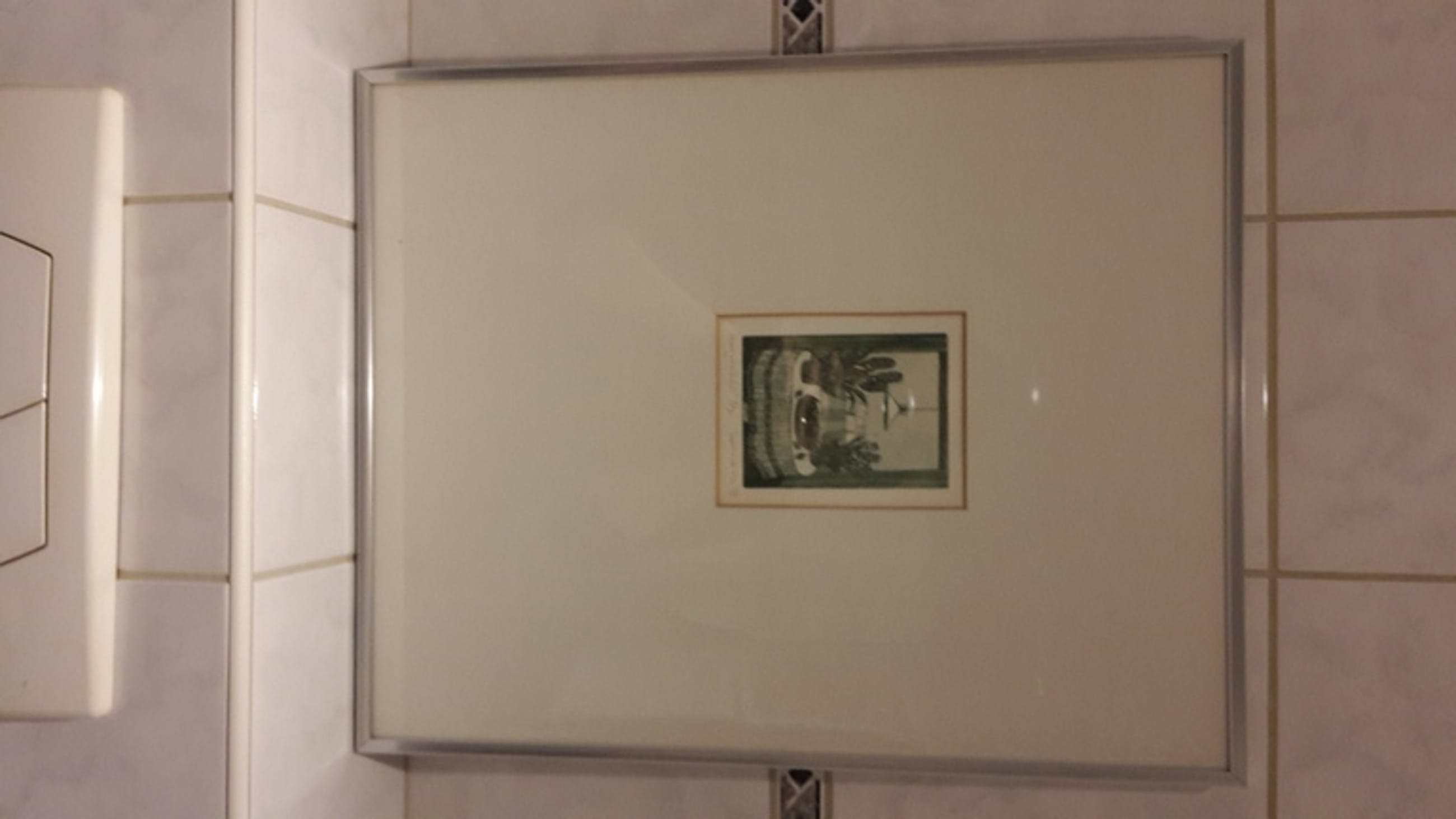 De afmeting van de ets is 11x14. De ets is ingelijst in een lijst met passe partout formaat 40x50. Het geheel is in zeer goede staat. Strakke vormgeving.