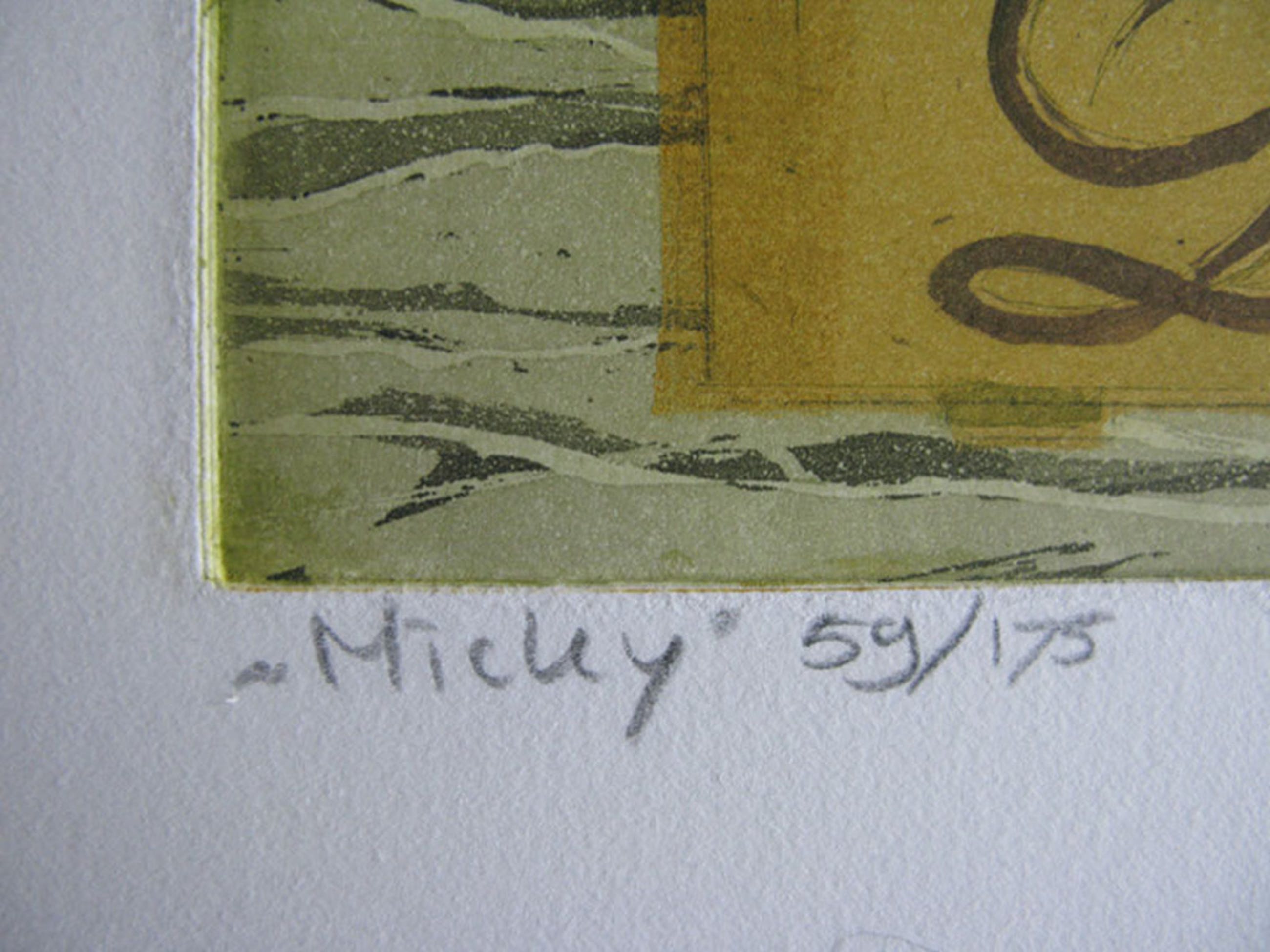 De afbeelding van Micky bij de doos met planten is 18 x 24. Het gehele blad meet 25 x 35. Het blad is aan de onderzijde niet geheel recht afgesneden. Dit valt weg door de ets in een passe-partout te plaatsen. De ets is door de kunstenaar van titel, oplage 59/175 en handtekening voorzien. Er is geen jaartal bekend. Het werk wordt aangetekend verstuurd via PostNL voor € 10 binnen Nederland. Deze kosten zijn voor rekening van de koper.