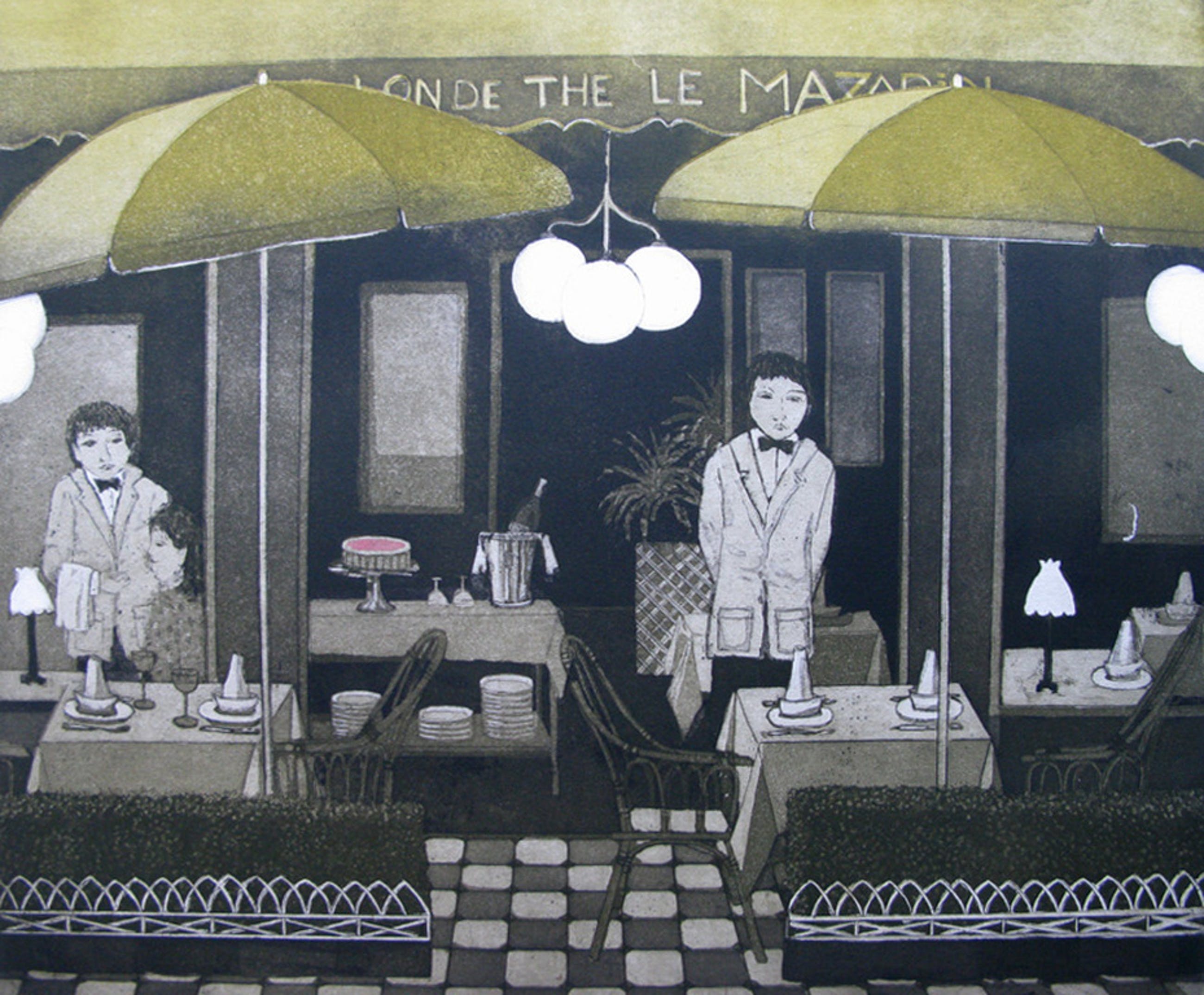 Deze grote kleurets van Laetitia de Haas meet 51 x 63 (blad) en 39 x 50 (afbeelding). De ets is door de kunstenaar gesigneerd en van titel voorzien. De oplage is 69/90 en er is geen jaartal vermeld.