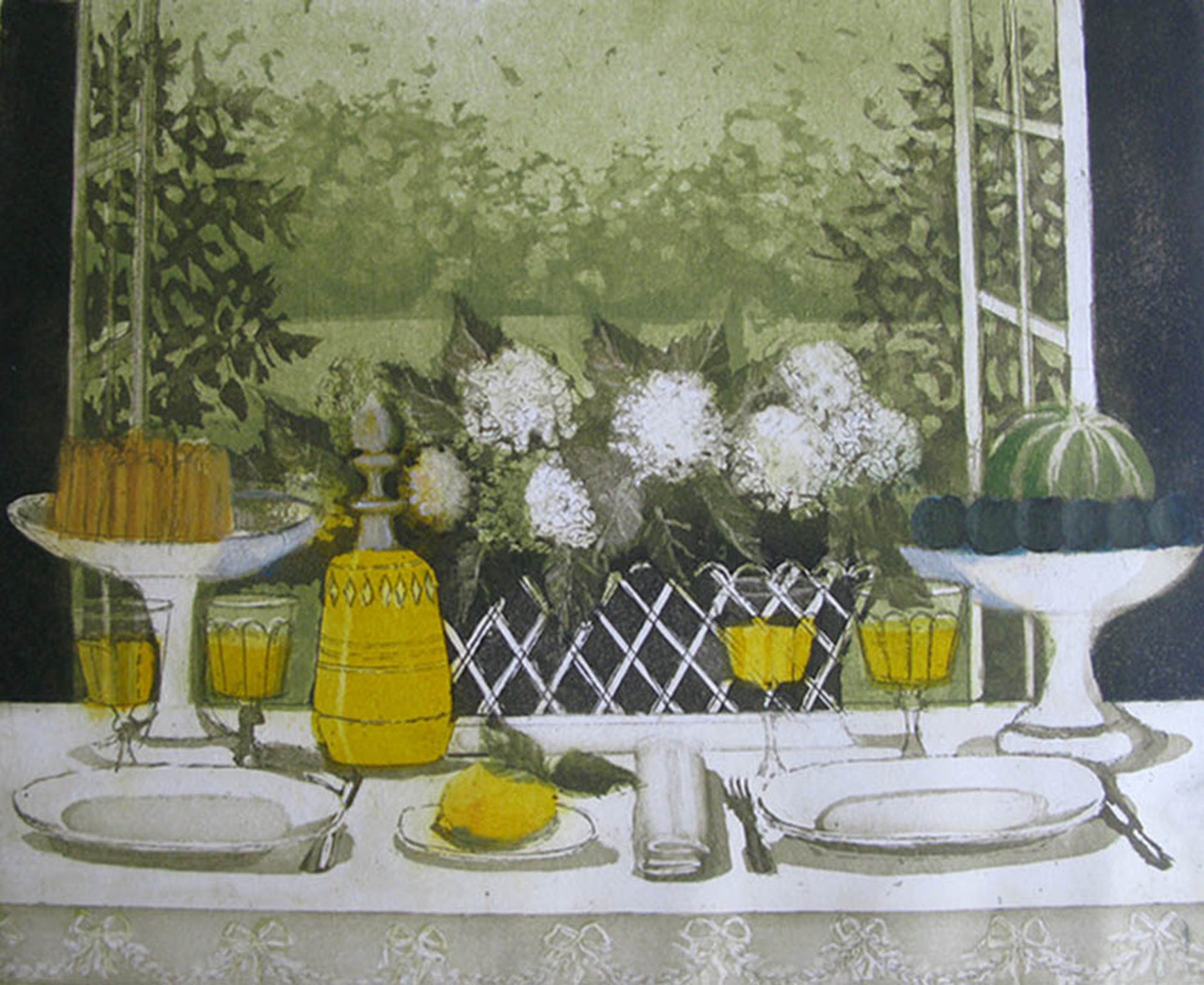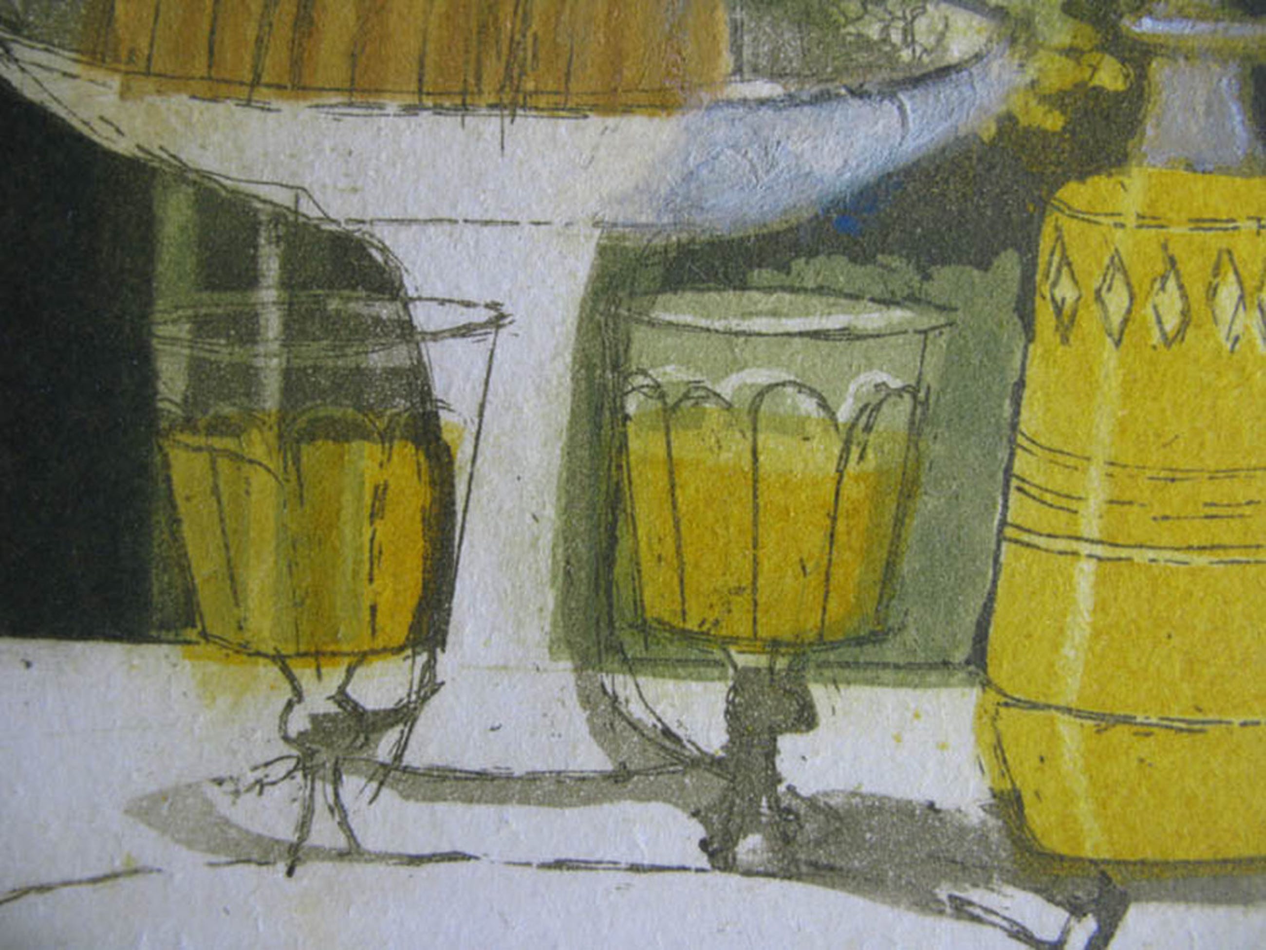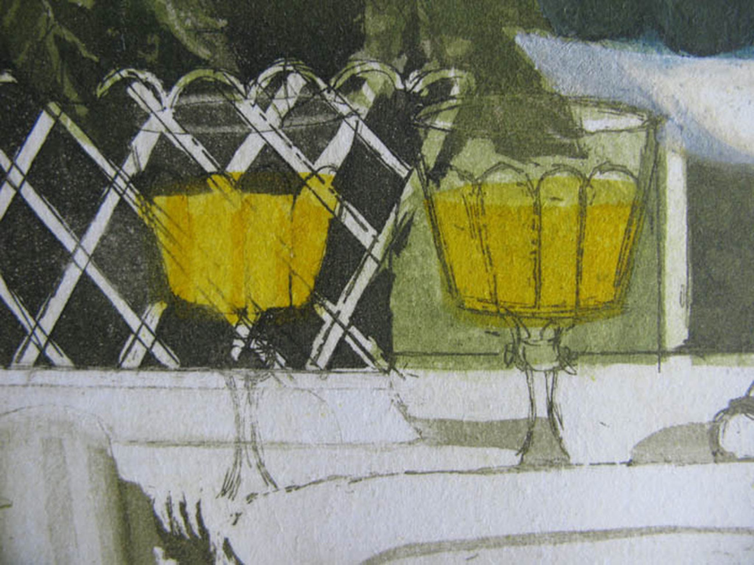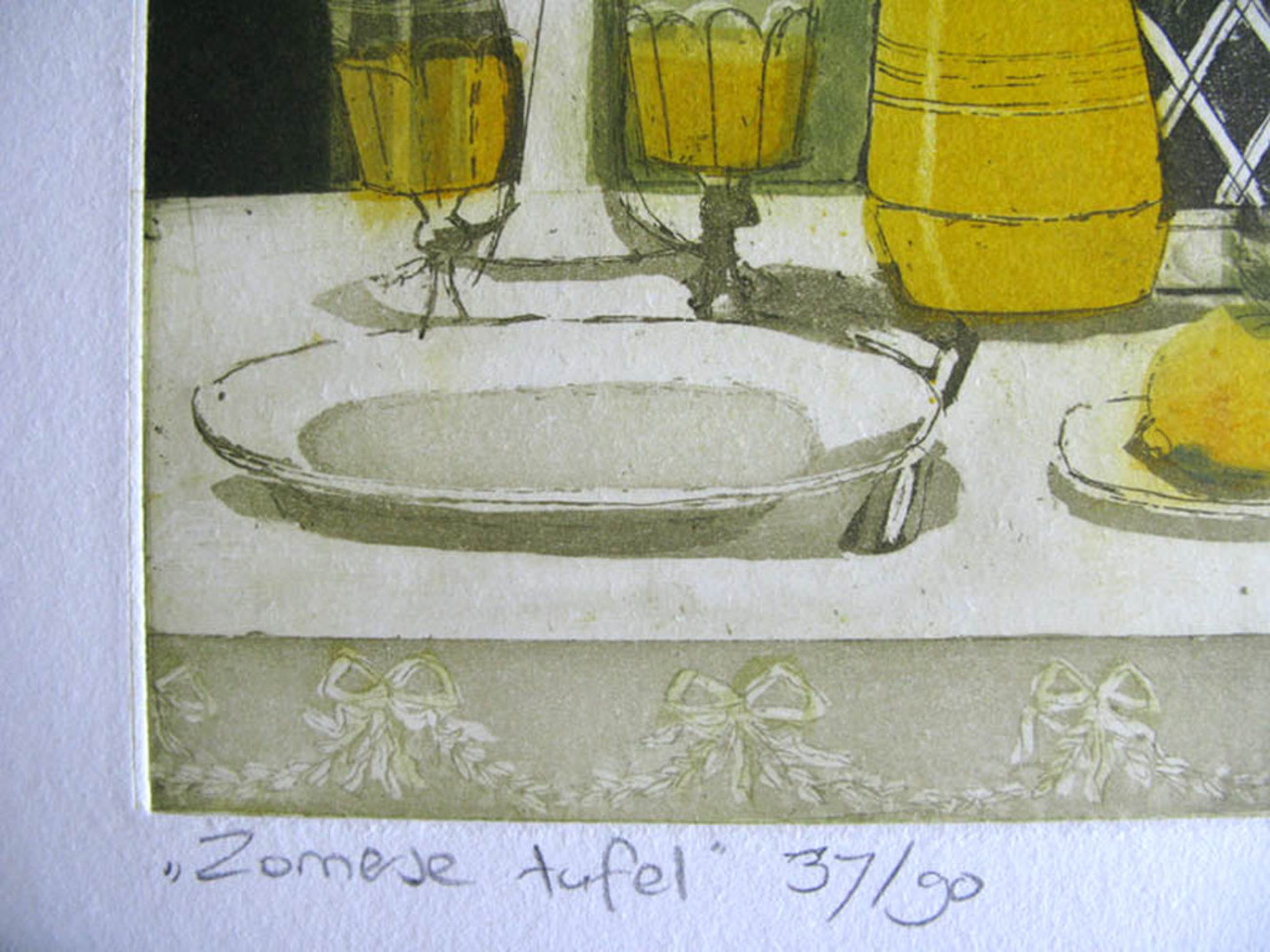 De afmeting van de afbeelding van de kleurets ZOMERSE TAFEL is 24 x 30 en het gehele blad meet 35 x 50. De kleurets is door de kunstenaar gesigneerd en van titel en oplage 37/90 voorzien, het jaartal is 2002. Helaas is in de kleurets een vouw ontstaan, maar de vouw valt samen met de middenstijl van het rechtervenster en is daardoor nauwelijks zichtbaar, de conditie is daarom goed te noemen. De kleurets wordt zonder lijst aangeboden en de garantieregeling van Kunstveiling is op dit aanbod van toepassing. De verzending is aangetekend via PostNL.