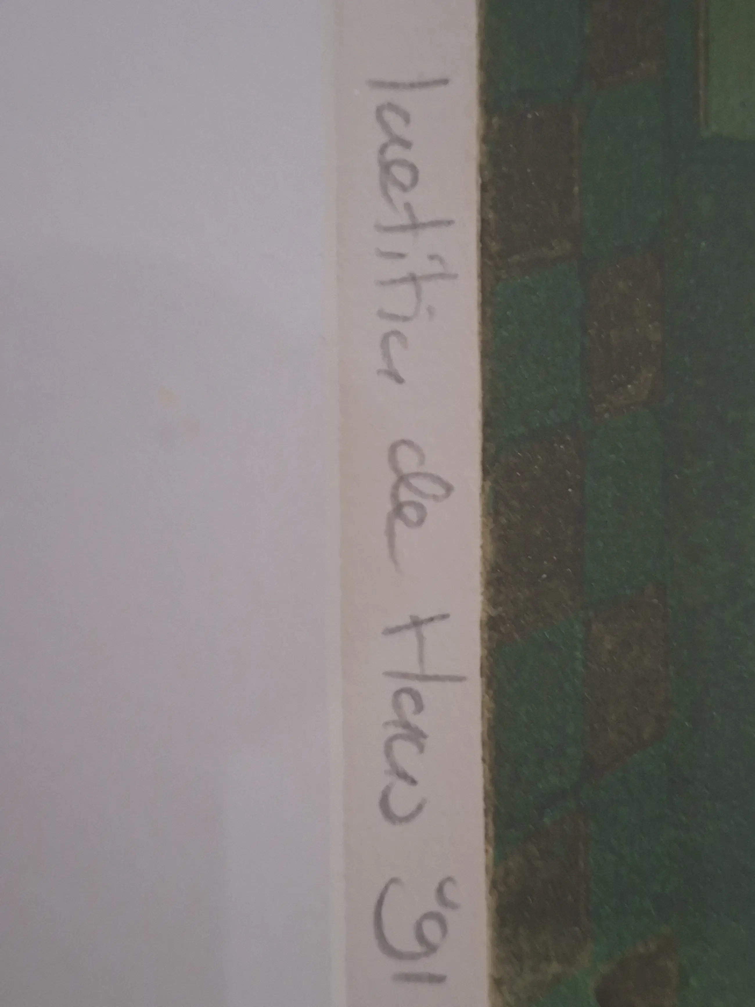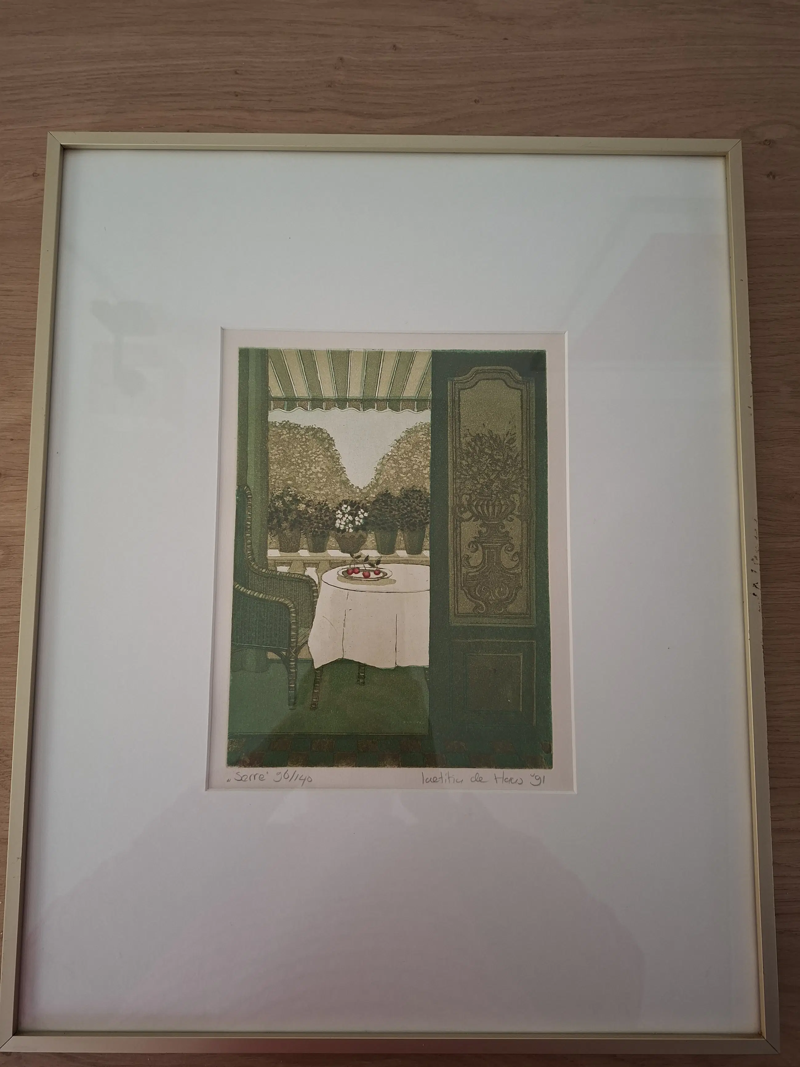 Gekocht bij galerie de ploegh in museum Flehite in Amersfoort. Jaren bij mijn ouders aan de muur gehangen. Een tafereel vanuit een kamer zie je de serre en een stukje van de bosjes in de tuin met voornamelijk groentinten.