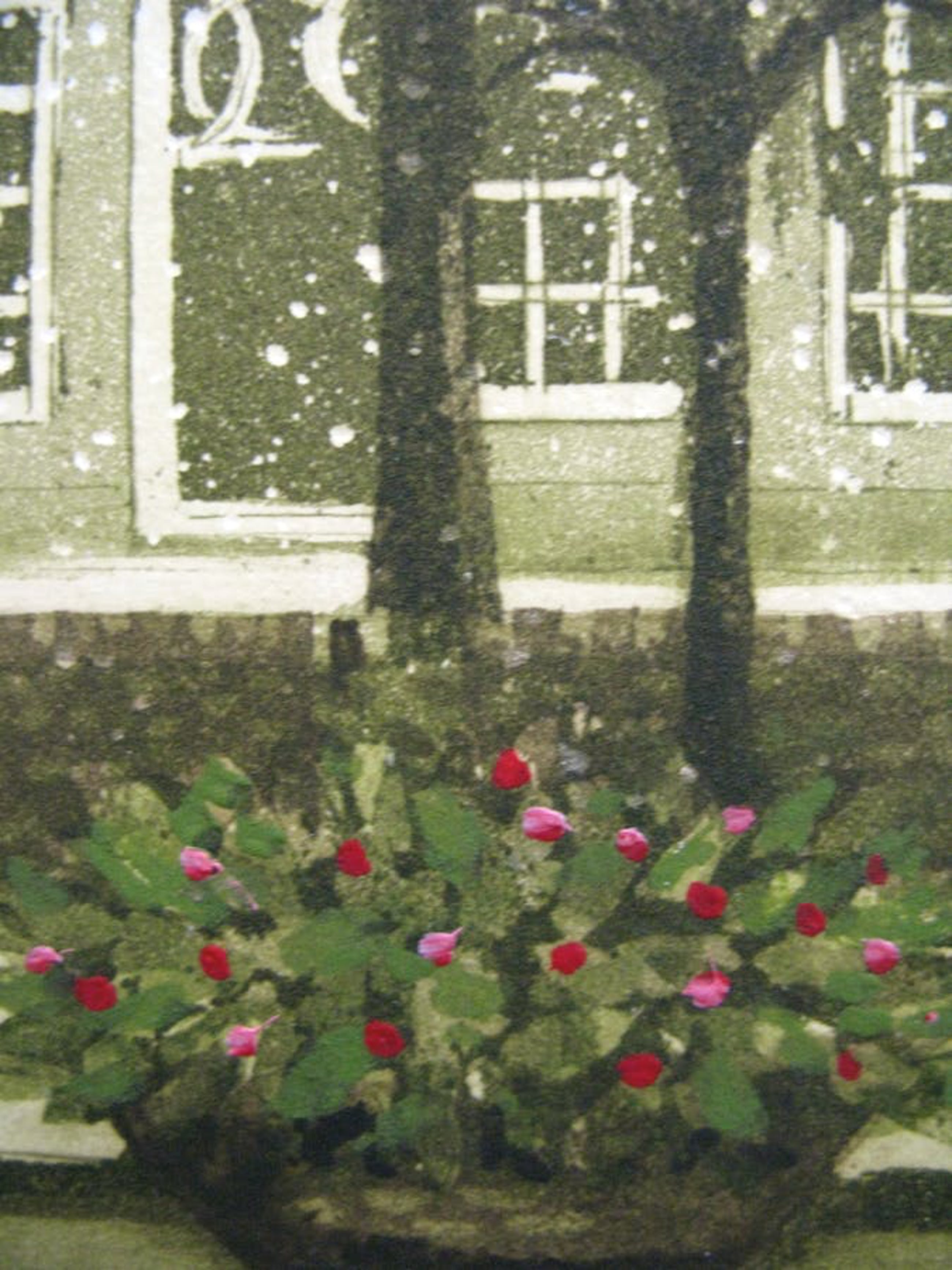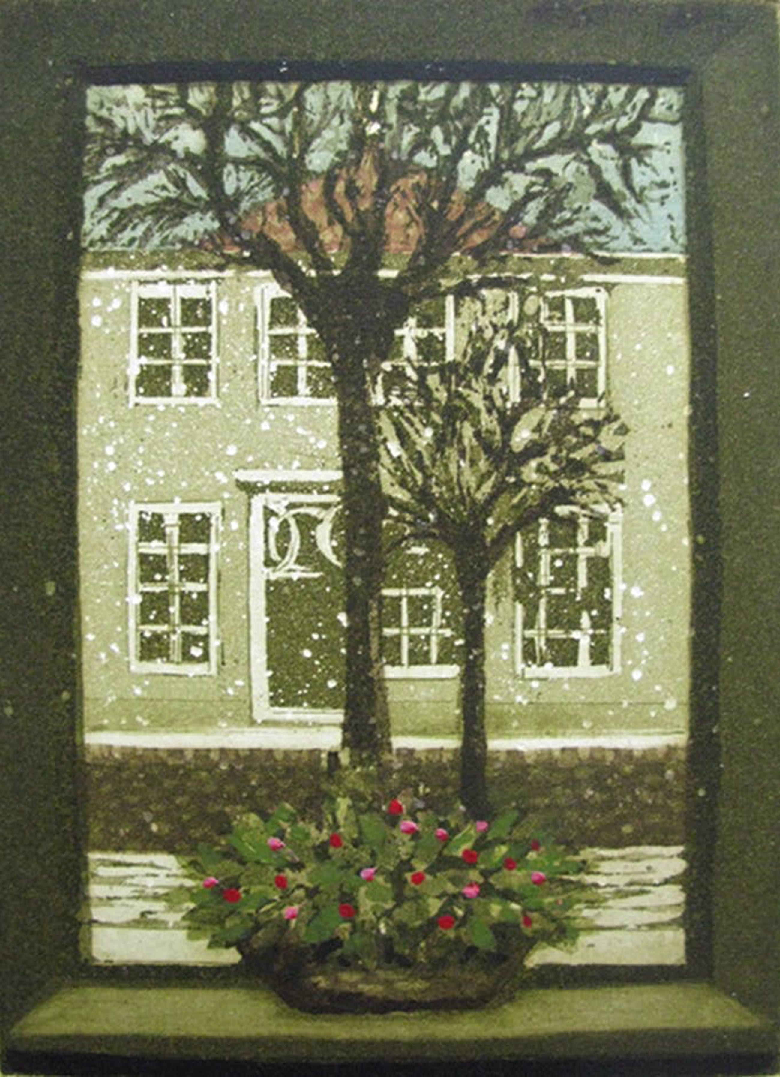 Het sneeuwt op deze kleurets en de blik is naar buiten ? Waar is dit ? Amersfoort misschien ?