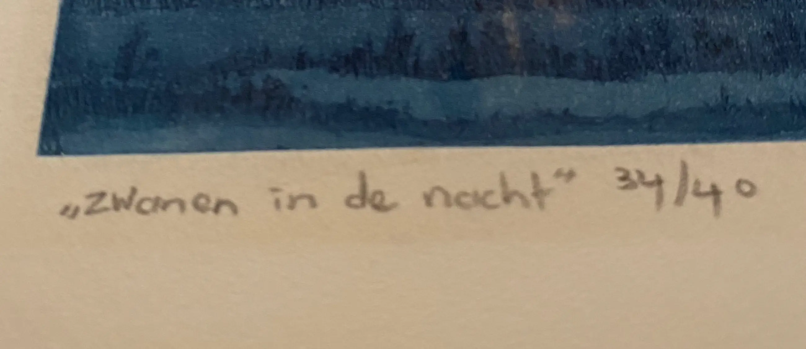 Werk van Laetitia de Haas, 'Zwanen in de nacht'. Zeefdruk uit 1974. Genummerd en gesigneerd in potlood. Werk is ingelijst in houten frame.