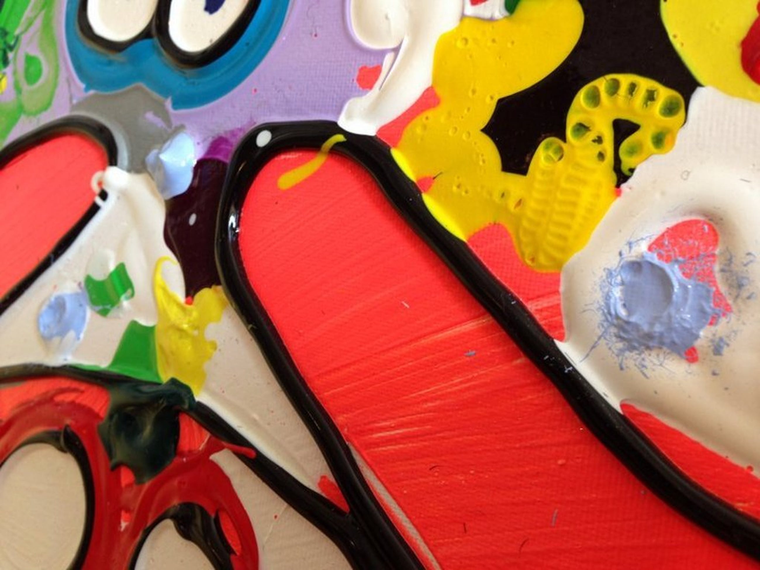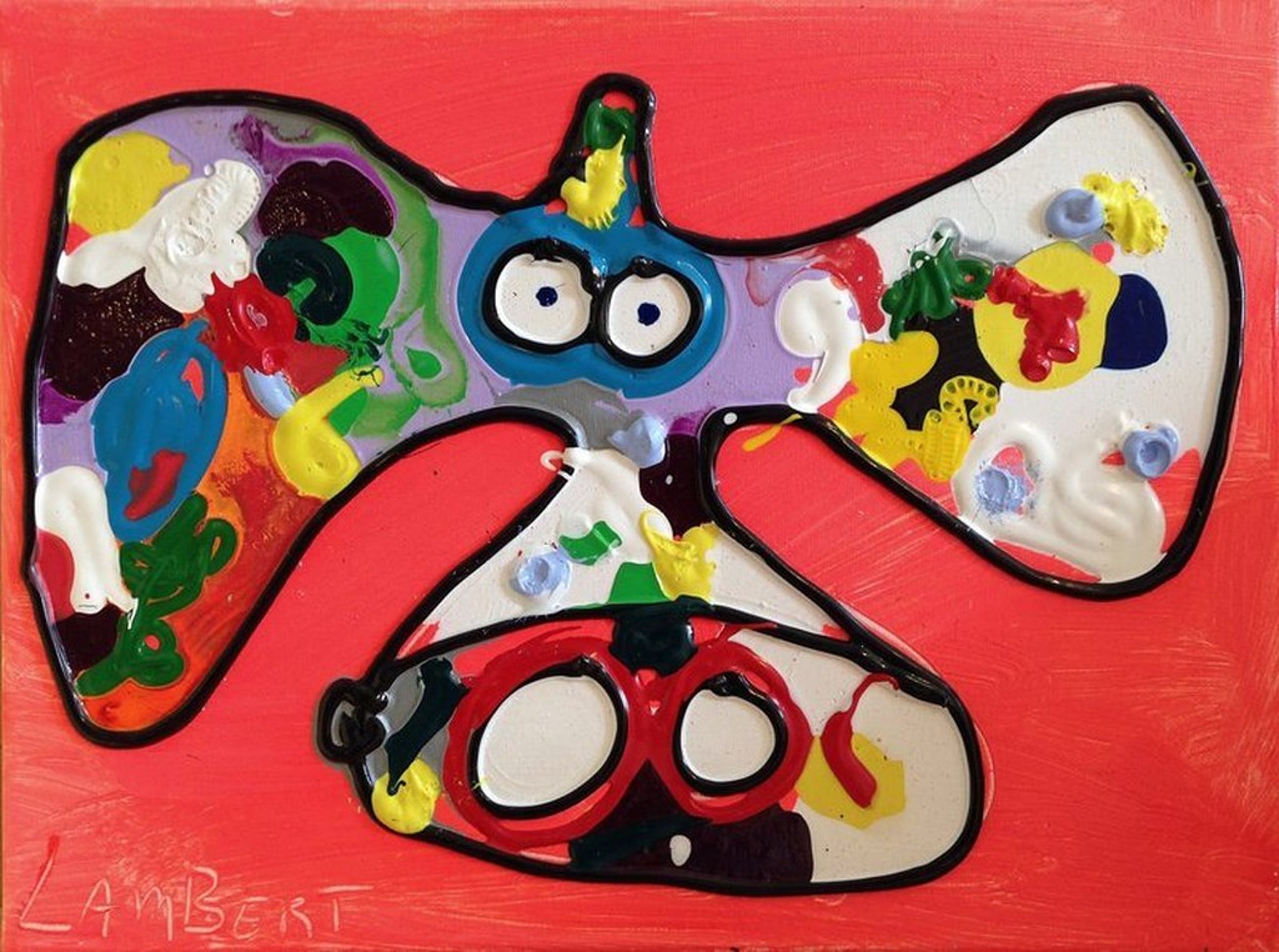 Origineel schilderij op doek (acryl), afmetingen 40x30 cm met als titel 'Vliegende Hollander'. Zeer kleurrijk en pasteus van opzet, gesigneerd linksonder en op achterzijde.