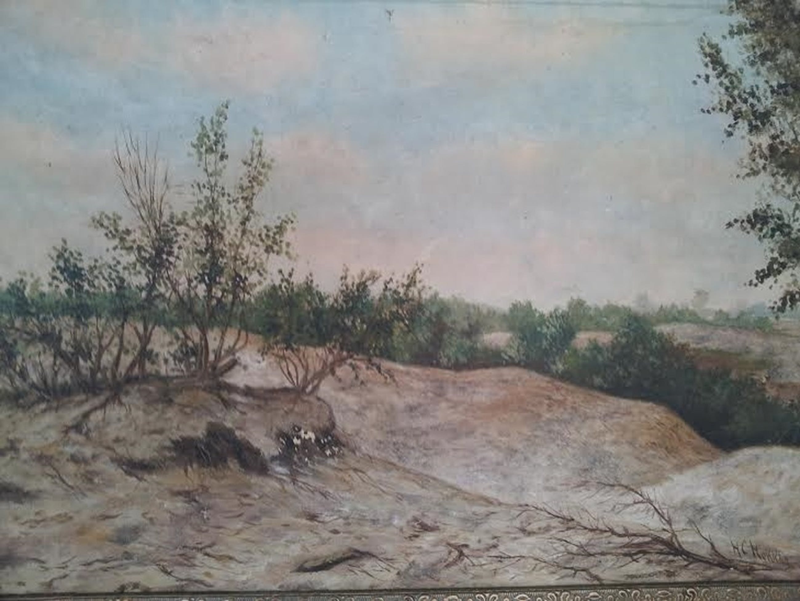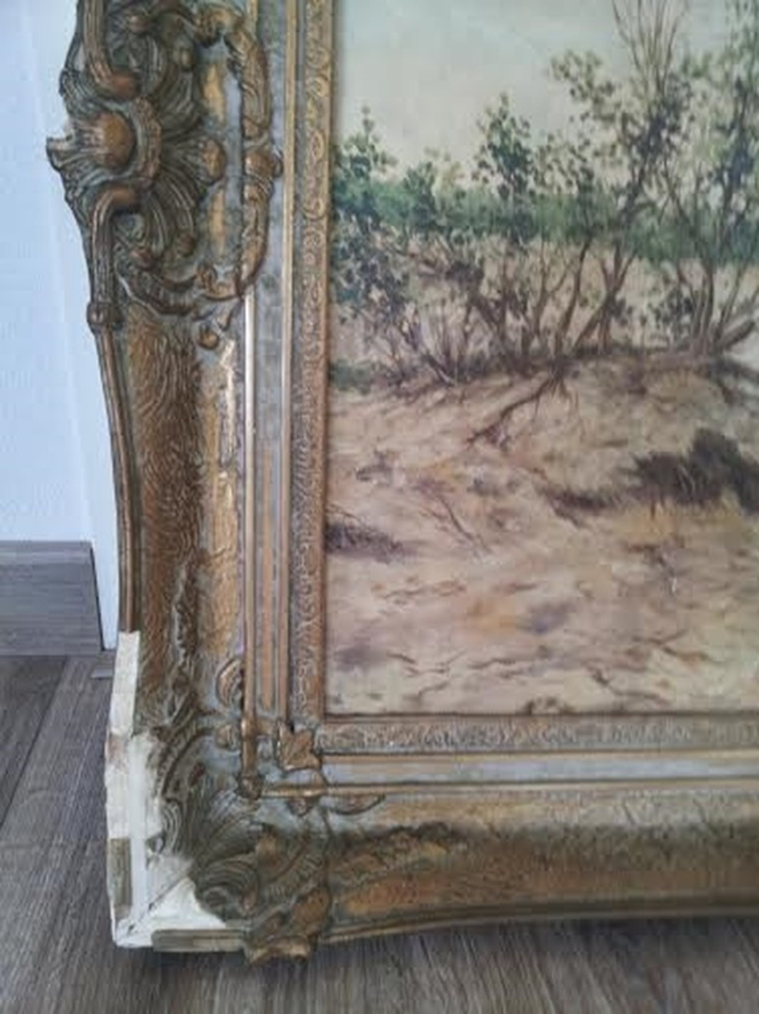 Zoals u kunt zien is de voorstelling mooi, maar behoeft ook enige aandacht o.a. mbt schoonmaak. Daarnaast een klein scheurtje van 1 cm in het doek en op 1 plekje lichte verfafbladering. De lijst heeft beschadigingen, maar wordt gewoon meegeleverd (indien gewenst)