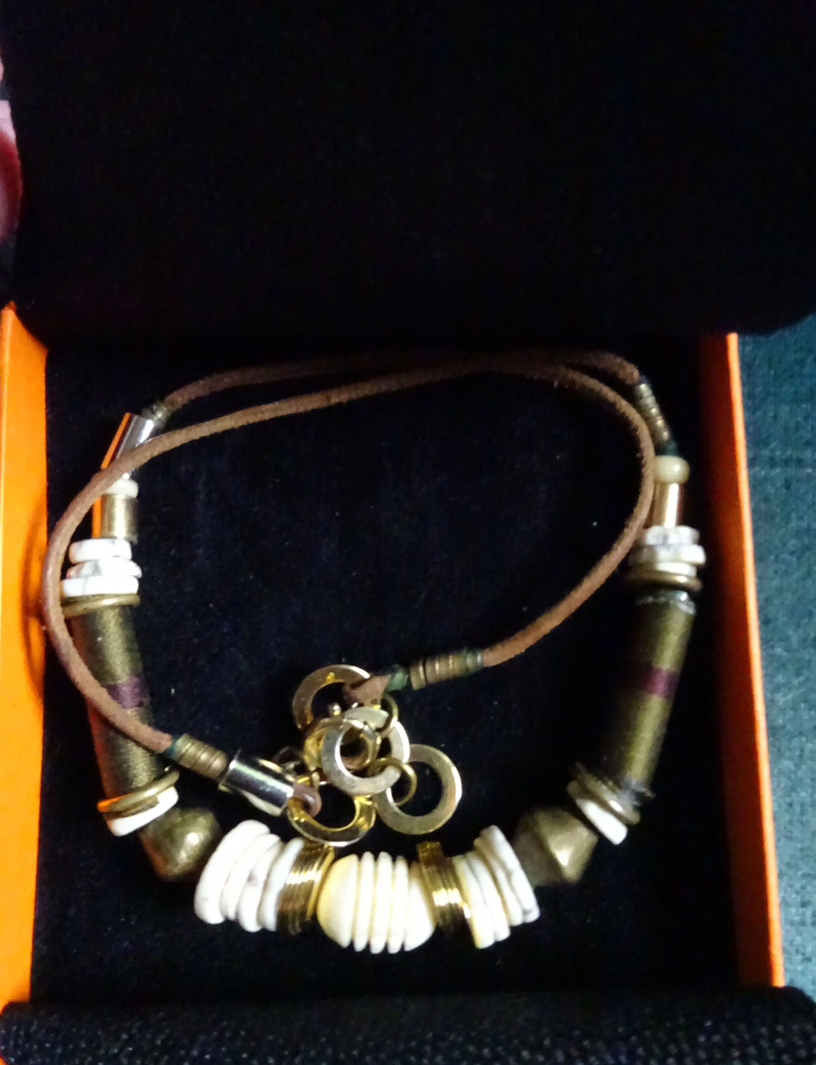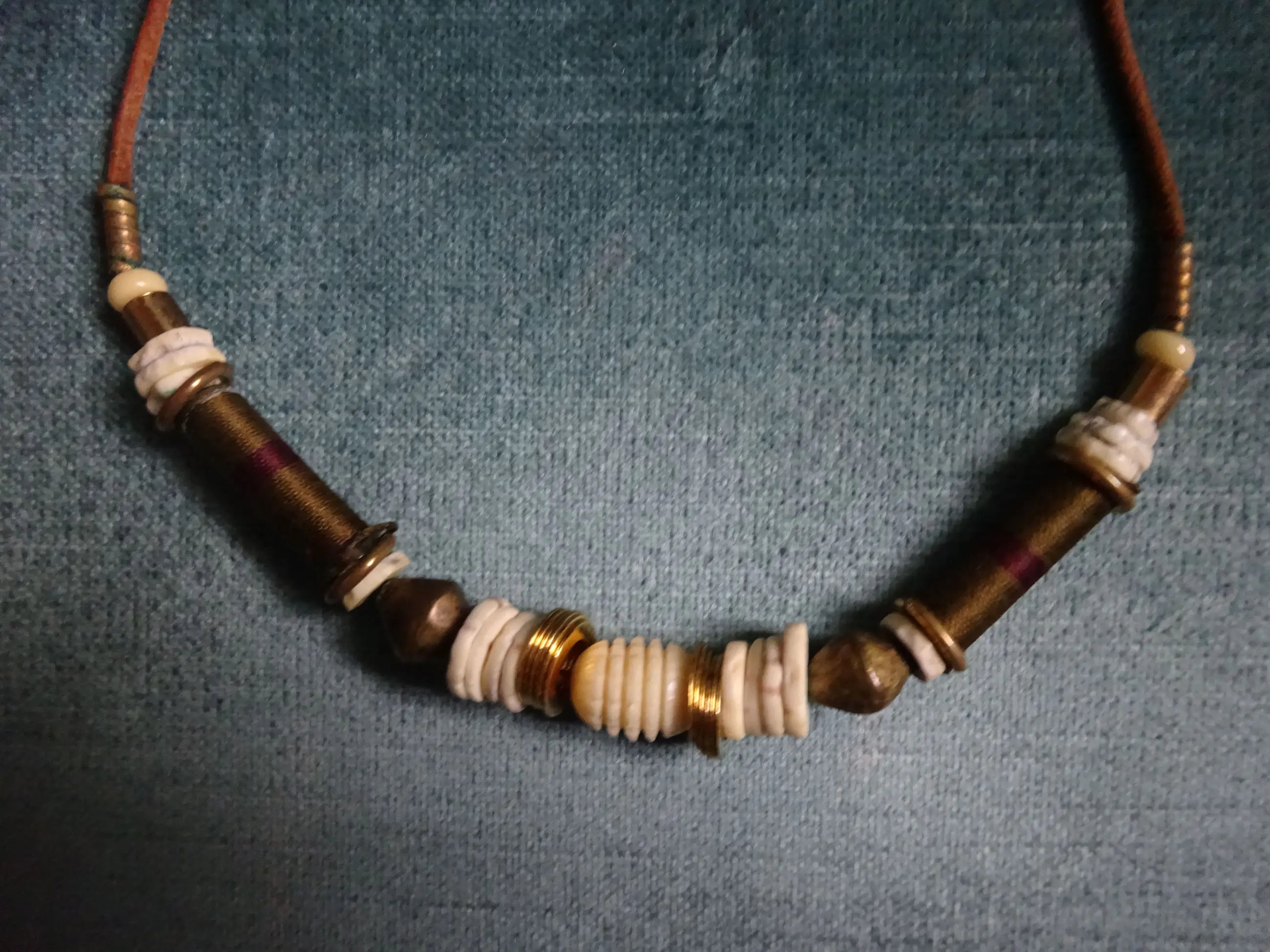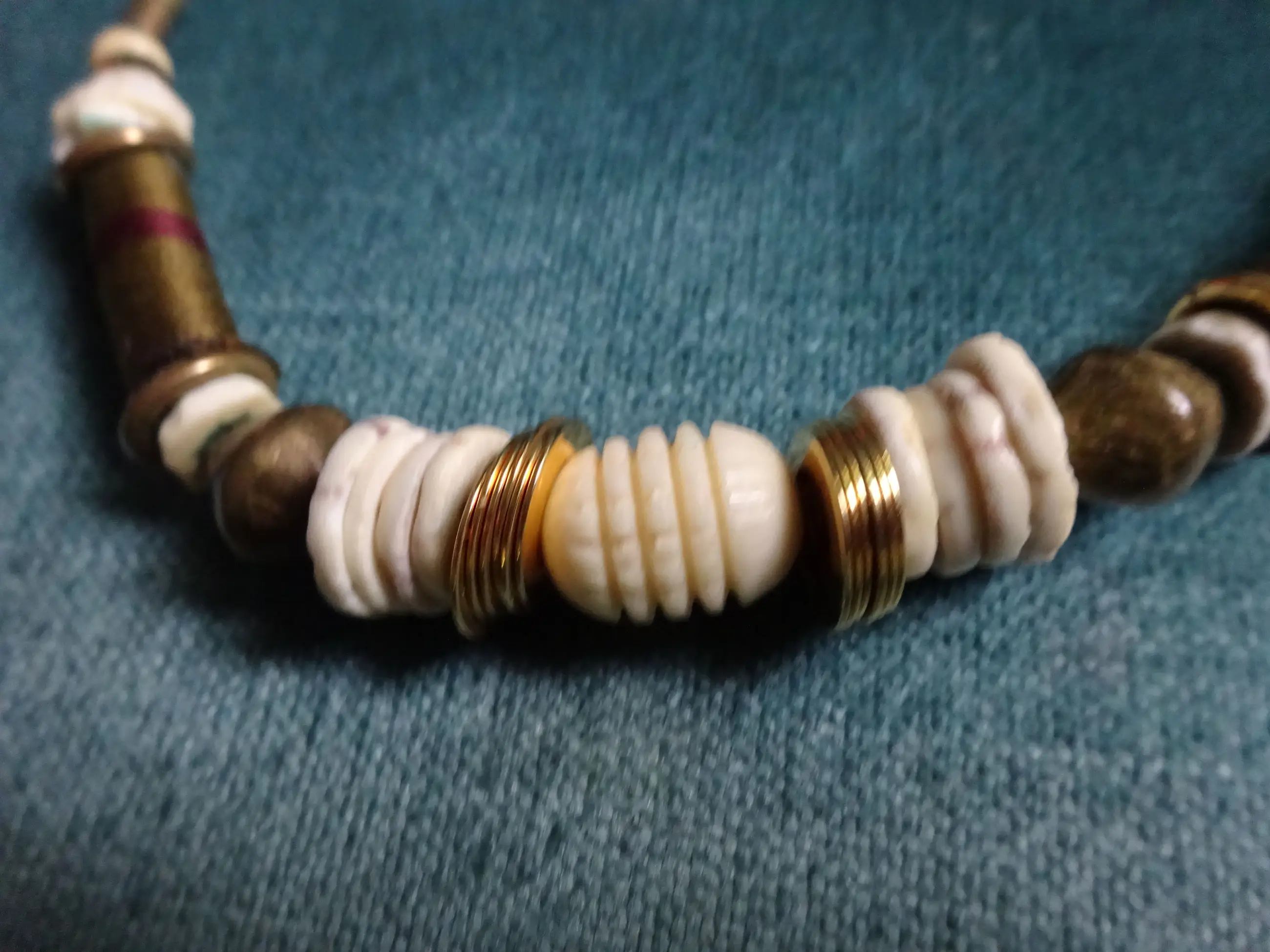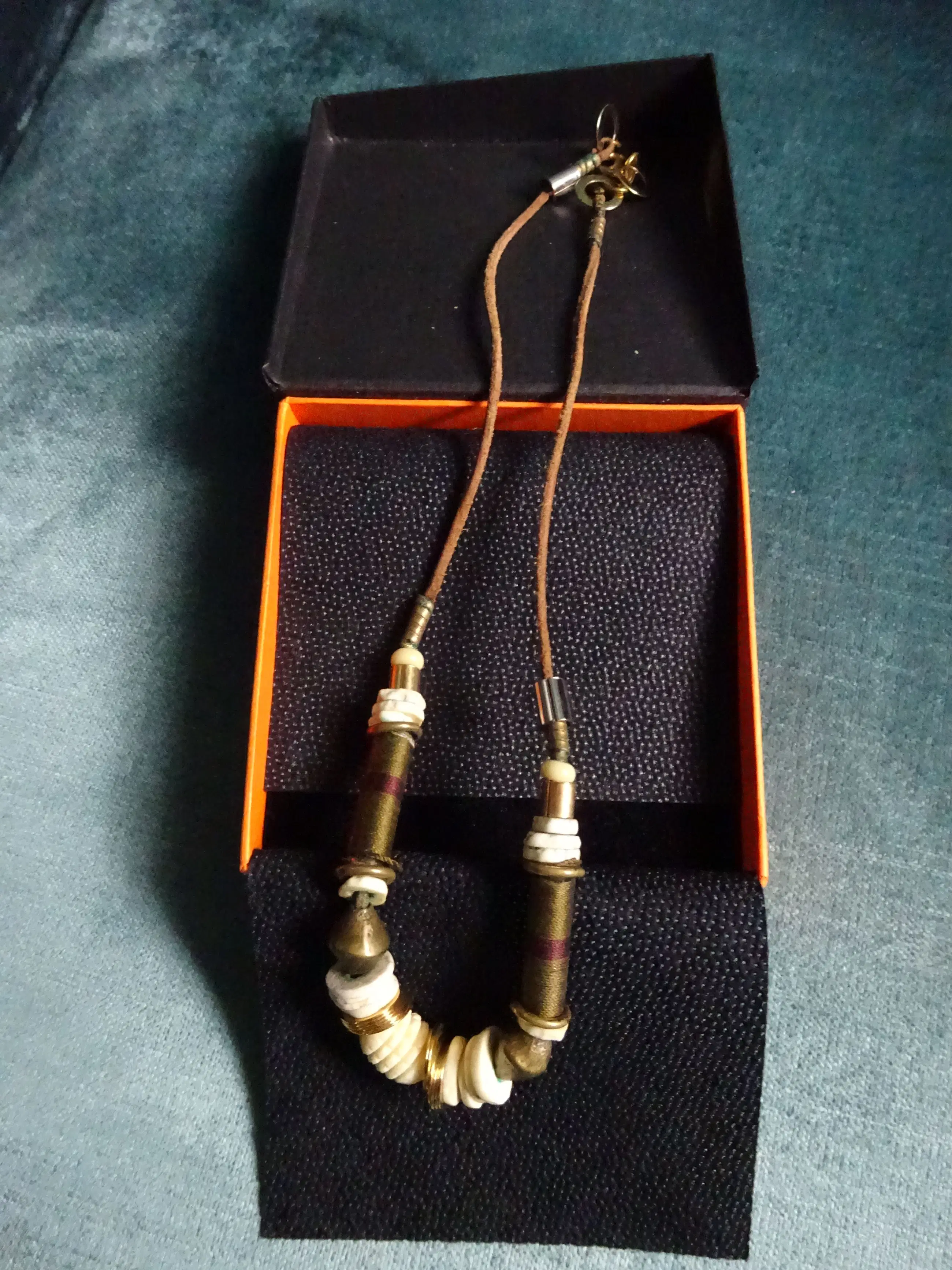 Vintage fijne ketting met de zwarte parel Ontwerp: Anni Schaad (of Lang) sinds 1988 heeft haar dochter Susanne Kiess-Schaad het bedrijf overgenomen. Merk: langani ( Langani with the black pearl) Kleur: diverse aarde, goud en koper tinten en twee langwerpige met zijde omwonden kraaldelen (zie foto's) Materiaal: diverse materialen waaronder metaal, hout,goudkleurige schijfjes en been Jaar: jaren '80-'90 Lengte: ca 40 cm Land: Duitsland Conditie: prachtige staat in Albert ten Cate sieraden doosje