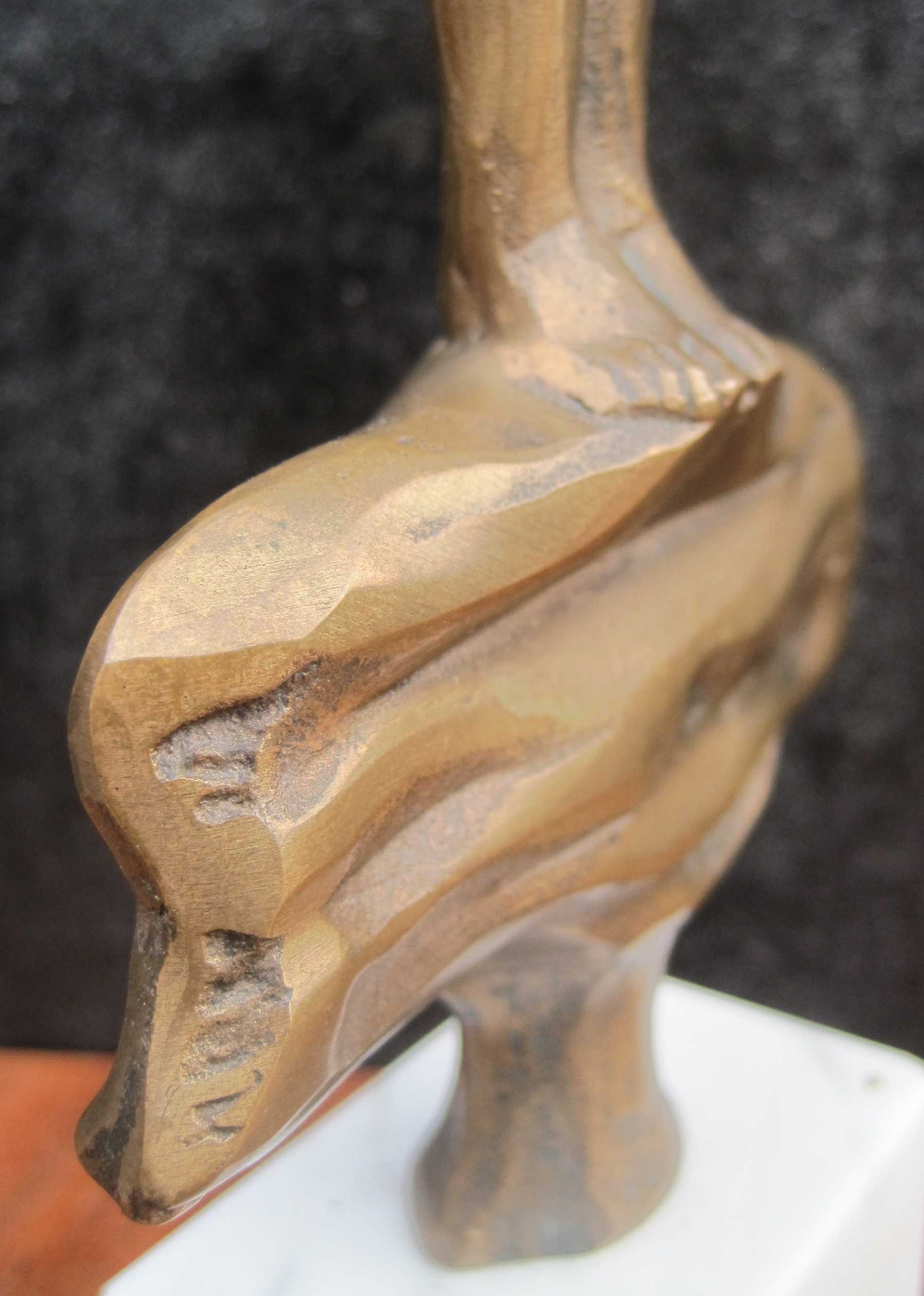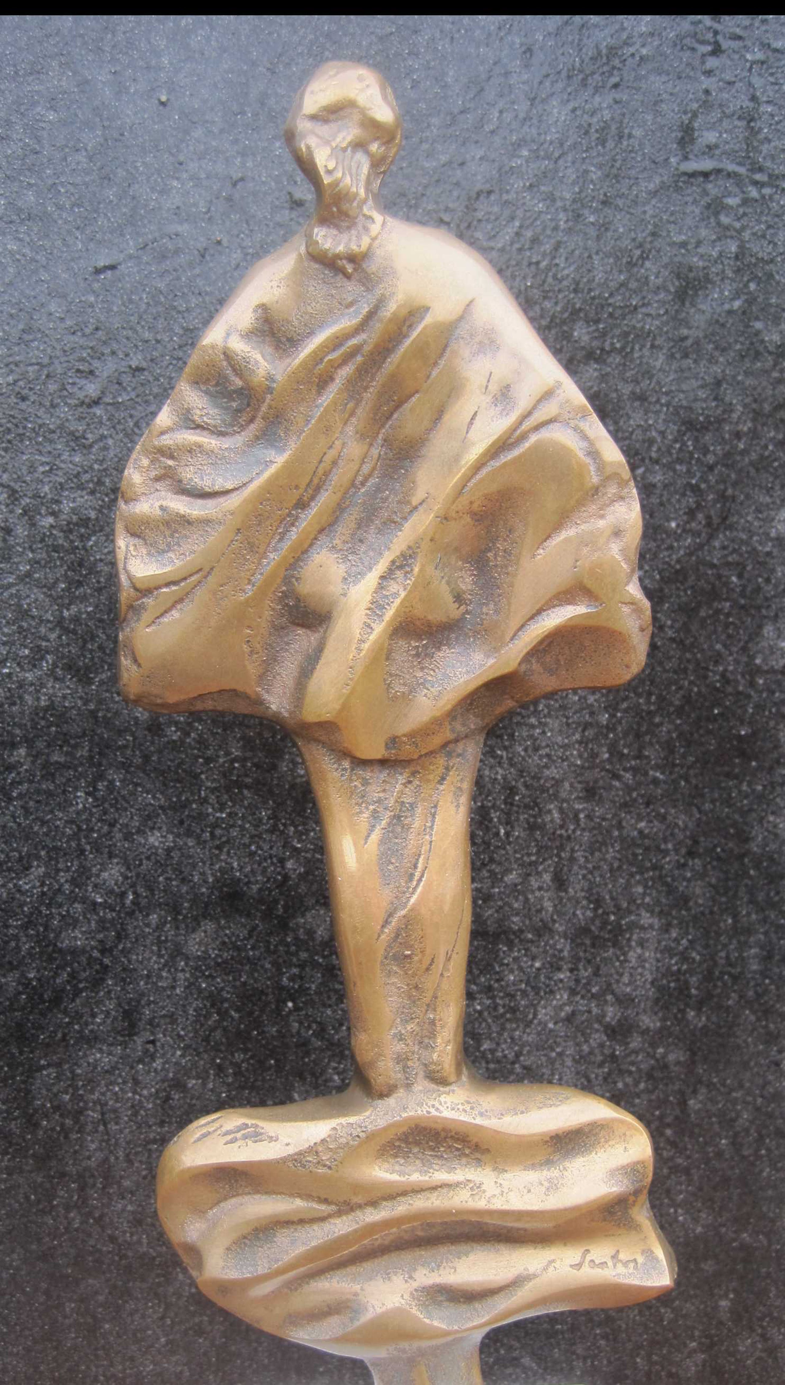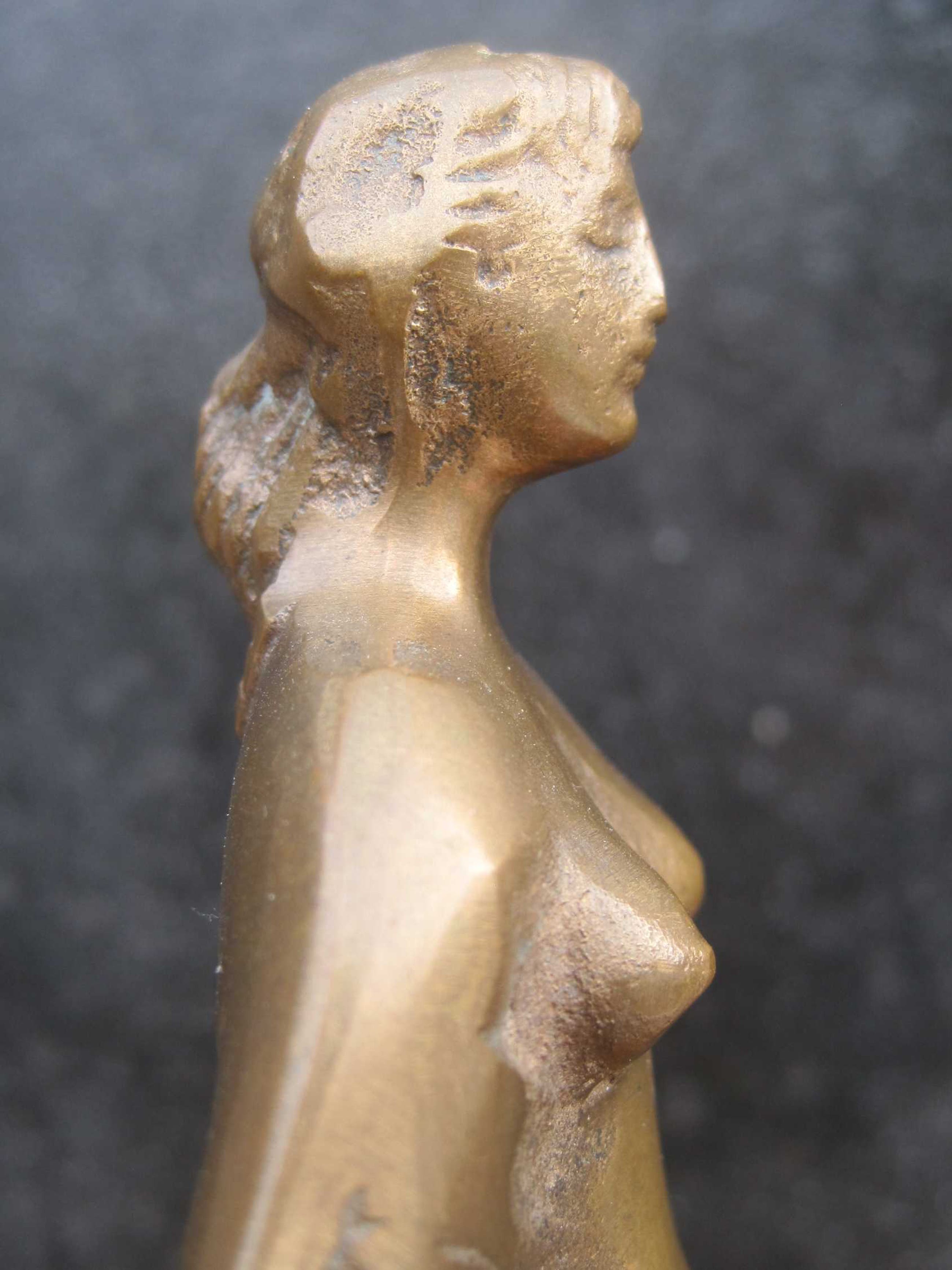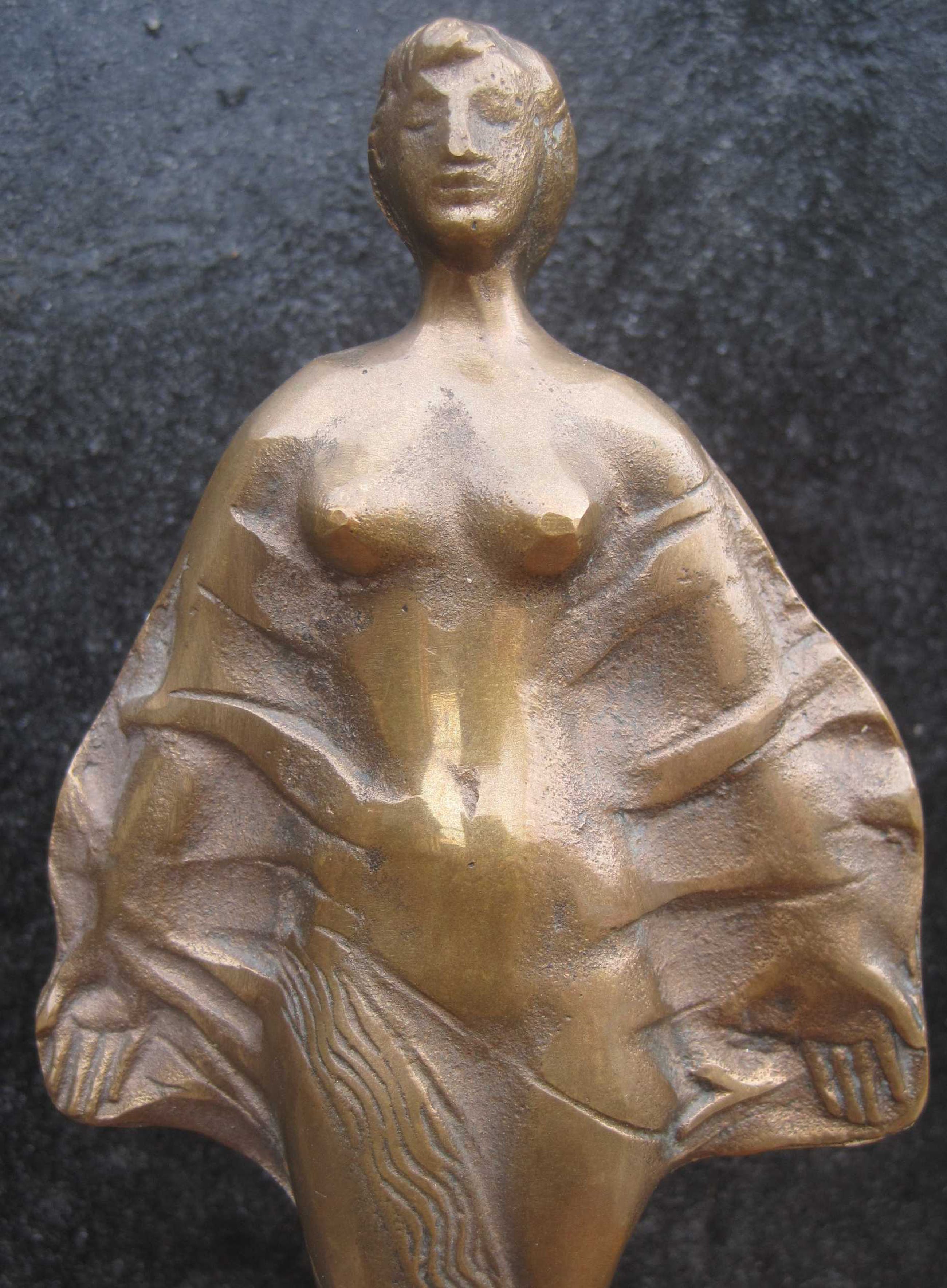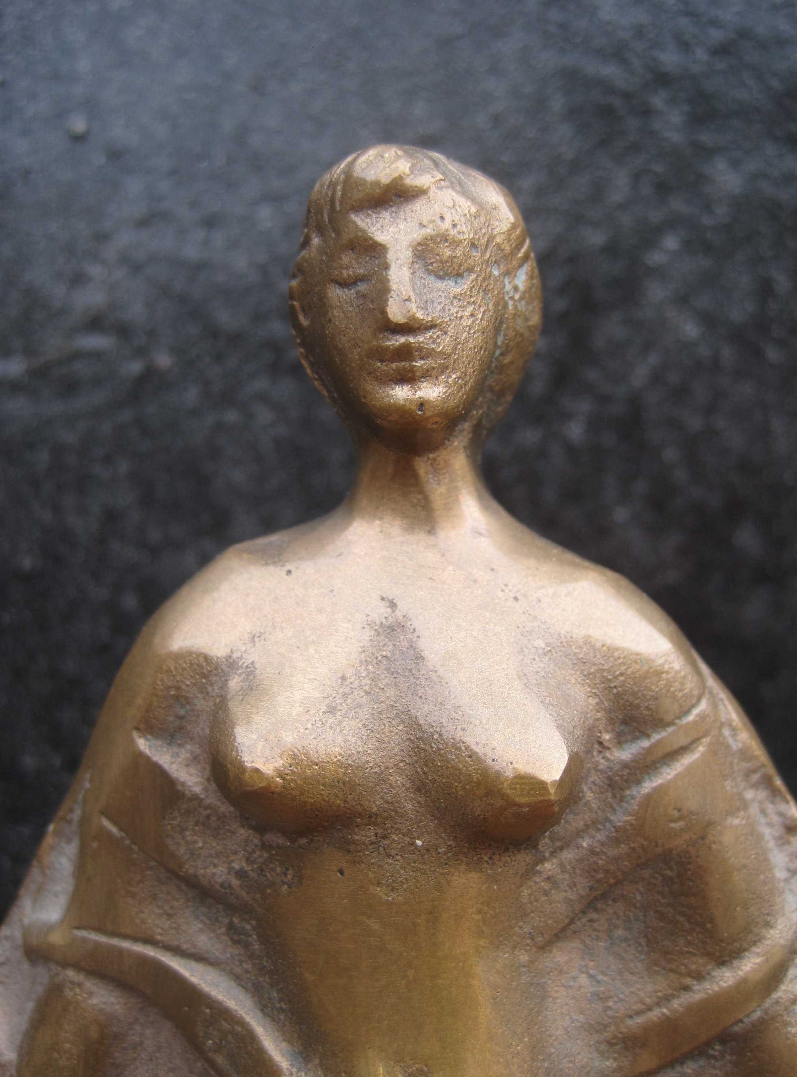 Auf den Wellen:Een zwaar bronzen beeldje van de Hongaarse kunstenaar Gyorgyi Lantos. ( 1953 ). Een bijzonder beeldje: dit is nummer 1 van een onbekend aantal. Het beeld is gesigneerd aan de achterzijde. Afm. beeld: 22 cm. De sokkel is beschadigd op 4 hoeken, daarom heb ik de conditie gekwalificeerd als goed.