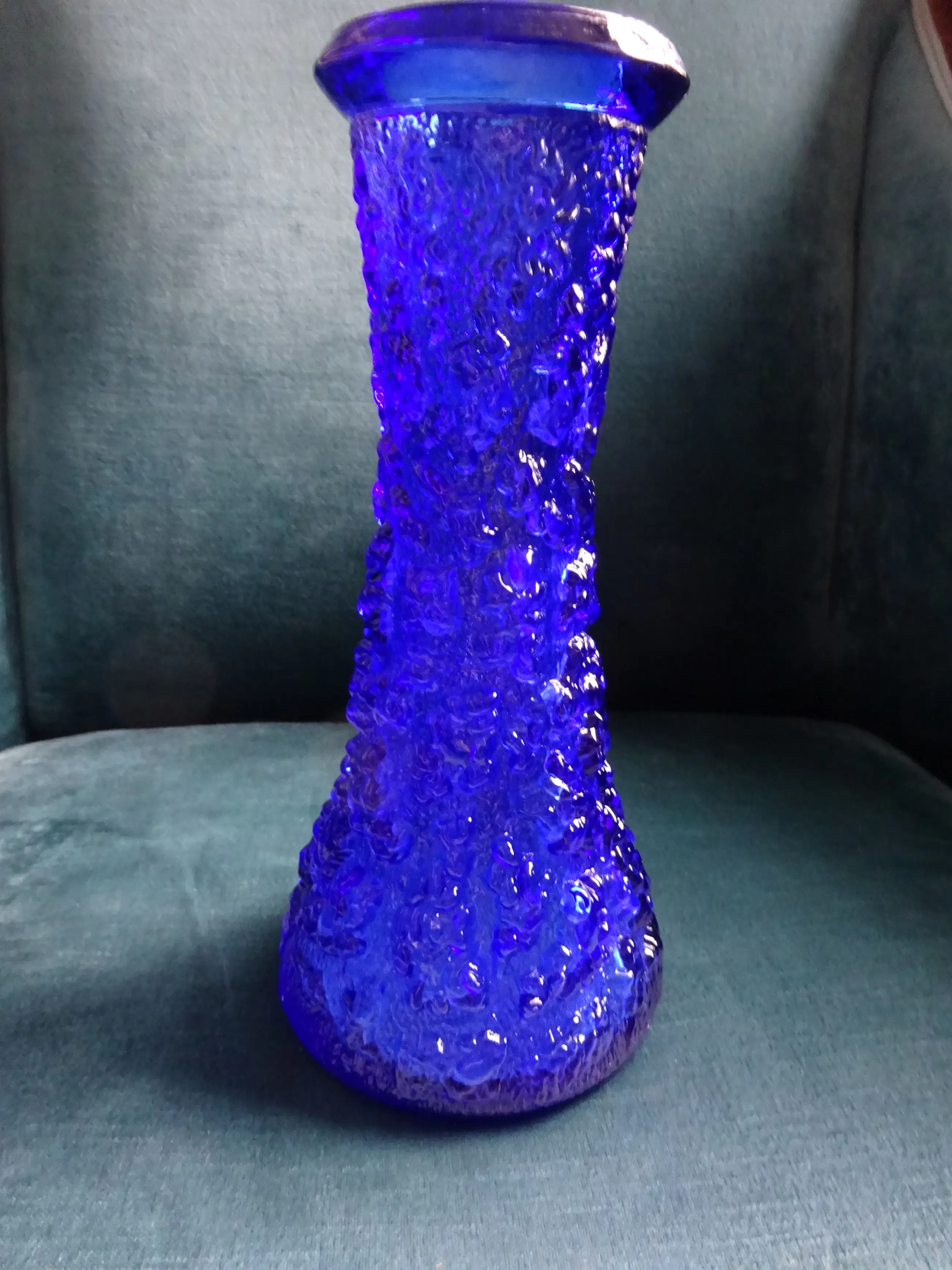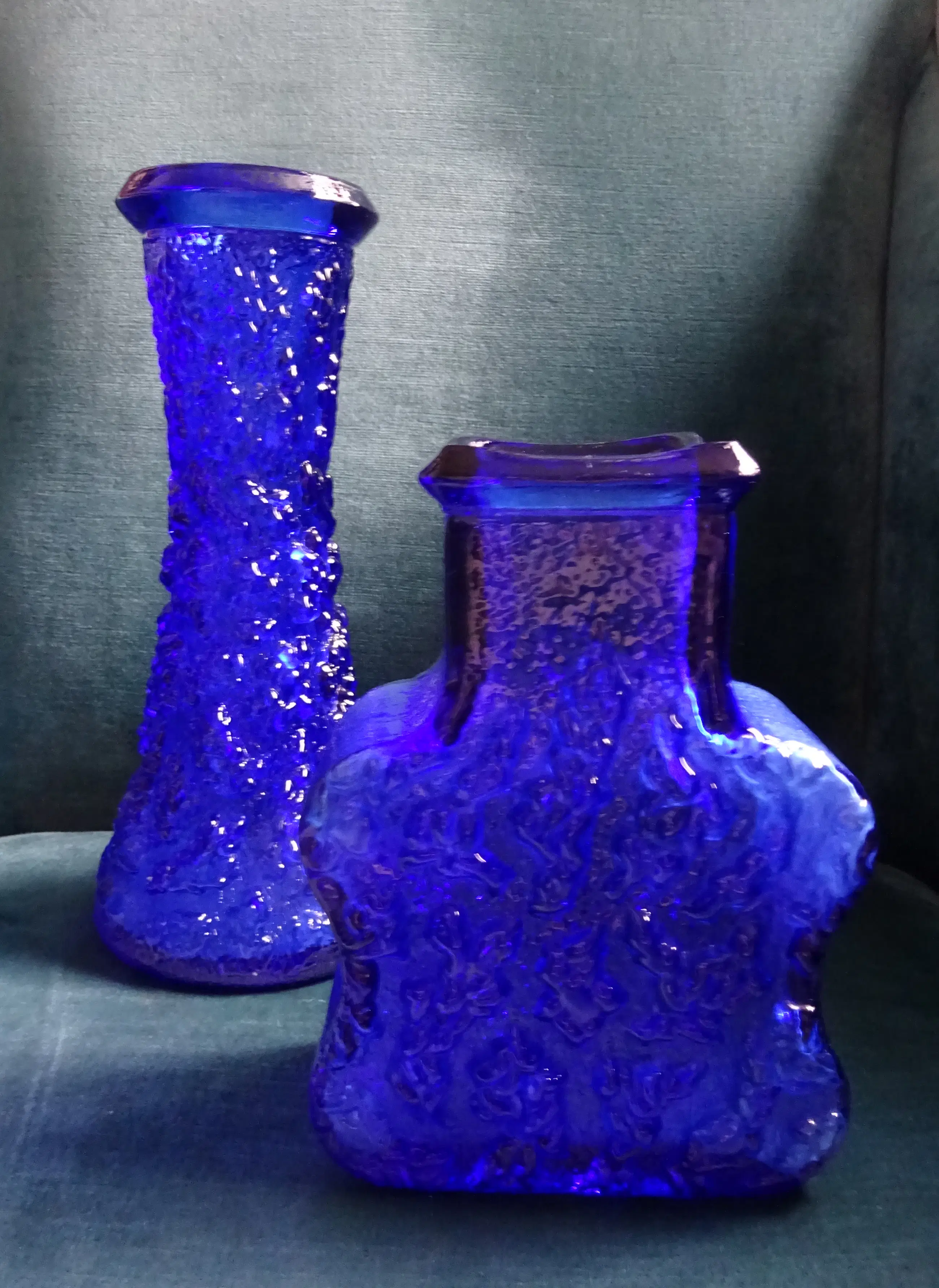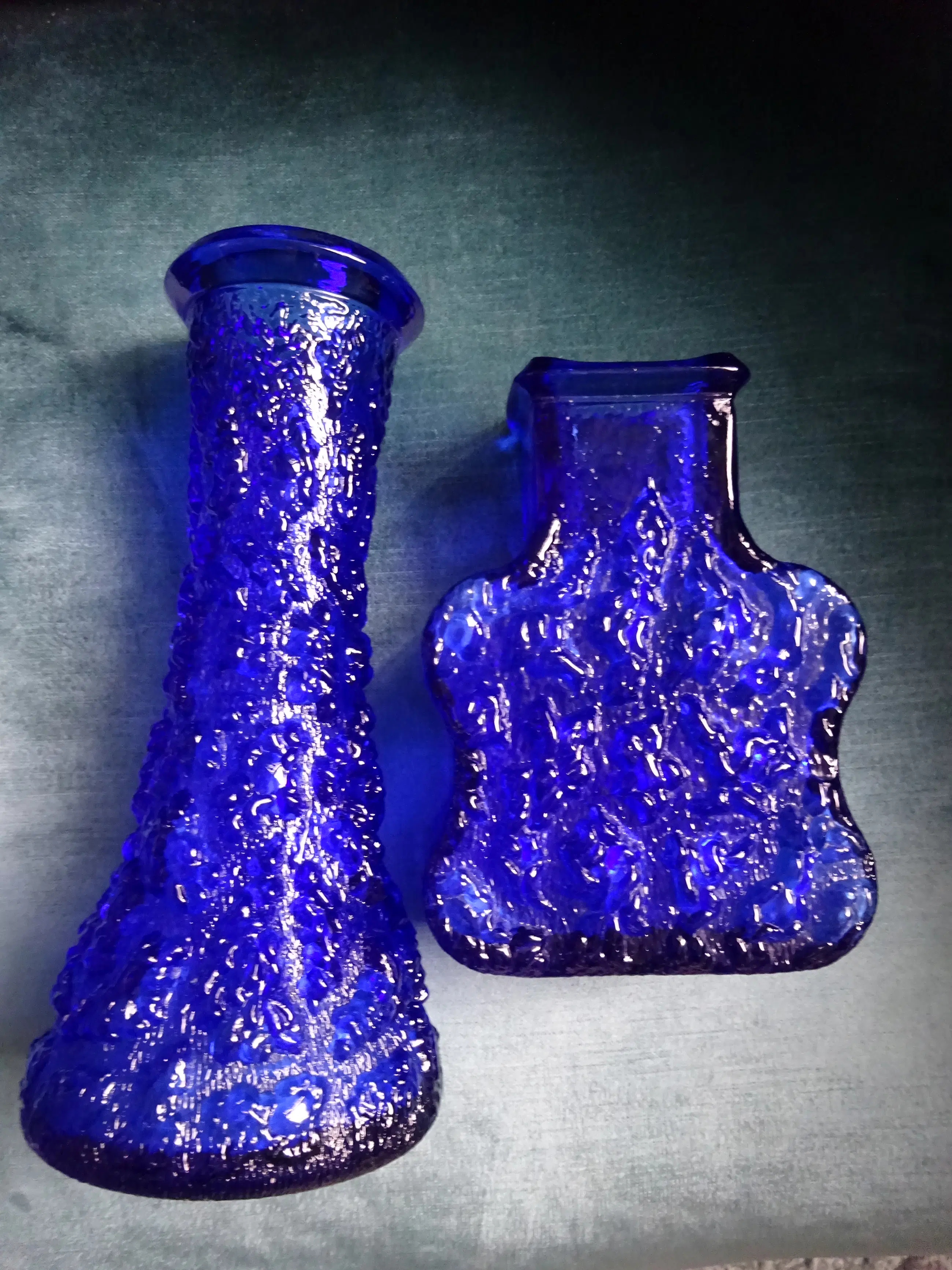 Twee Bark vazen van dik koningblauw - Kobaltblauw geperst glas Ontwerp is geïnspireerd op de natuur: de schors van bomen. Ontwerp: Lars Hellsten 1933 Uitvoering: Skruf Glasbruk Sweden Jaar: 1960-1969 Afmeting hoge vaas: 25 cm, diameter onder 11 cm Afmeting 'Guitar' vaas: ca 17.5 cm, breed 12 cm, diep 6 cm Kleur: Koningsblauw of Kobaltblauw Land: Zweden Conditie: mooie gave staat