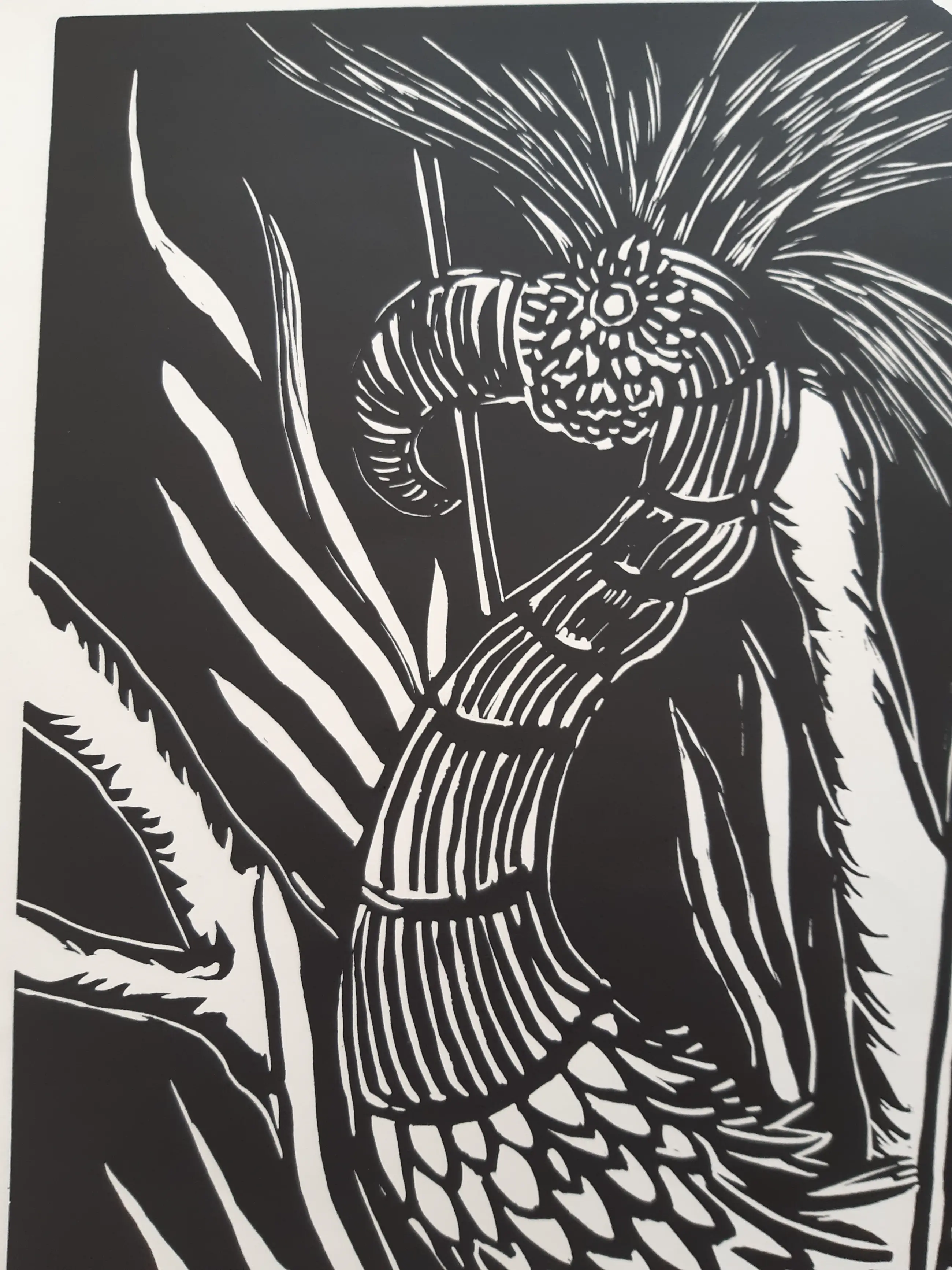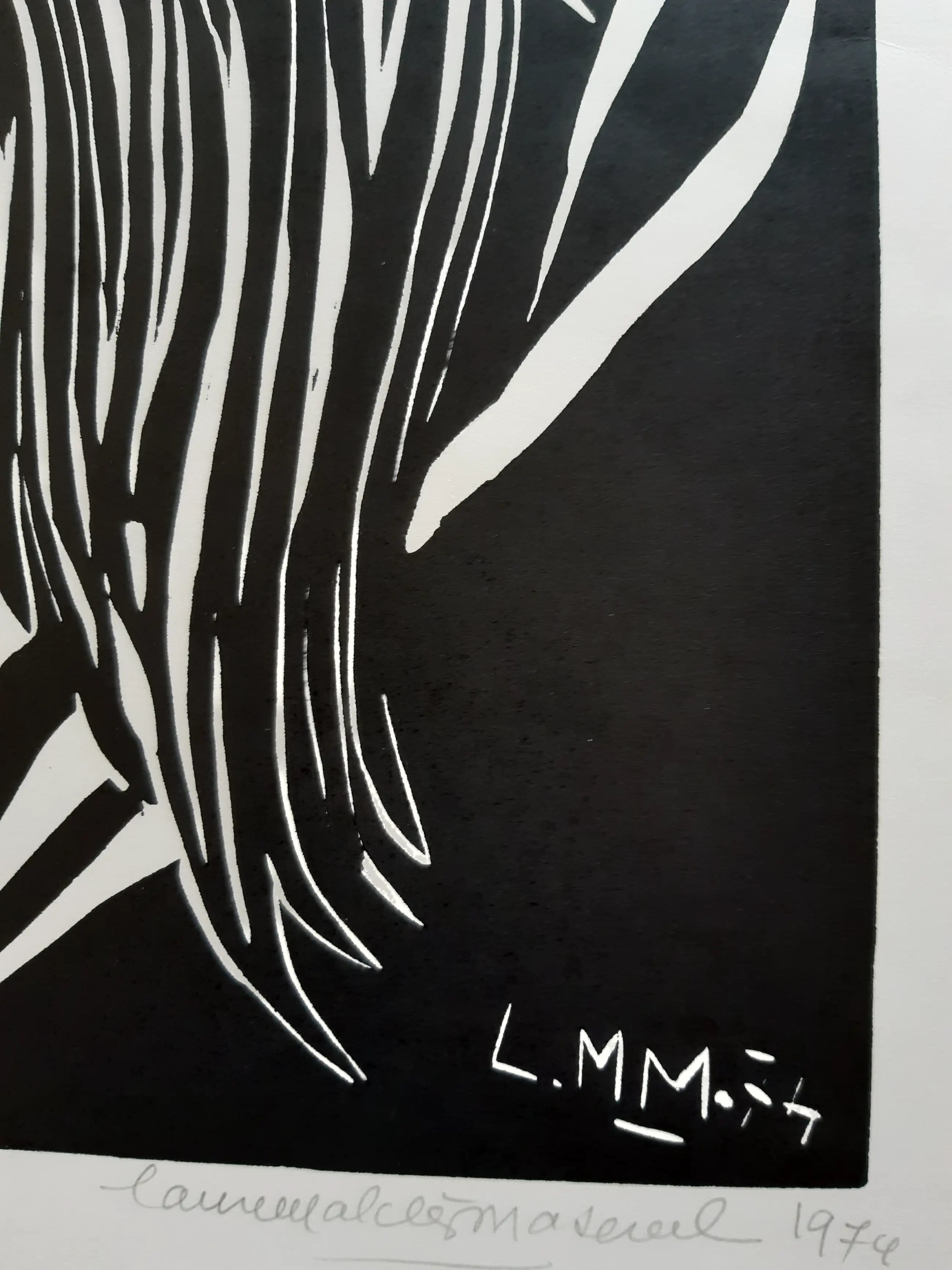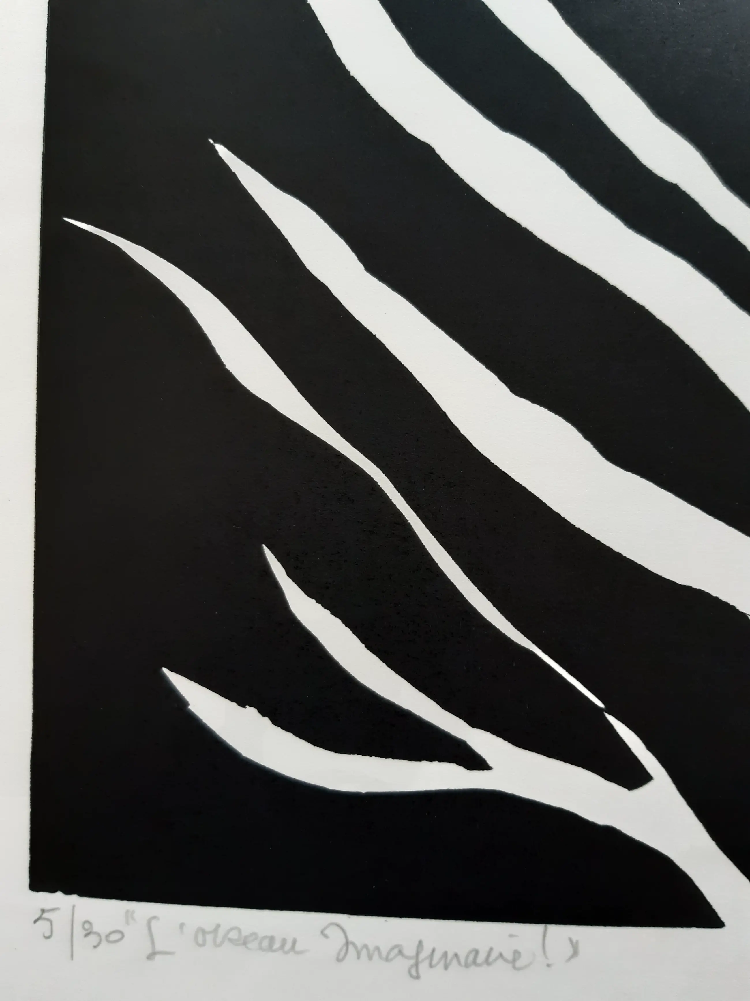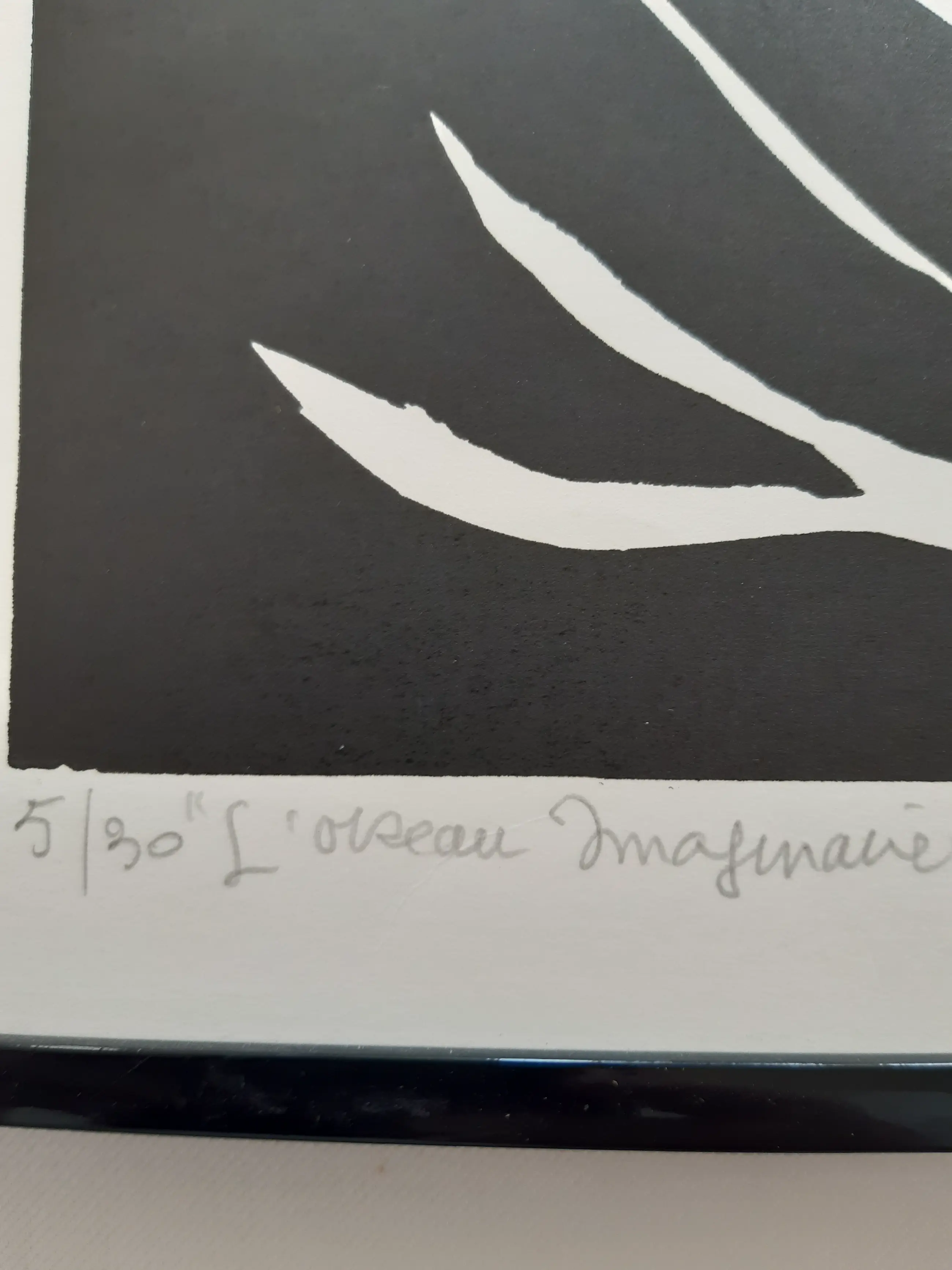 Mooie en gave en grote zwart-witte hout/ linosnede . Vogelfiguur in de stijl die erg doet denken aan Frans Masereel zelf. Dit werk in beperkte uitgave is van Masereel's tweede vrouw Laure Malcles-Masereel . Ook zij was kunstenares en werk van haar is onder andere opgenomen in de vaste collectie van het Museé d'art Moderne in Parijs . Werk wordt veilig verzonden.