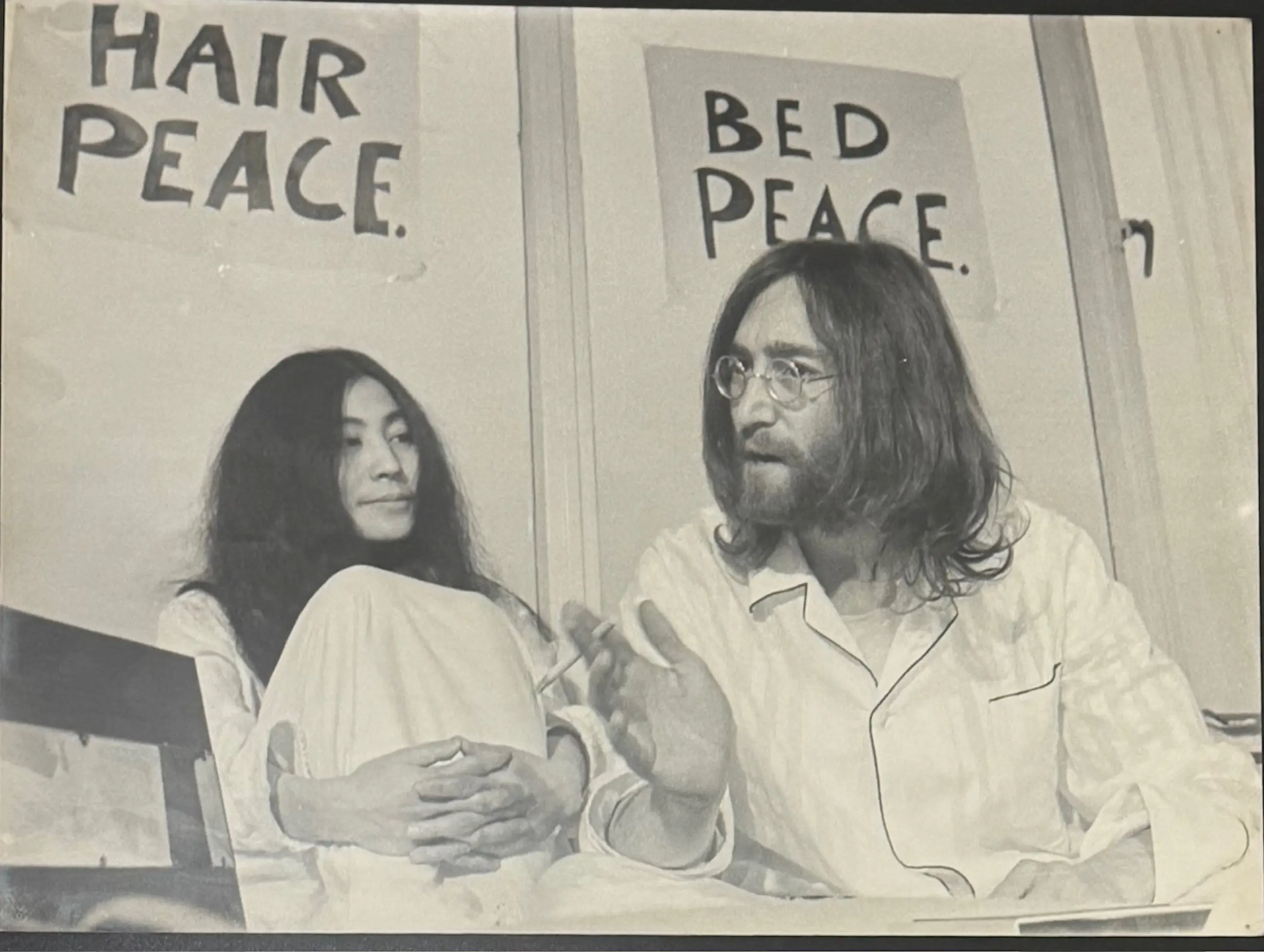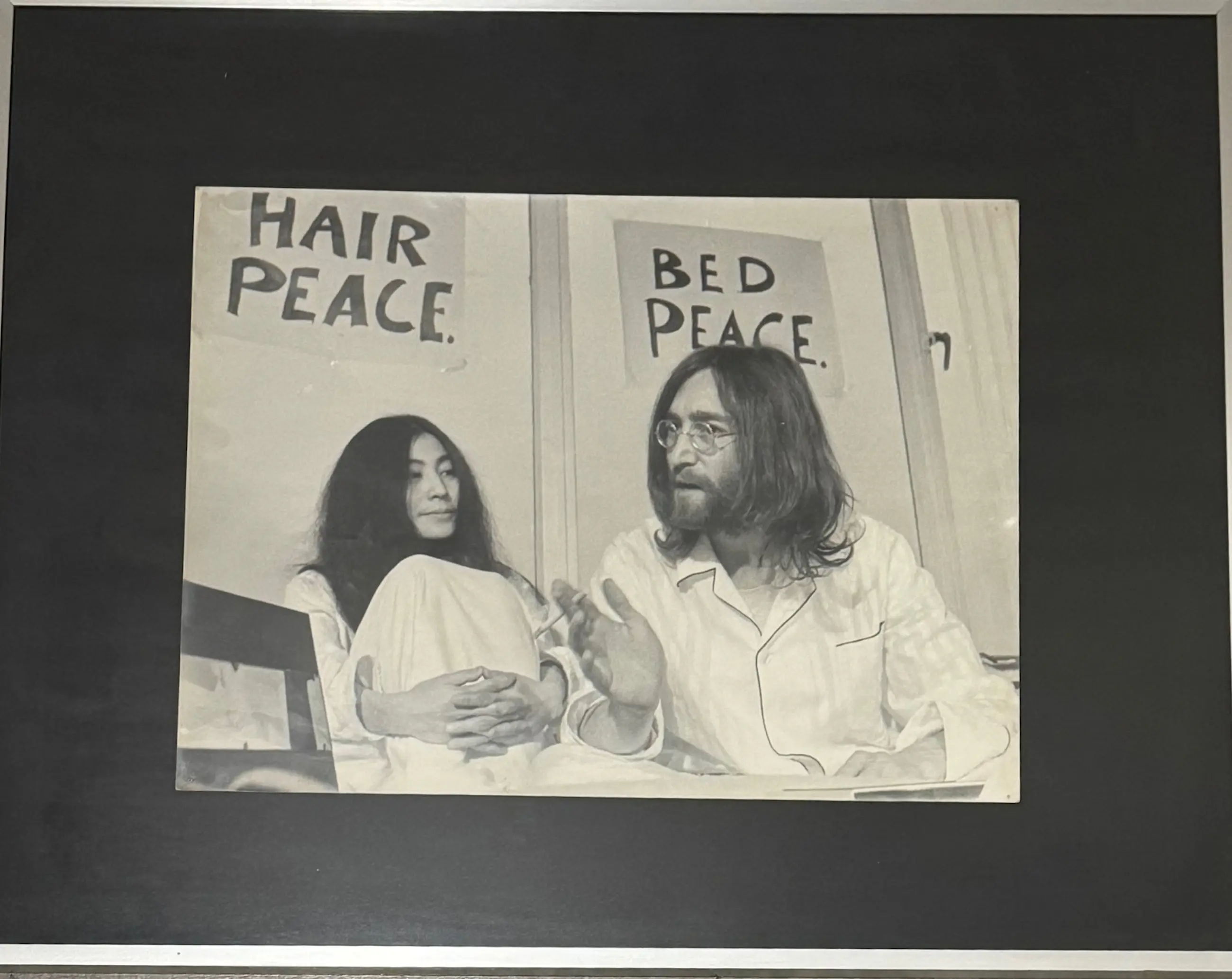Van 25 tot 31 maart 1969 hielden Lennon en Ono hun eerste Bed-In in suite 702 van het Hiltonhotel in Amsterdam. Even daarvoor waren ze getrouwd en ze dachten met deze actie de aandacht die hun huwelijk trok te kunnen aanwenden voor de bevordering van de wereldvrede. In het Amsterdamse Hilton bracht het jonge paar inderdaad de gehele tijd door in bed, waarbij de pers aanwezig was. Deze foto is gemaakt door Laurens van Houten. In de hoeken gaatjes van punaises, verder in zeer goede conditie. Achterop voorzien van een stempel.
