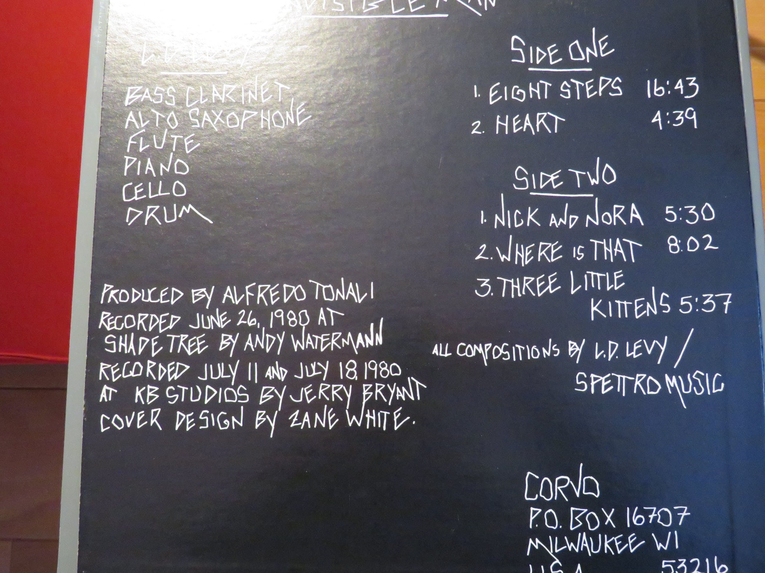 Corvo Records 8003, Milwaukee USA. All compositions L D Levy, L D Levy, basscl. piano, altsax. cello. Alternative music