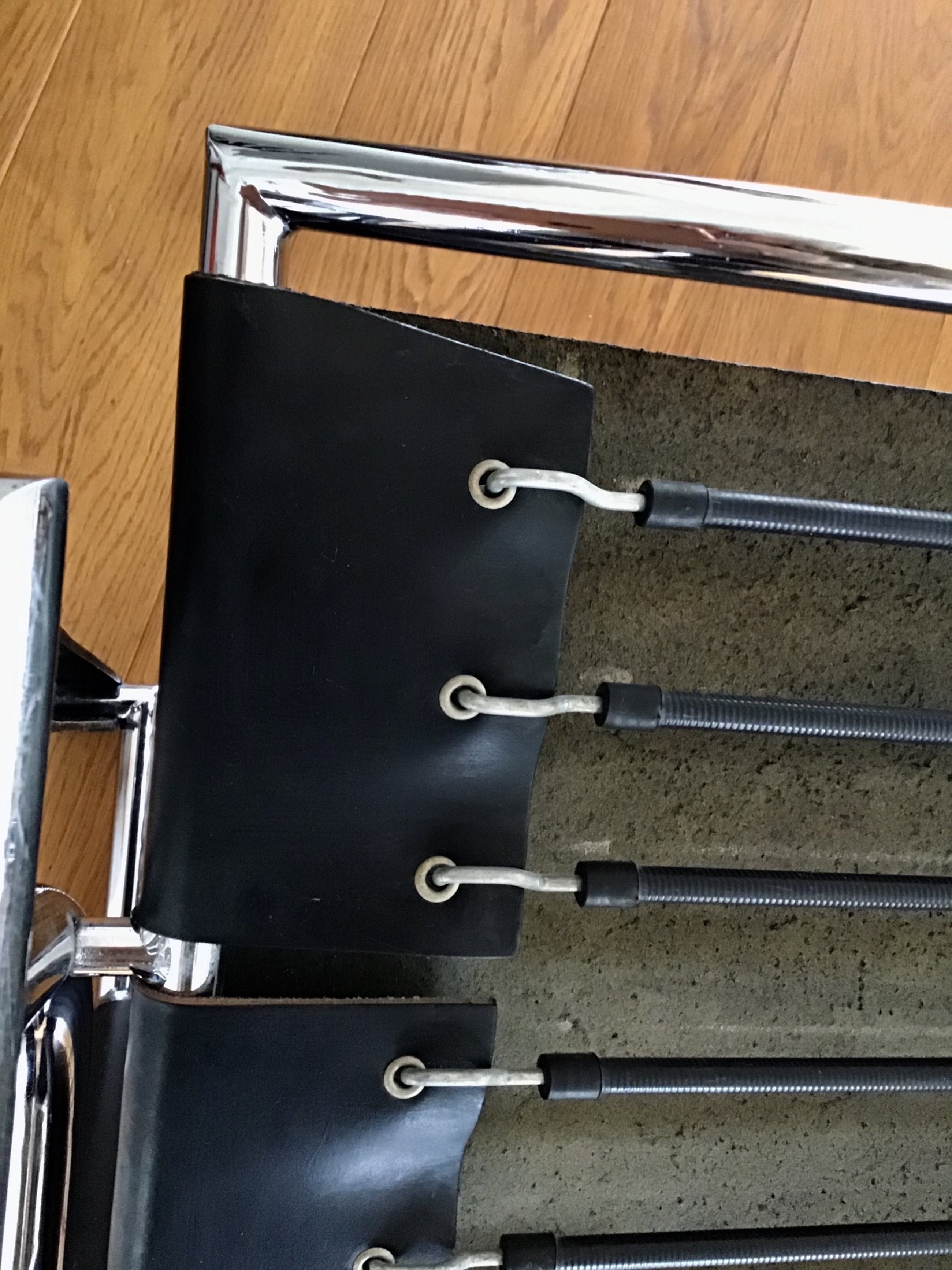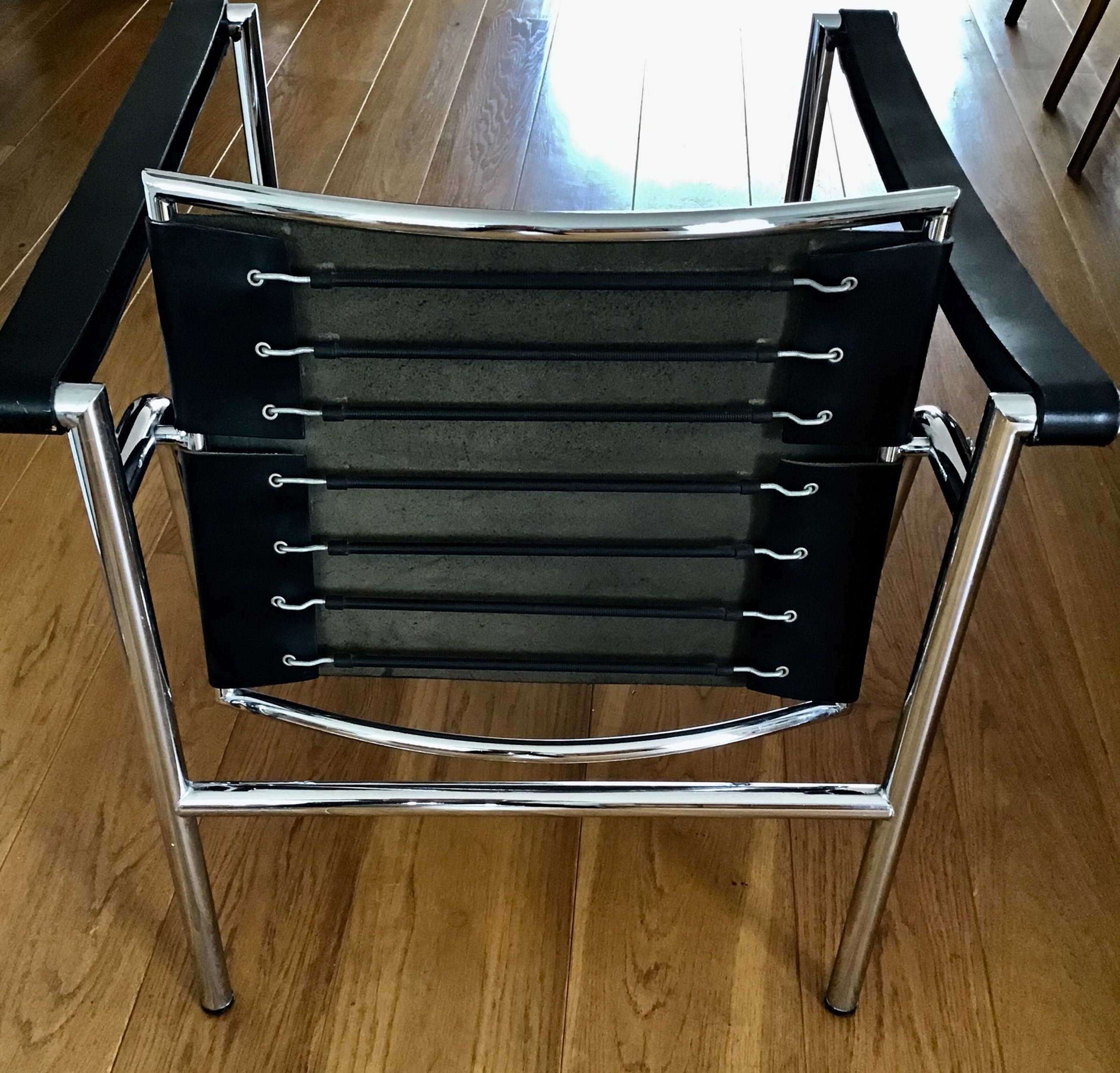 De bekende LC1 fauteuil van Le CorbusierChroom met zwart lederBeweegbare rugleuningIn goede staatKleine gebruikssporenIn de jaren 80 gekocht bij Wonen 2000(de Kastoor) in AmsterdamGraag ophalen