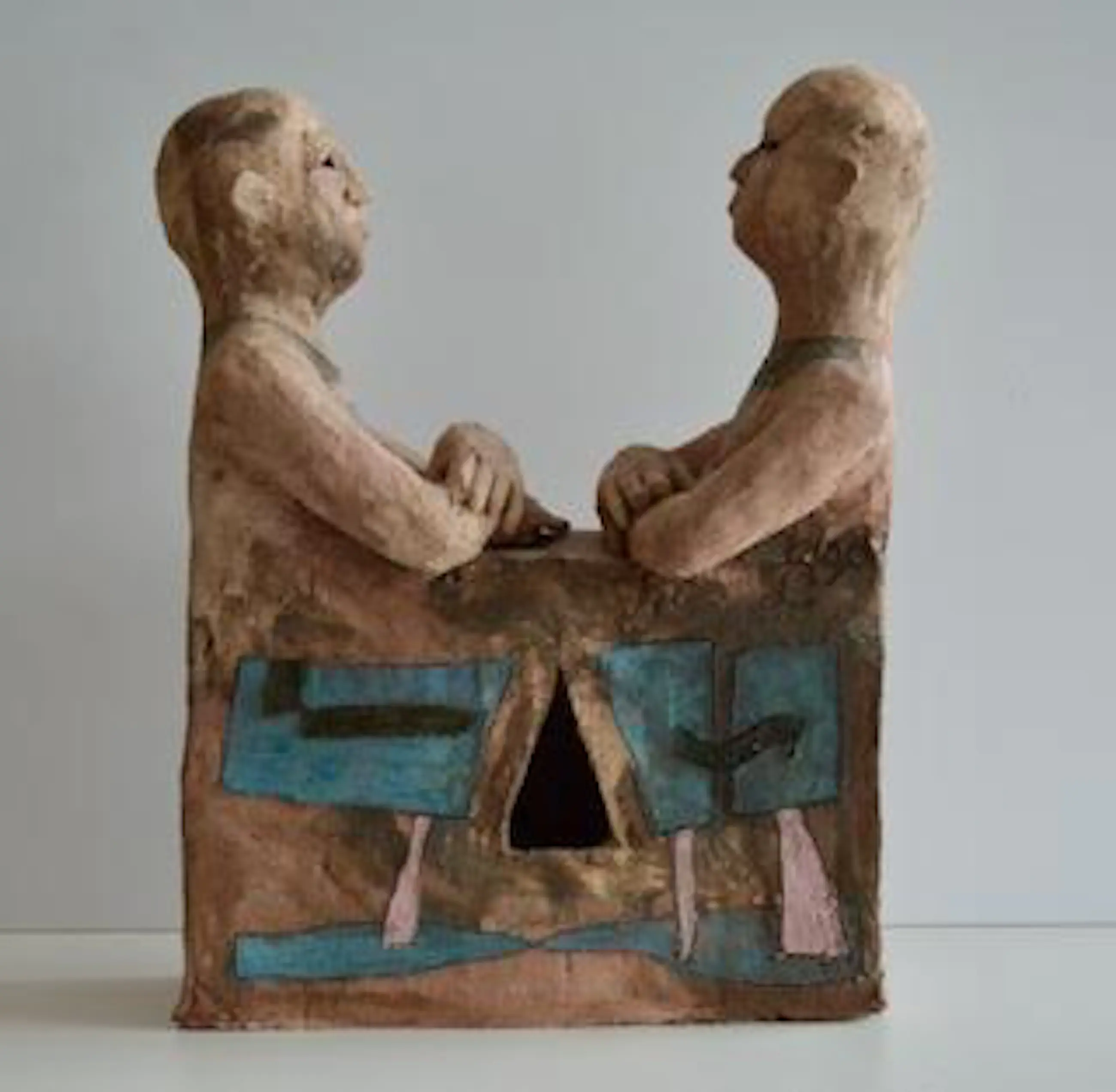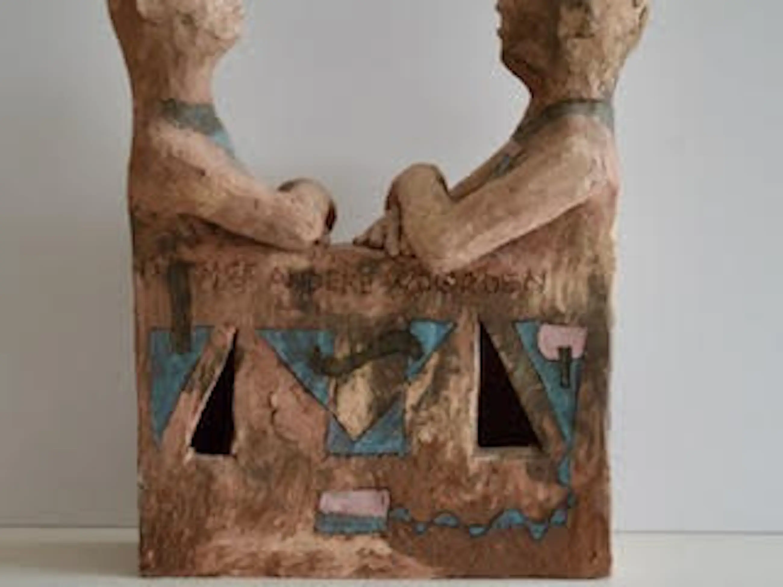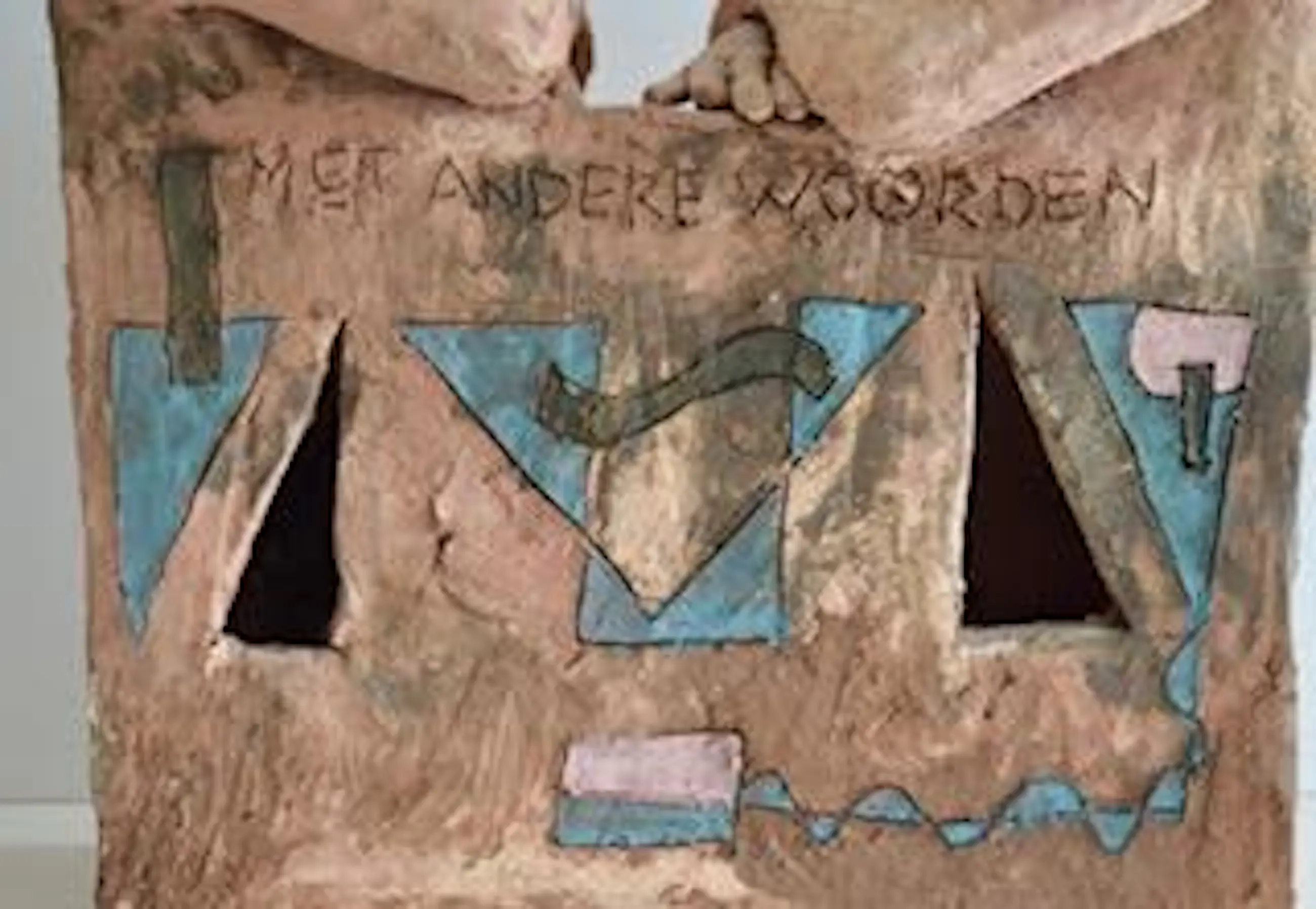 D'haese Lebuin is een Belgische dichter, beeldhouwer, schilder. Geb. 1956 Hij communiceert via zijn werk met het publiek dat op die manier inzicht krijgt in zijn denkwereld. Zijn onderwerp is altijd "de mens" Dit werk is gemonogrammeerd "D" voor D'haese Lebuin Inscriptie LXXI Tekst op het werk "Met andere woorden". Afmetingen H= 35cm Br = 12cm L = 25cm