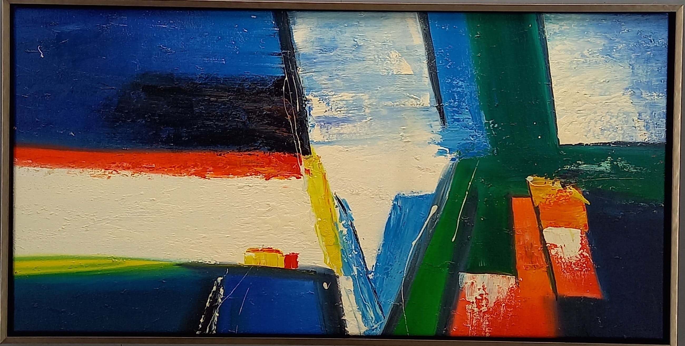 Zeer kleurrijk schilderij. In baklijst. Gesigneerd op achterzijde.