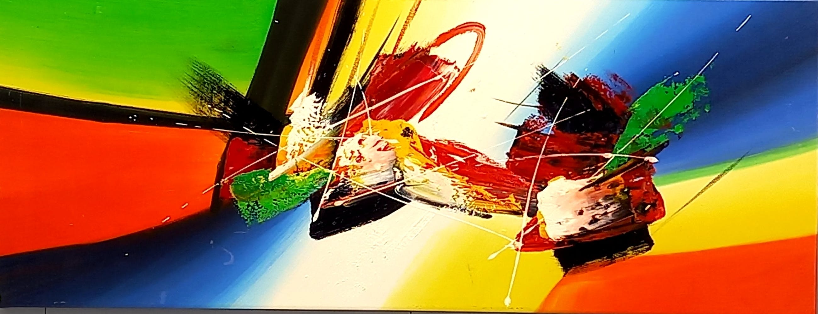 Kleurrijk schilderij. Opgespannen op houten spieraam. Achterzijde gesigneerd.