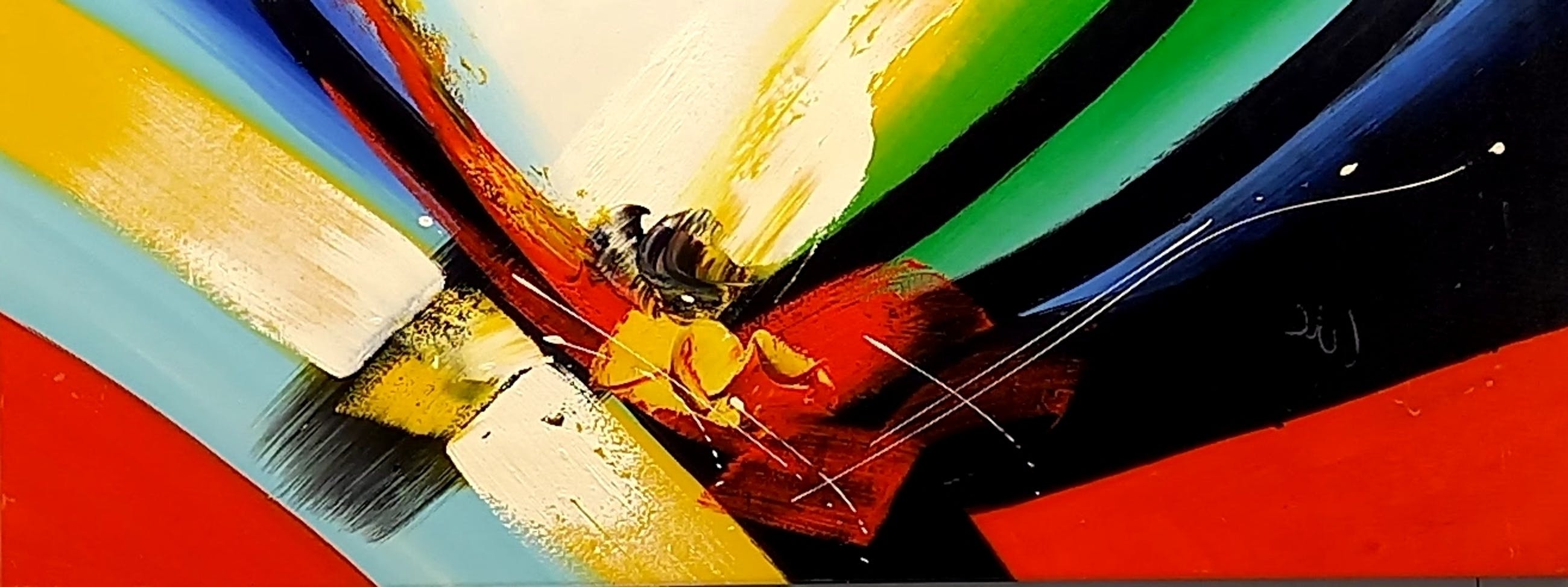 Kleurrijk schilderij. Opgespannen op houten spieraam. Achterzijde gesigneerd.