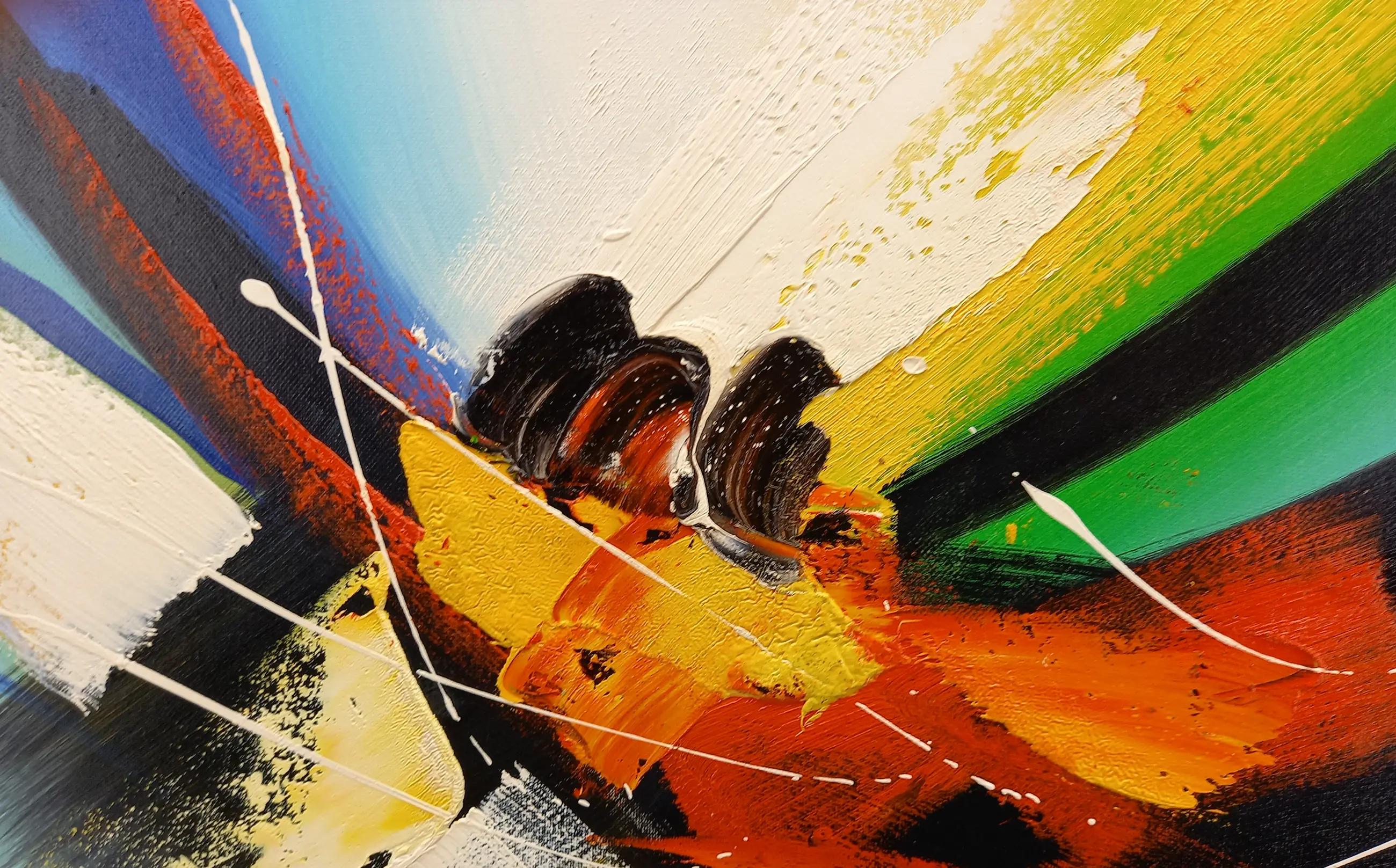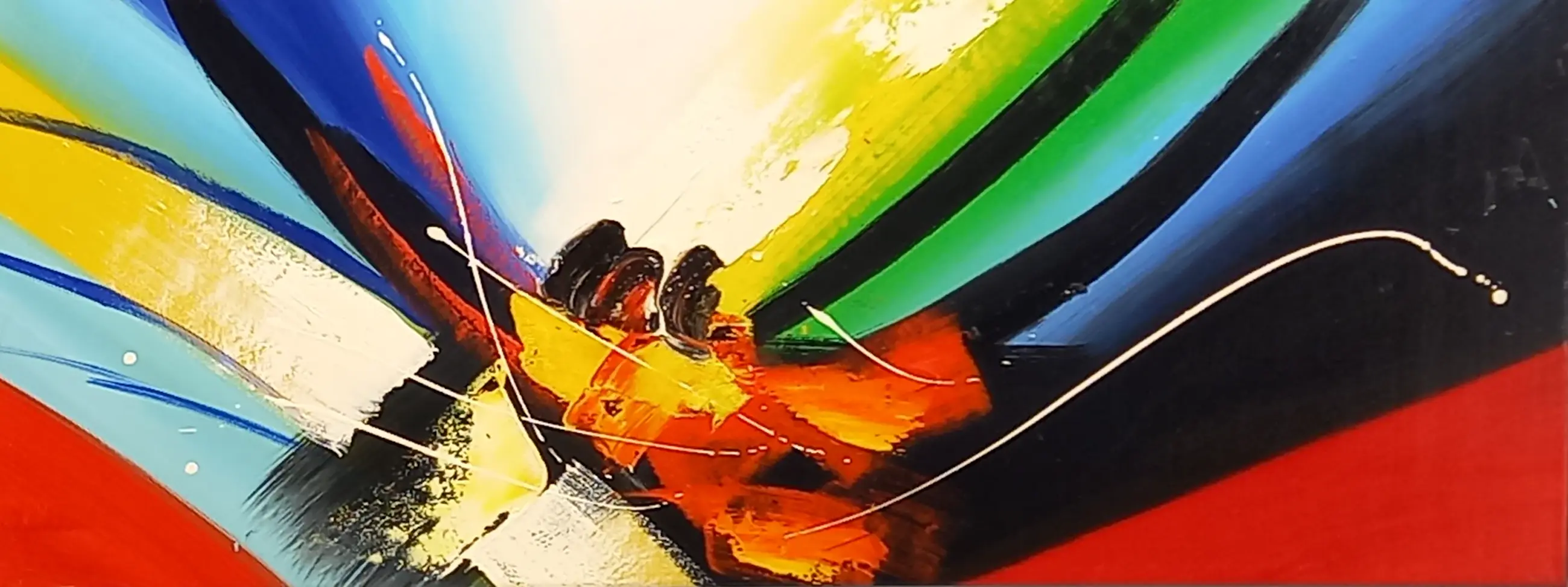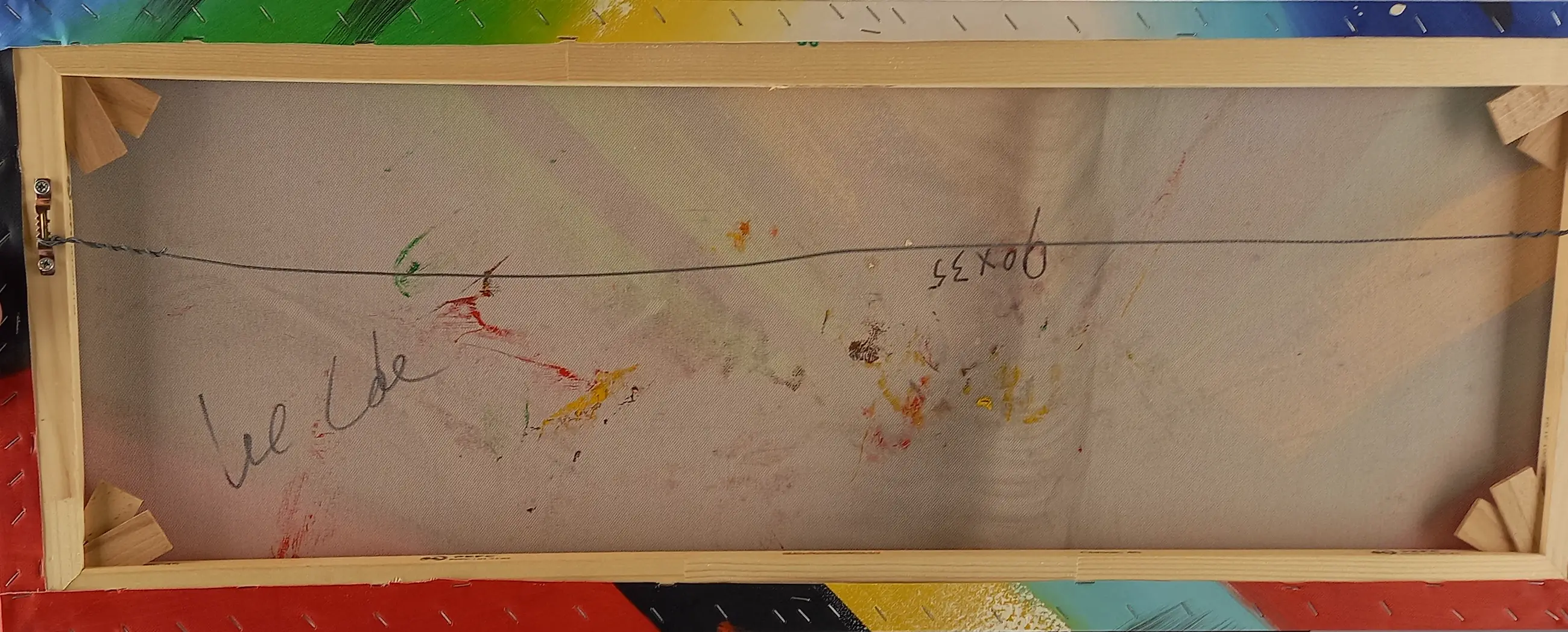 Kleurrijk schilderij, opgespannen op houten spieraam.