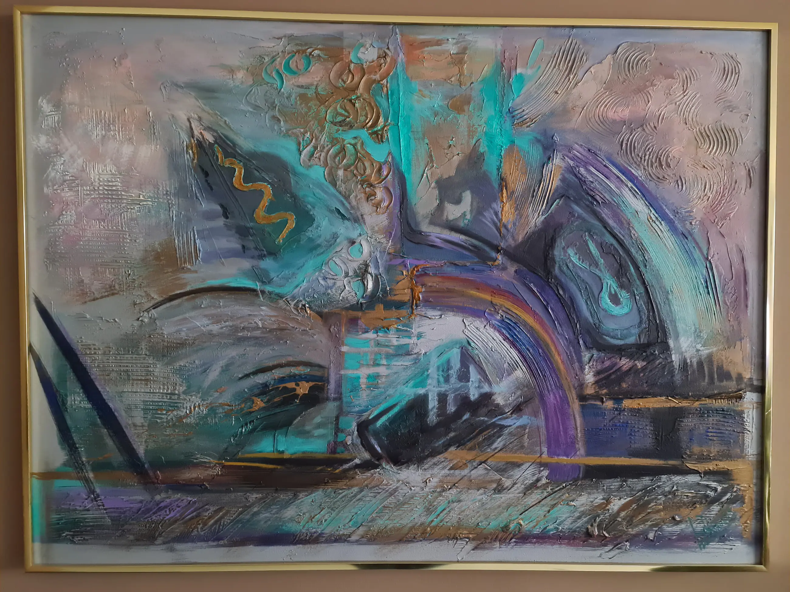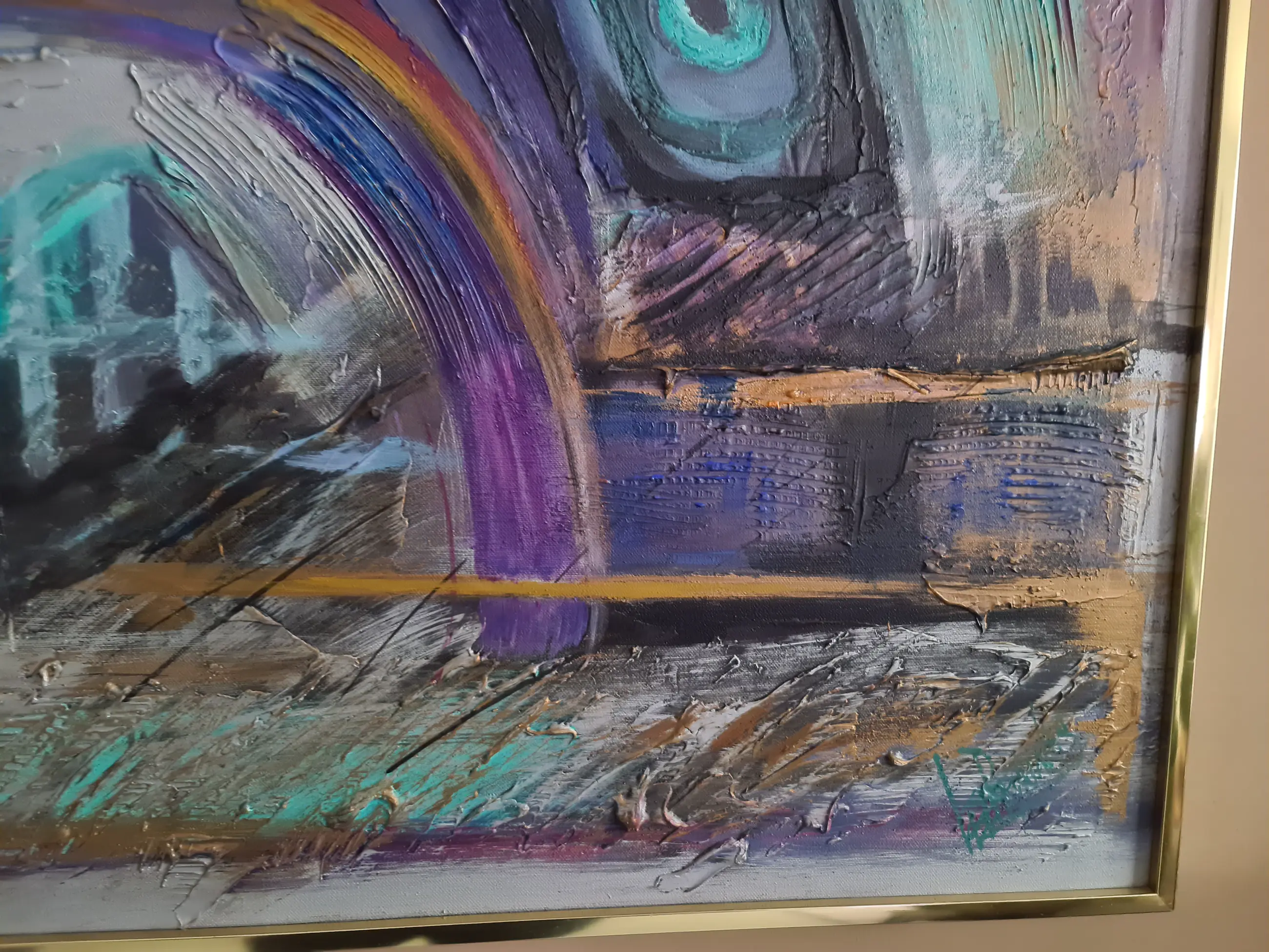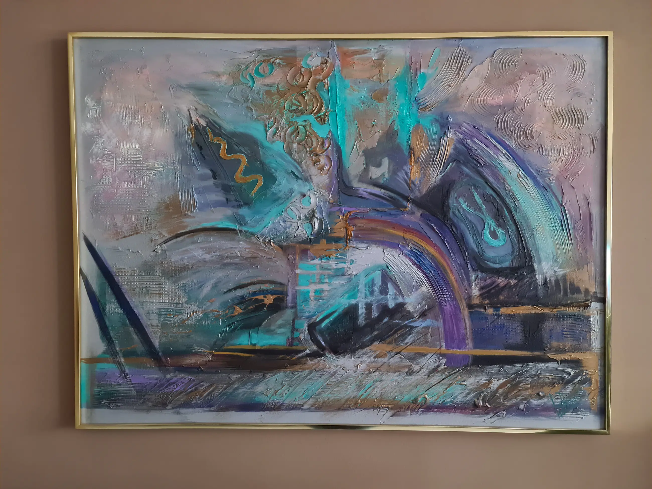 De mooie gouden lijst is van Vanguard Studios. Het is een modern schilderij in de hippe pastelkleuren paars, blauw en goud. Wij denken dat het het Sydney Opera House in Australië moet voorstellen.