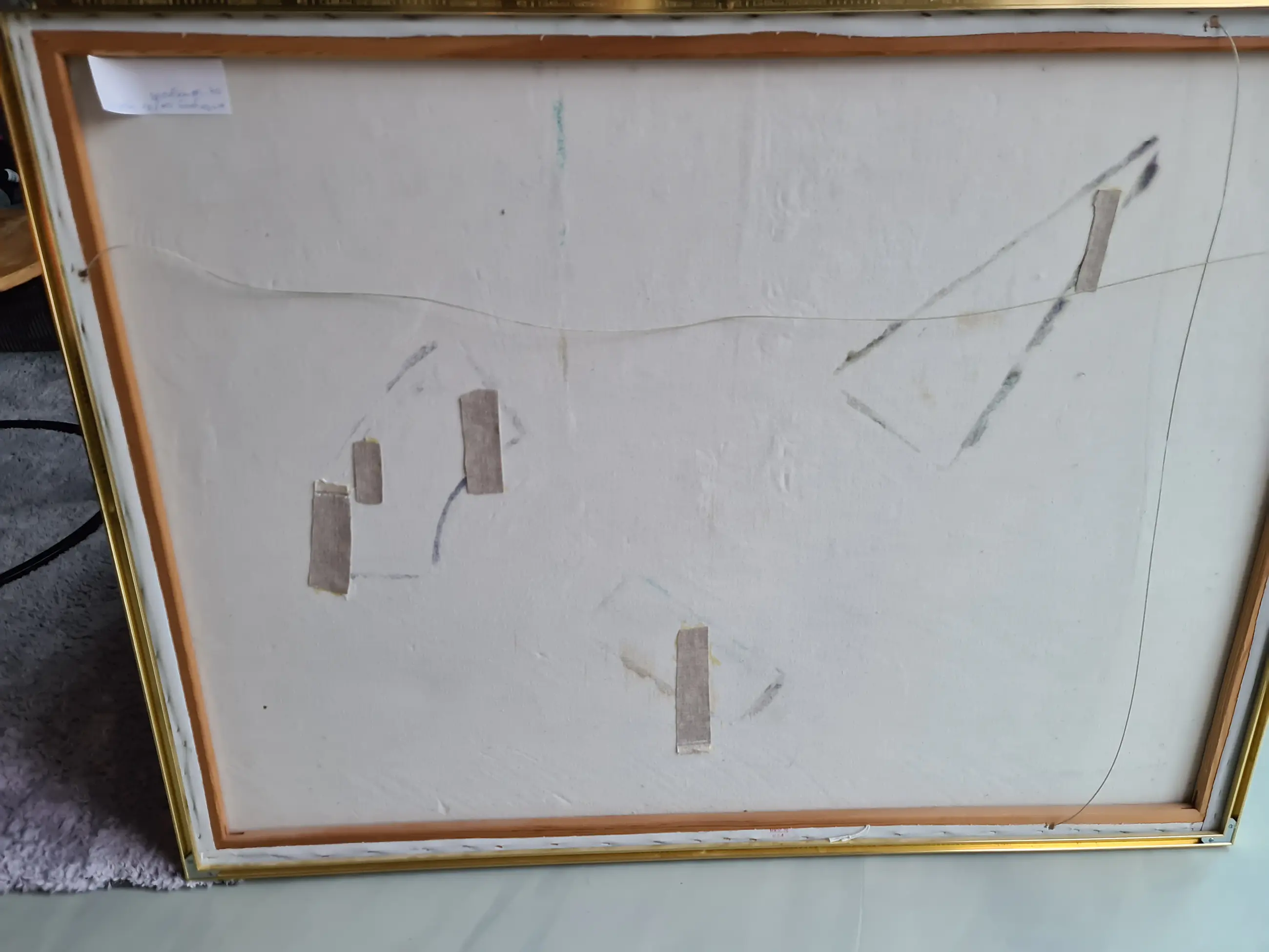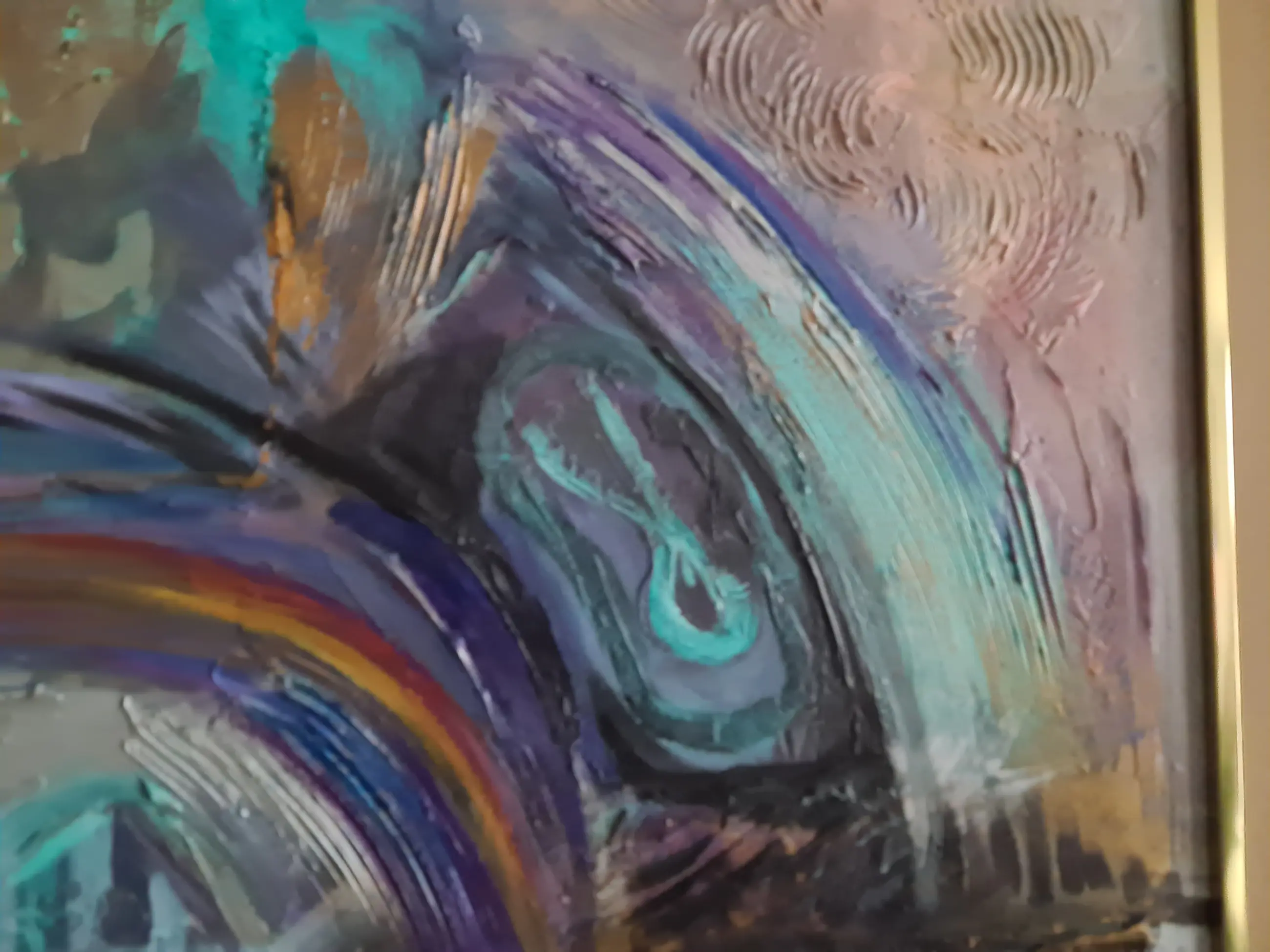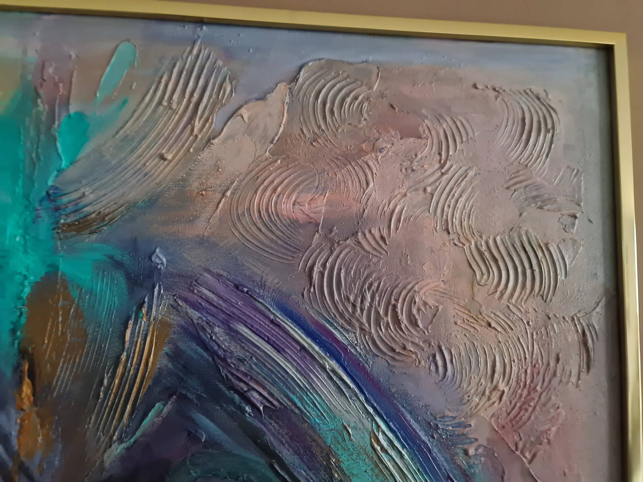 De mooie gouden lijst is van Vanguard Studios. Het is een modern schilderij in de hippe pastelkleuren paars, blauw en goud. Wij denken dat het het Sydney Opera House in Australië moet voorstellen.