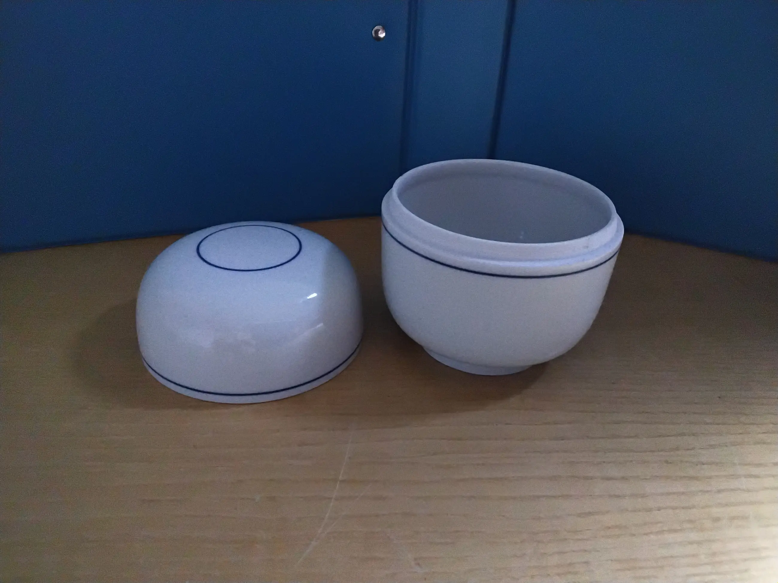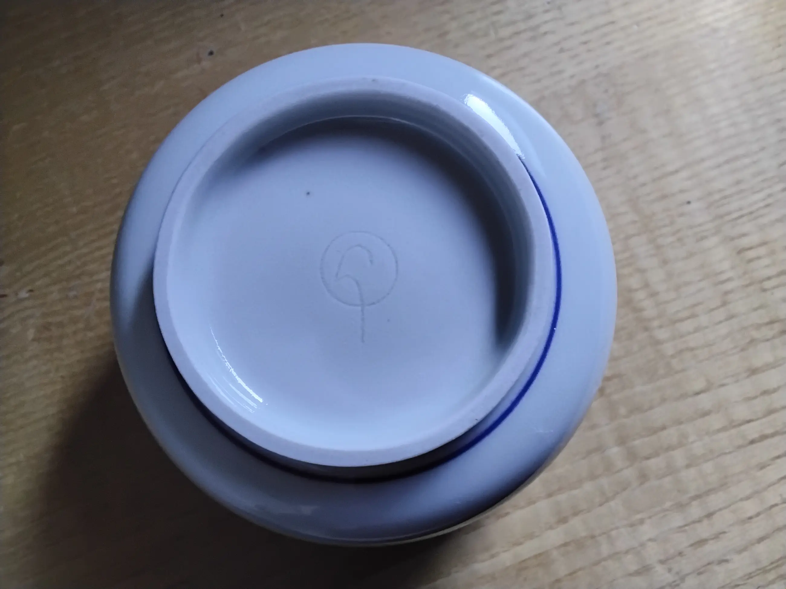 Dekselpot, typisch Leen Quist. Gedecoreerd met strakke lijnen. Bolle deksel. 1979 of 1980.
