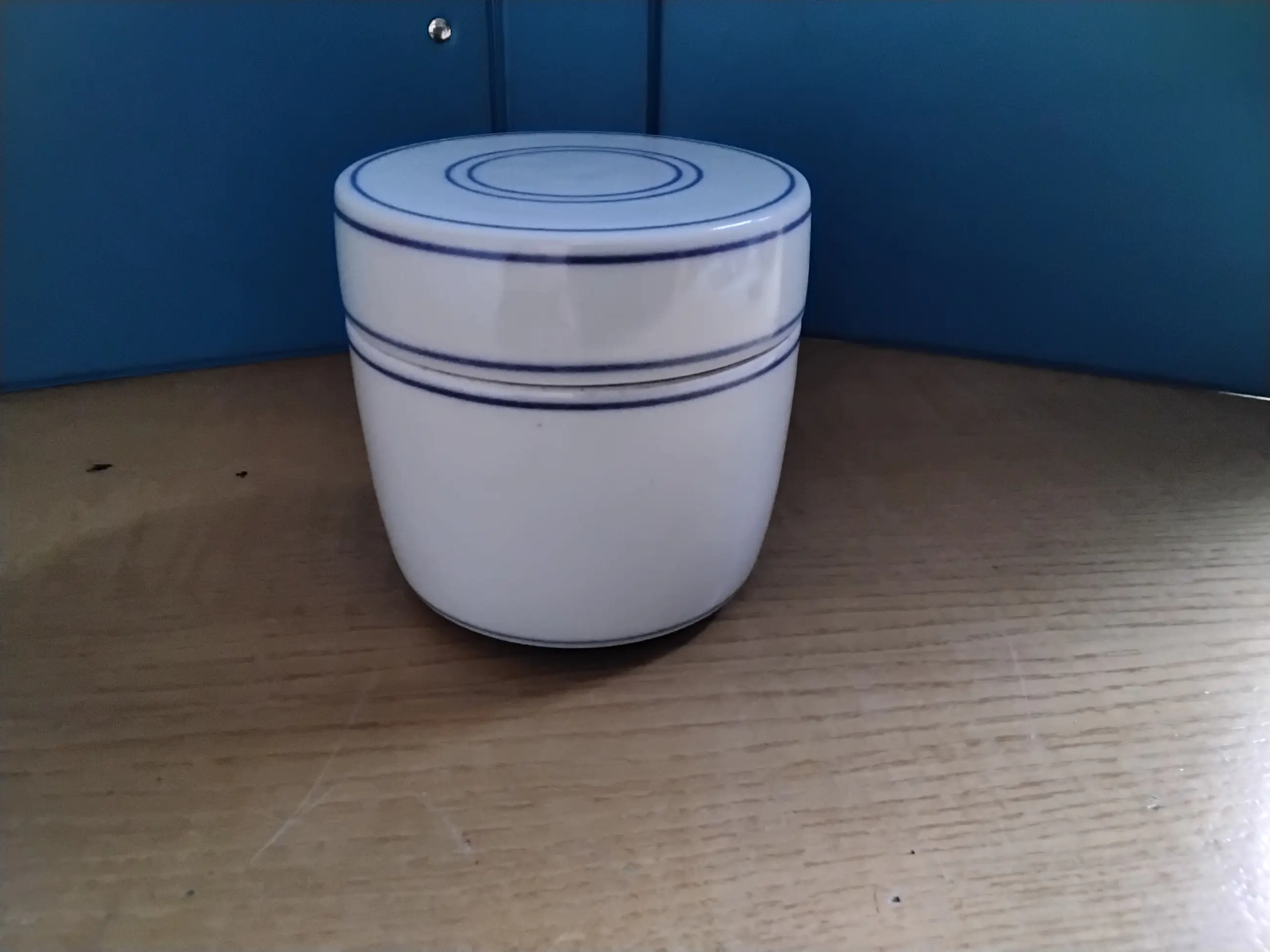 Dekselpot met strakke lijnen decoratie, typerend voor Leen Quist. Platte deksel. Gemaakt 1979 of 1980.