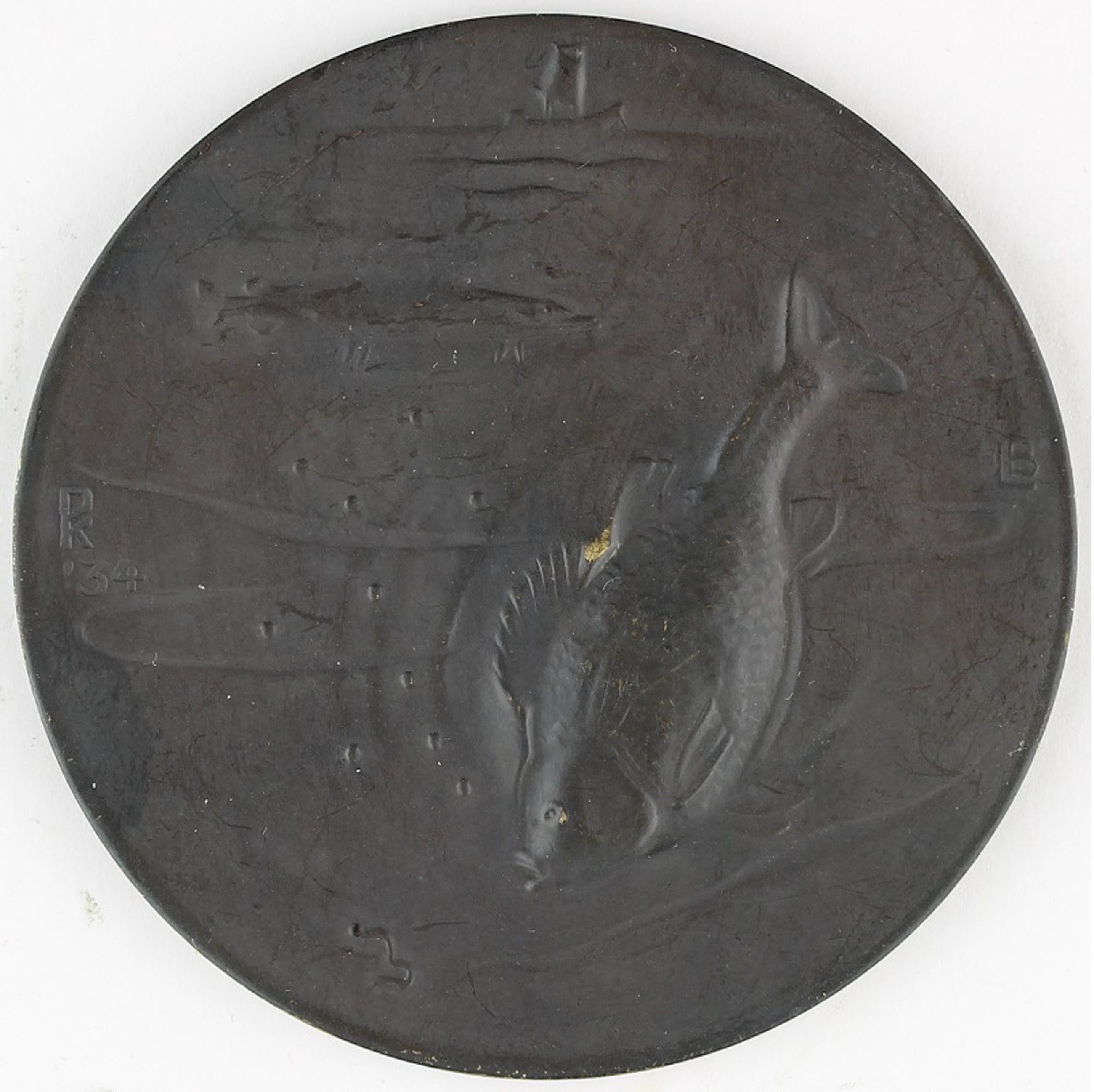 Na Tjipke Visser in 1930 werd door het bestuur een vrije opdracht verstrekt aan de Rotterdamse beeldhouwer Bolle; een traditie die zich tot op de dag van vandaag heeft voortgezet. De voor- en keerzijde zijn geheel gelijkwaardig. Met het thema 'lucht en water' ging Bolle aan de slag; een vogel voor de lucht en vissen voor het water. De lucht wordt geaccentueerd door een bootje onder op het vlak, het water door door een bootje boven in het vlak. Vooral de vogel - mogelijk Baudelaire's Albatros als symbool voor de vlucht van de potische verbeelding - is ruimtelijk mooi opgelost: de vleugels gaan mee met de cirkel en geven een indruk van zwevende lichtheid waar het idee van ruimte en afstand door een bootje op de achtergrond geboden wordt. De vissen zijn nog naturalistischer dan de vogel. Een stilerend - en daarmee een daterend - element zijn de rimpels op het water en de luchtbelletjes. Vissen zijn een in de Jugendstil geliefd onderwerp; en een in Nederland gexploreerd thema van de schilder Dijsselhof. Zij zijn symbolen van stilte en geheimzinnigheid en het bewijs van de in de Romantiek opgekomen gedachte dat er naast de mensenwereld ook andere, geheel zelfstandige universa bestaan. #Louk Tilanus, Handzame Sculptuur