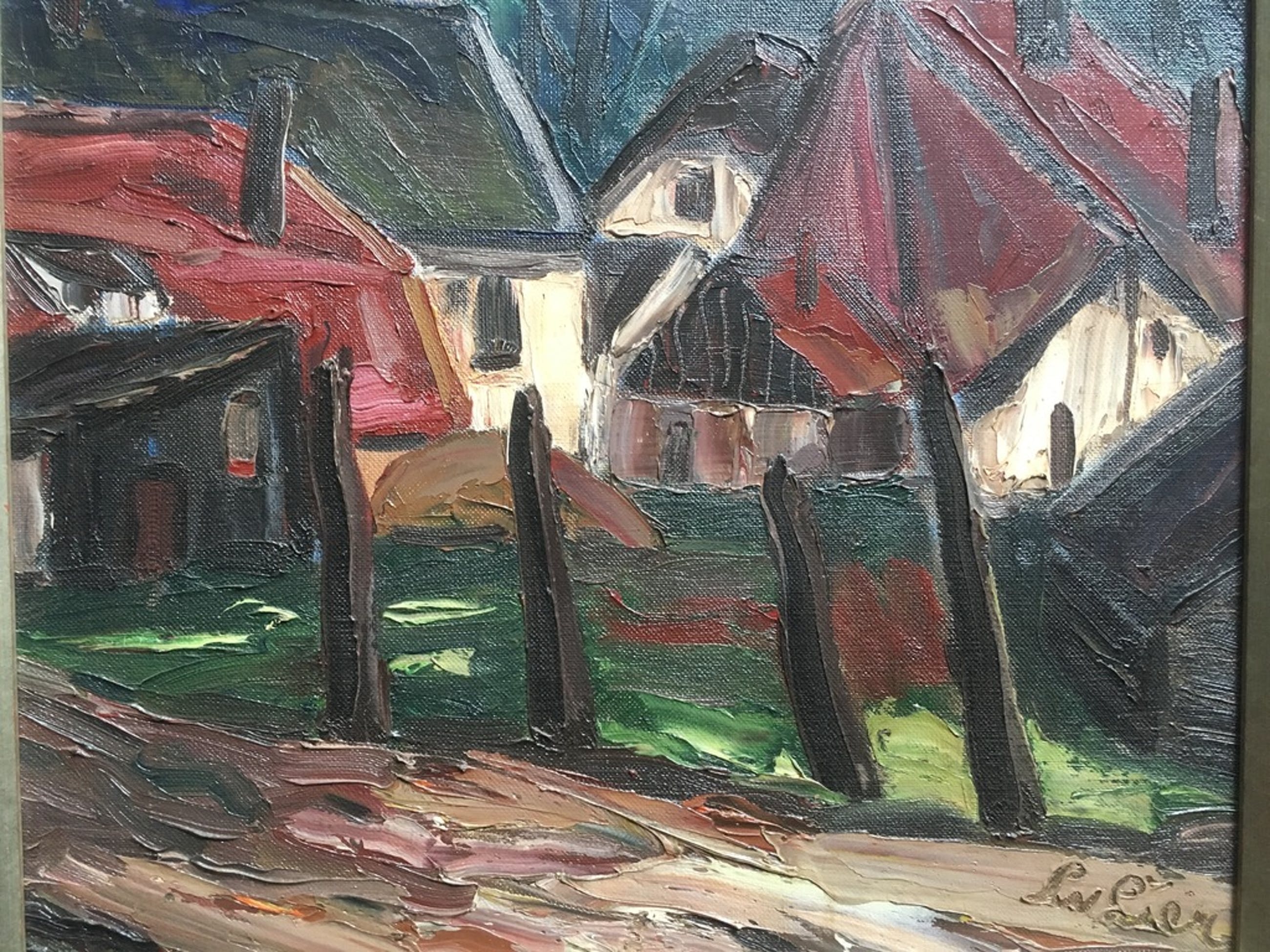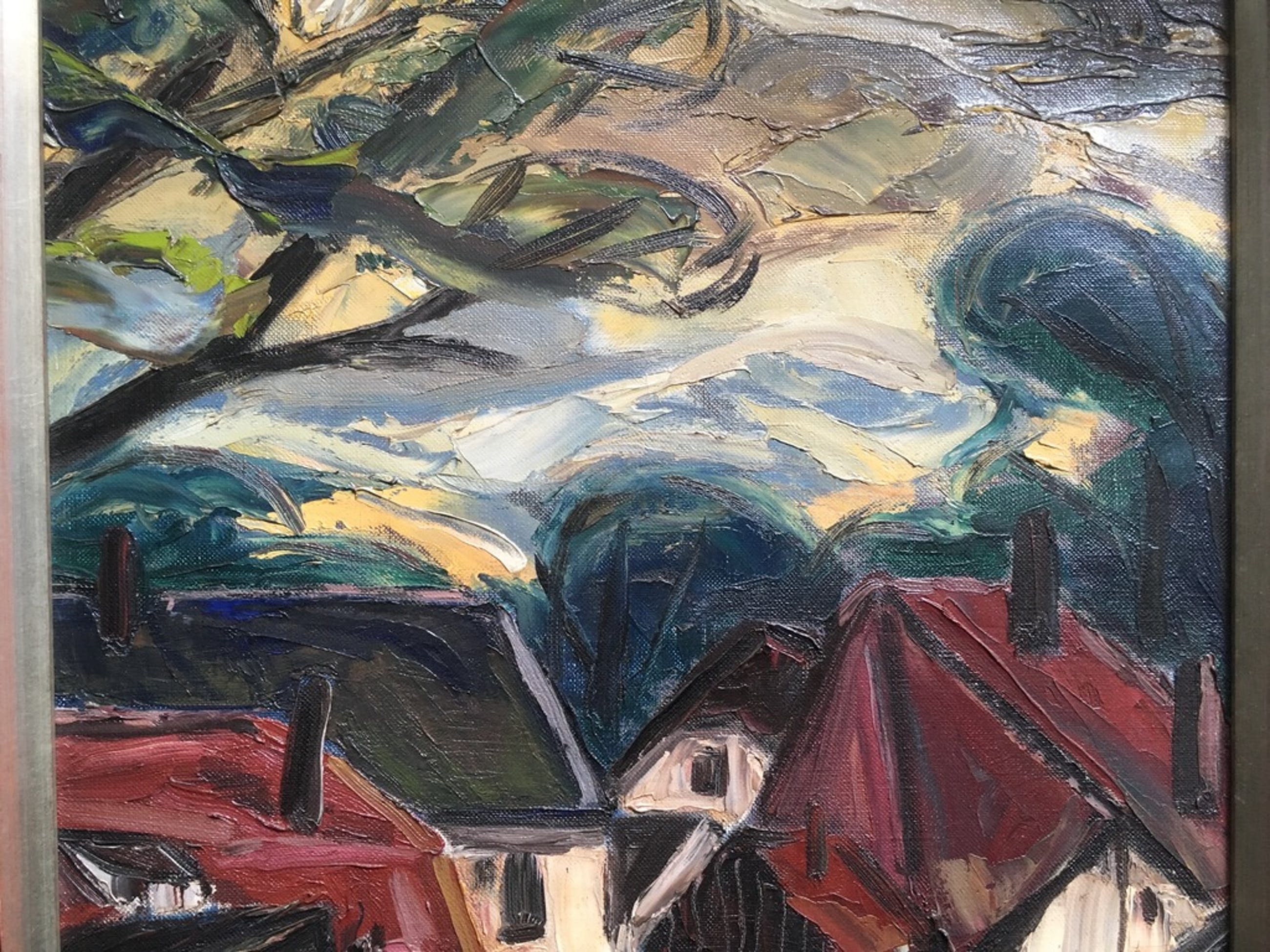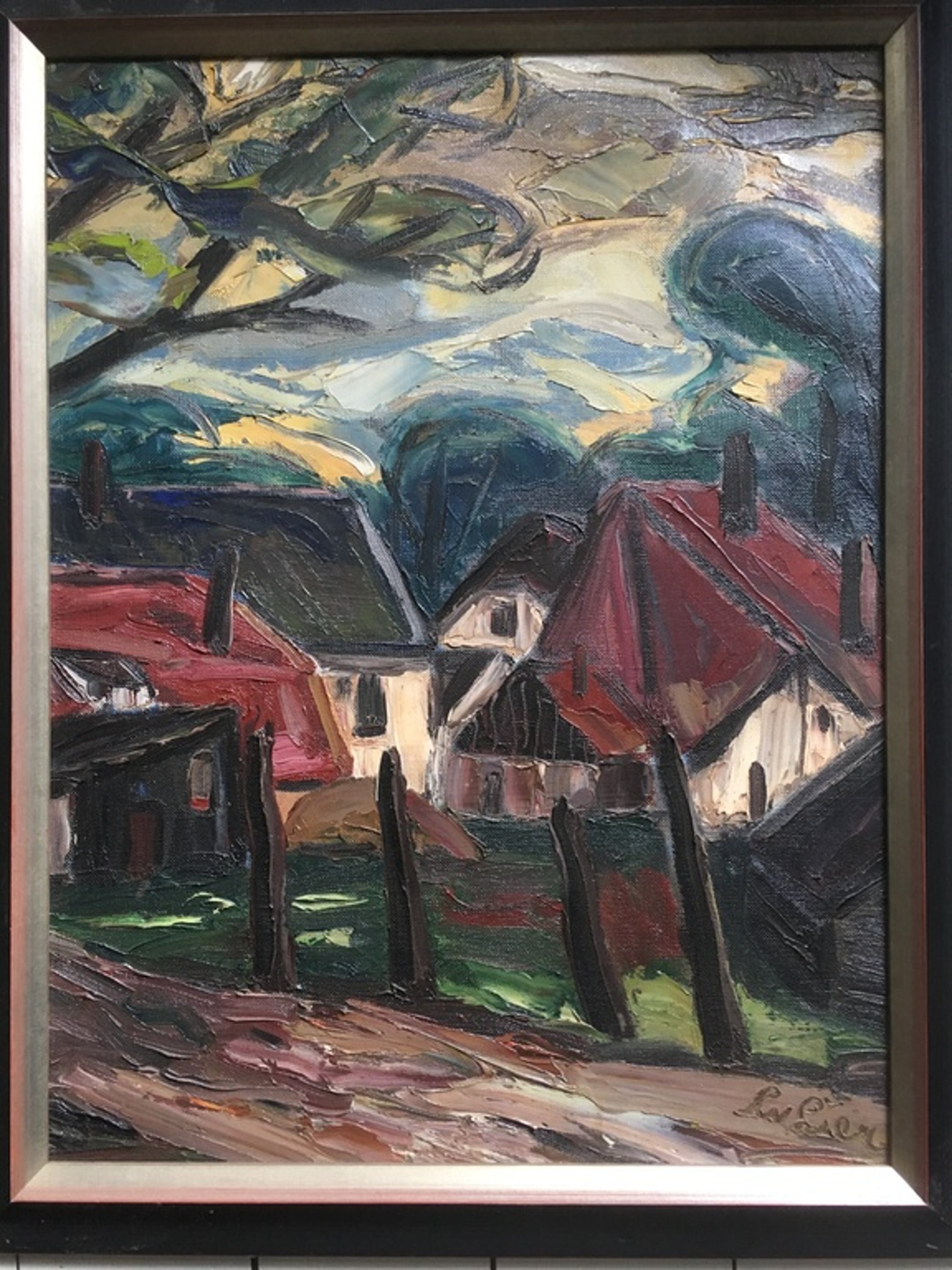 Het formaat van dit krachtige schilderij is 48x60 cm, in donkere lijst met een zilveren binnenrand: 60x76 cm.
