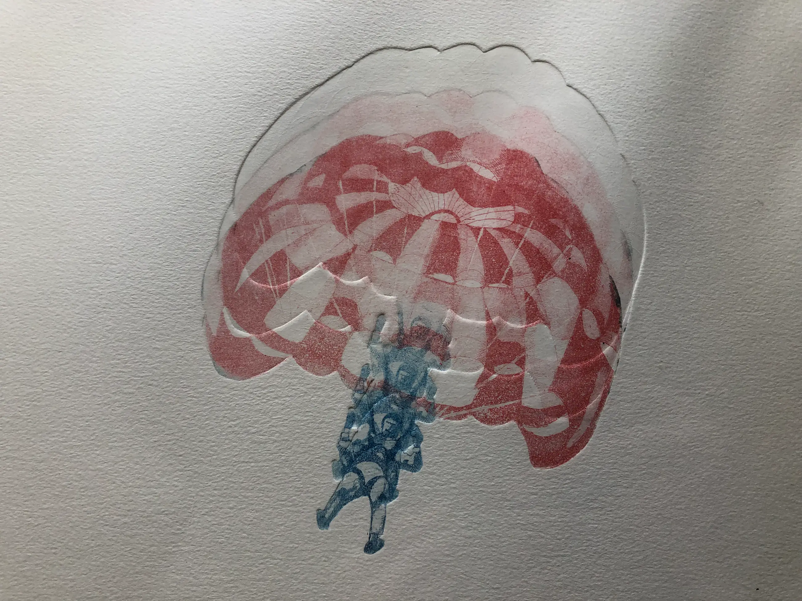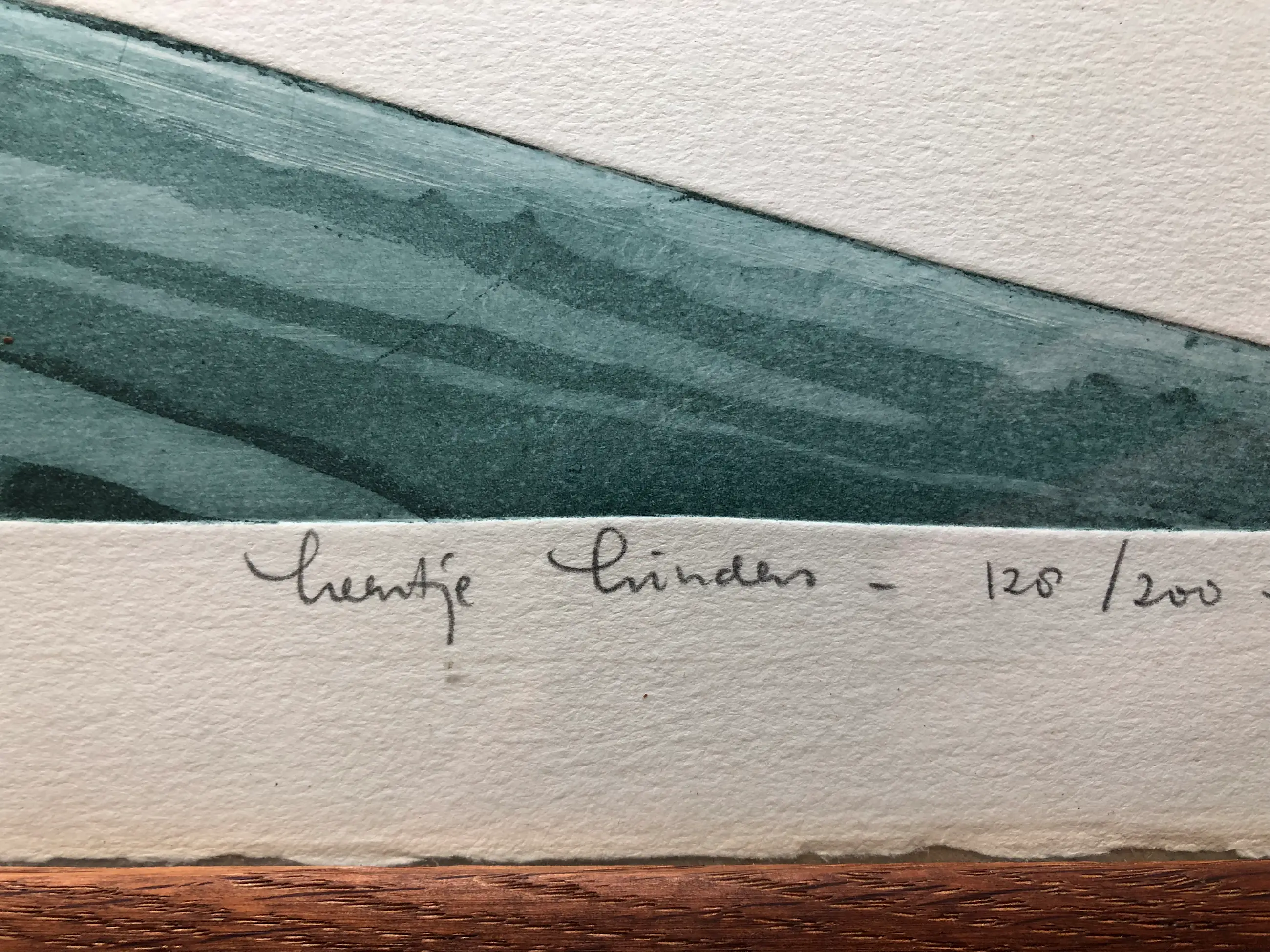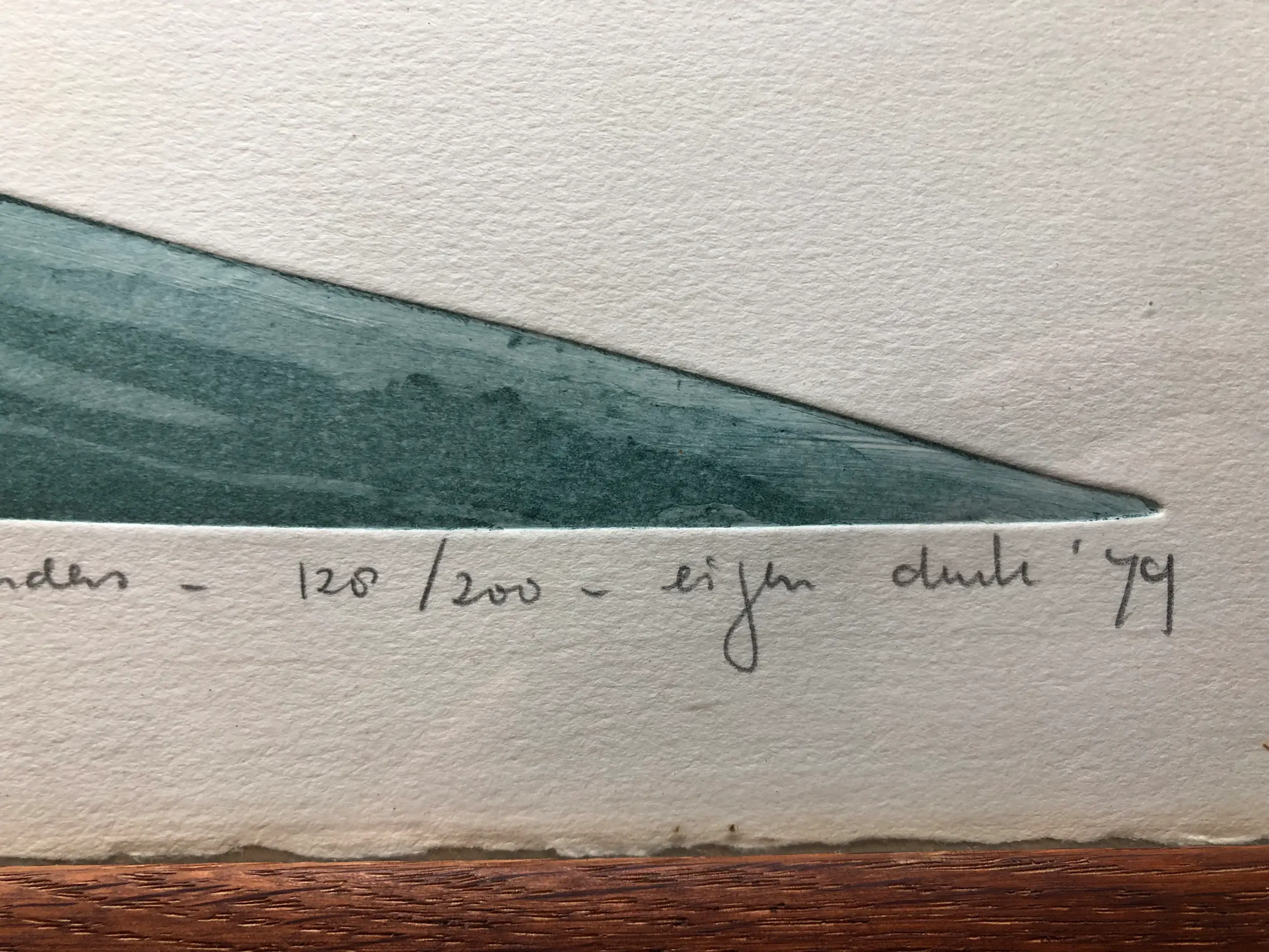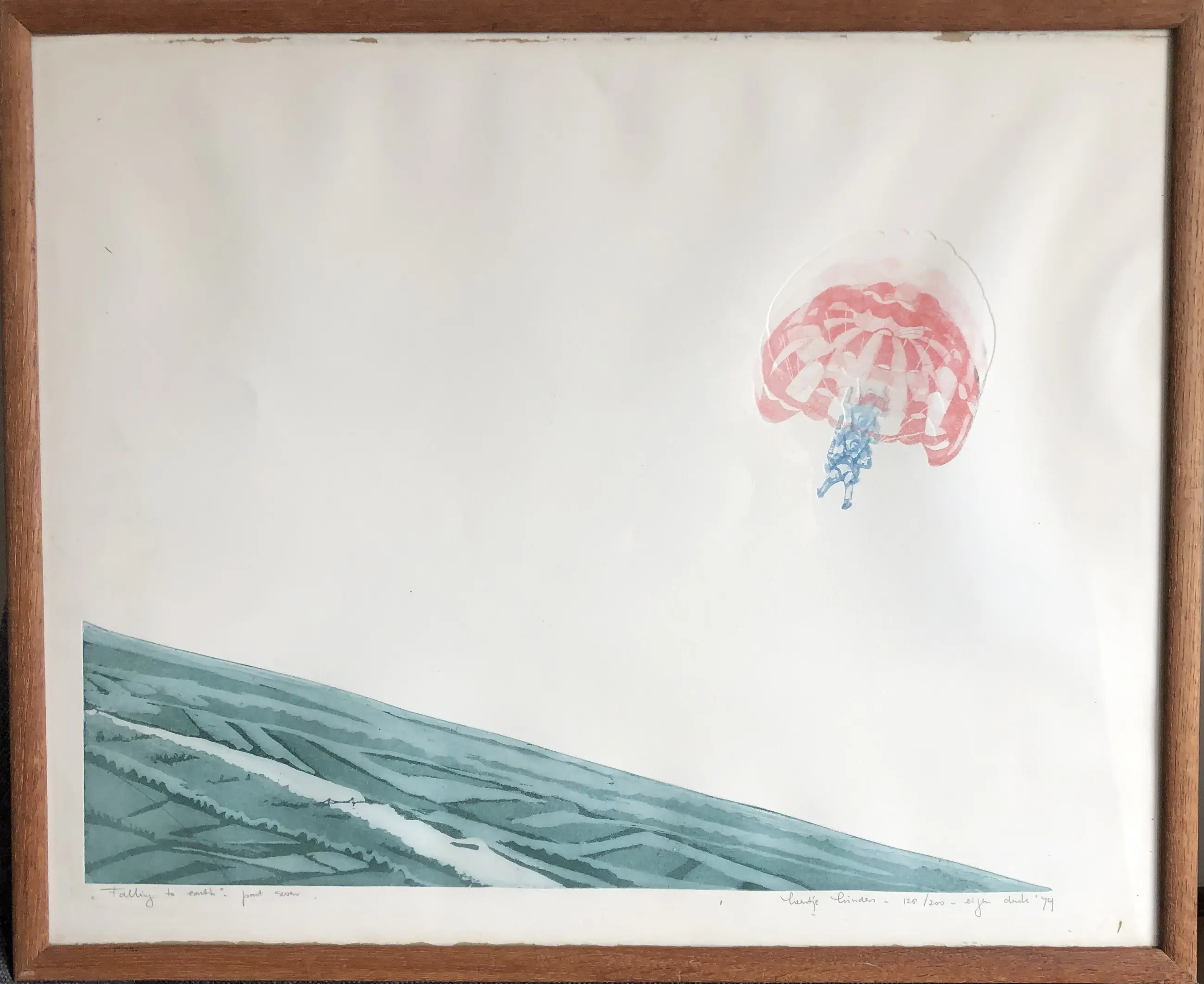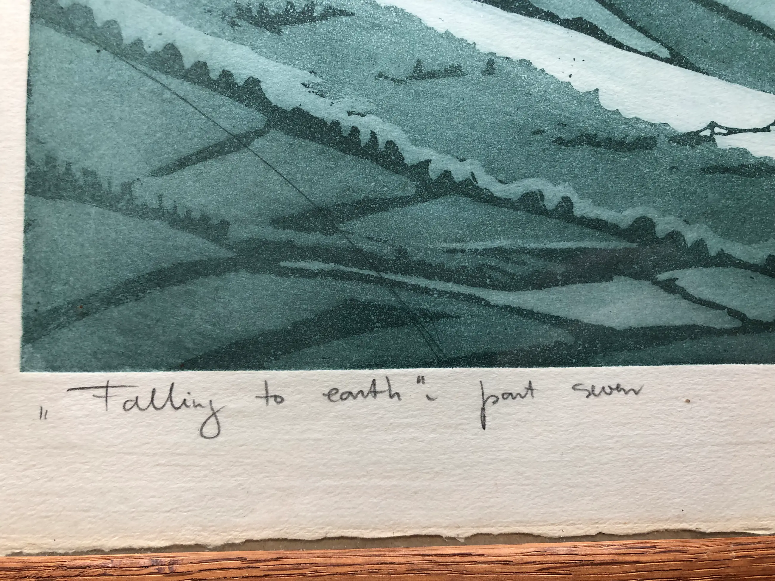 Uit de bekende serie "Falling to earth", part seven. Eigen druk, 128/200. Het papier zit niet goed in de lijst en bolt een beetje, maar dat kan verholpen worden door opnieuw in te lijsten. Aan de randen is het papier wel beschadigd, zie foto's.