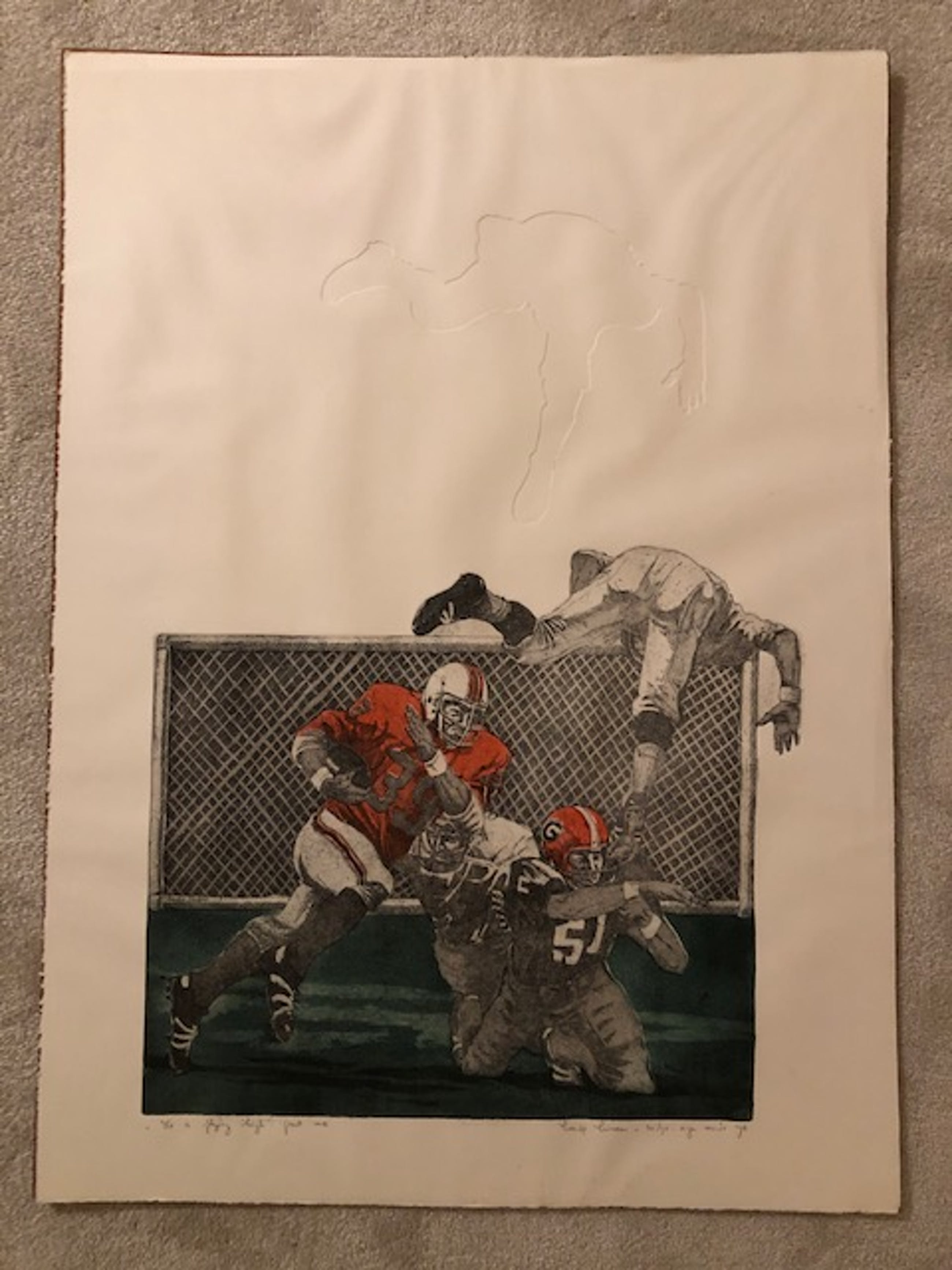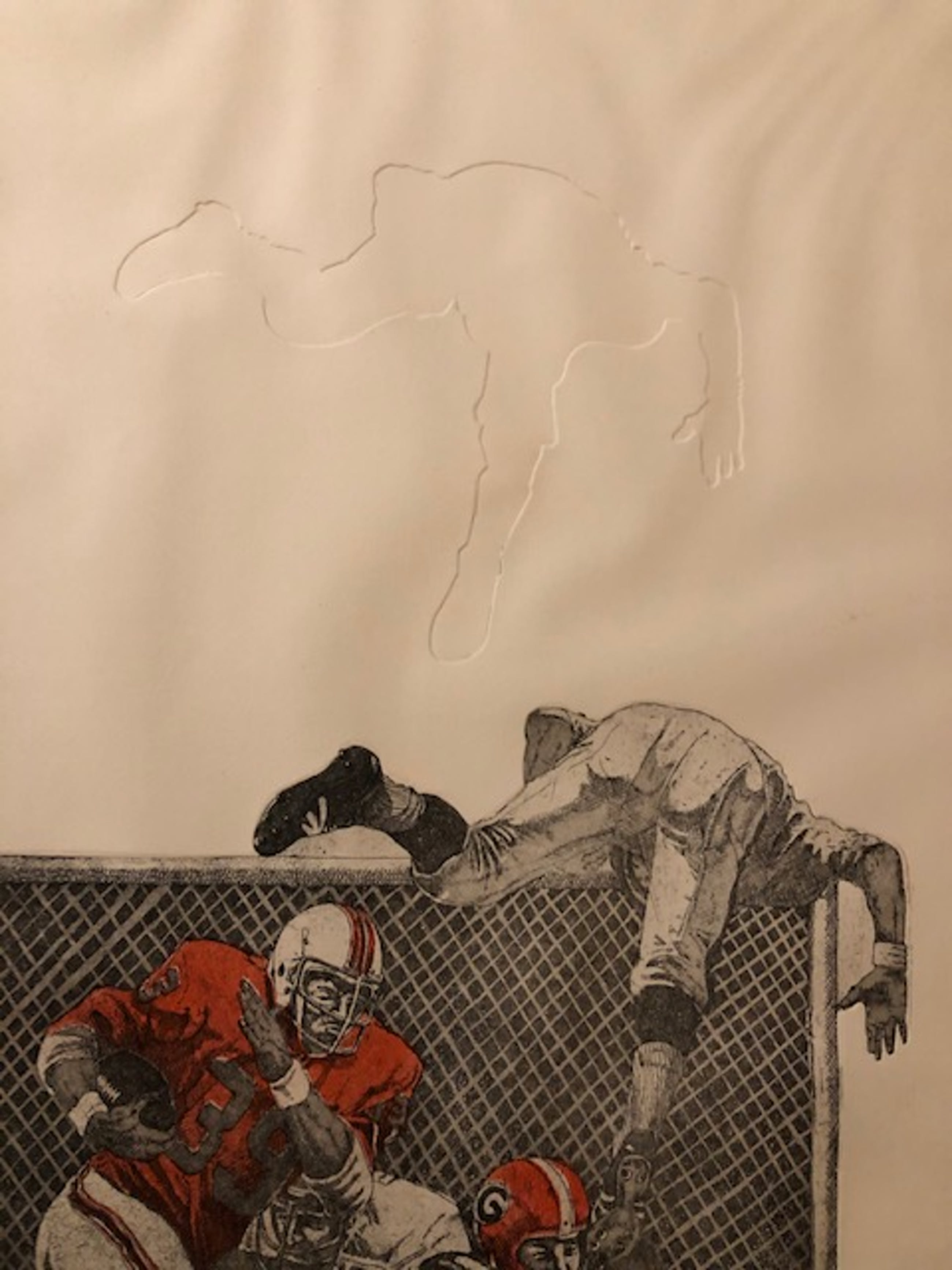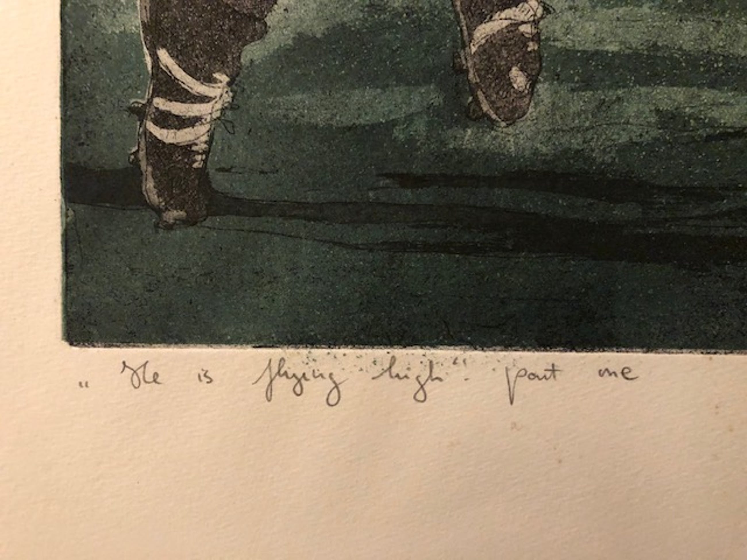 Ets met diepdruk 'He's flying high, part one'. Honkbal. Eigen druk (30 uit serie van 75). Gekocht van de kunstenaar in haar atelier in Sijbekarspel.