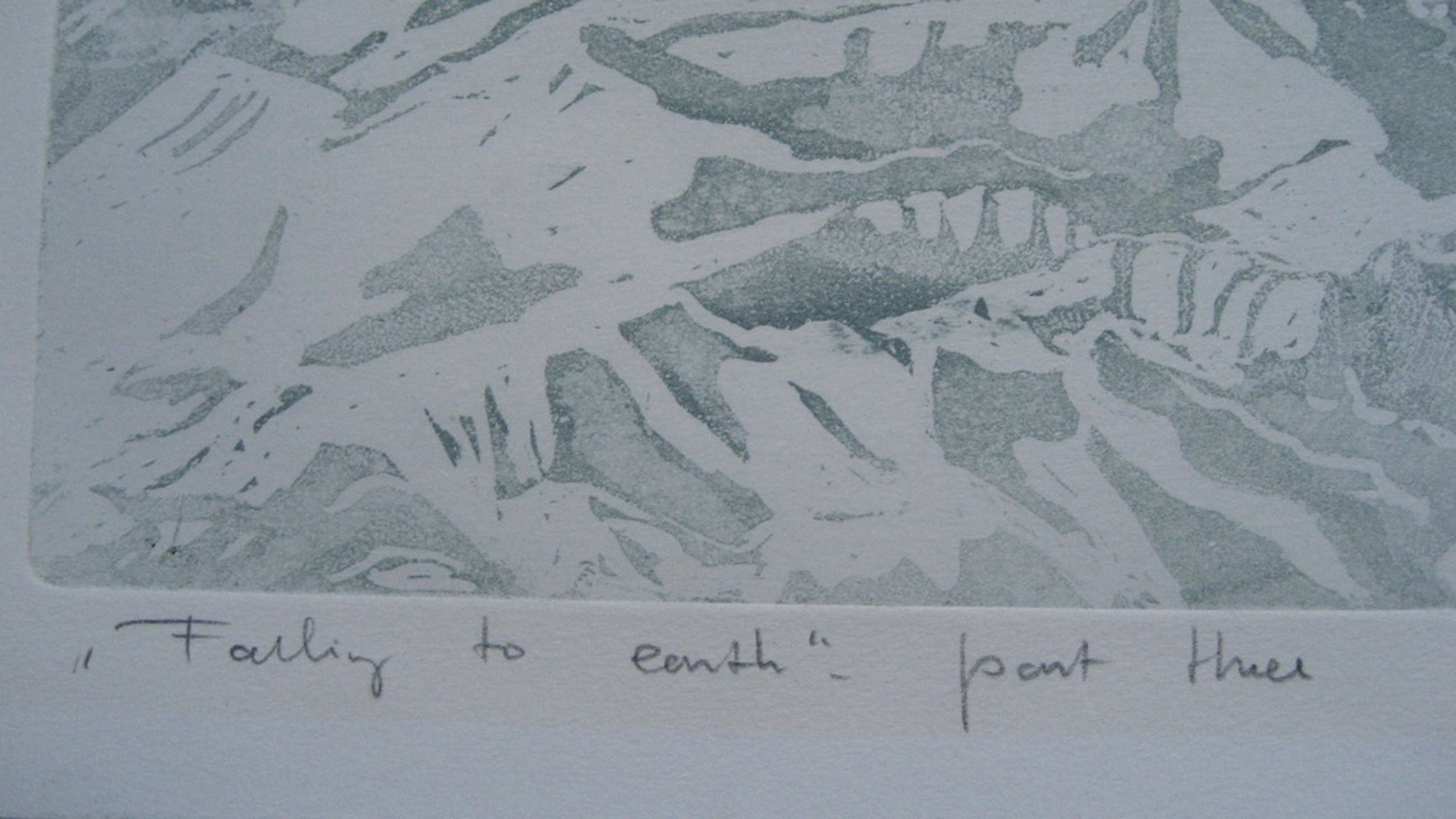 Kleurenets met blinddruk van Leentje Linders, getiteld "Falling to Earth", part three. Het werk is met potlood gesigneerd en voorzien van 13 / 30 - II - eigen druk - '77. Het blad is 56 x 78 cm, de afbeelding ongeveer 52 x 70. Losbladig. De conditie is goed, het werk is eerder ingelijst geweest, getuige plakbandresten op de achterkant. De ets is afkomstig uit de collectie van ABNAmro.