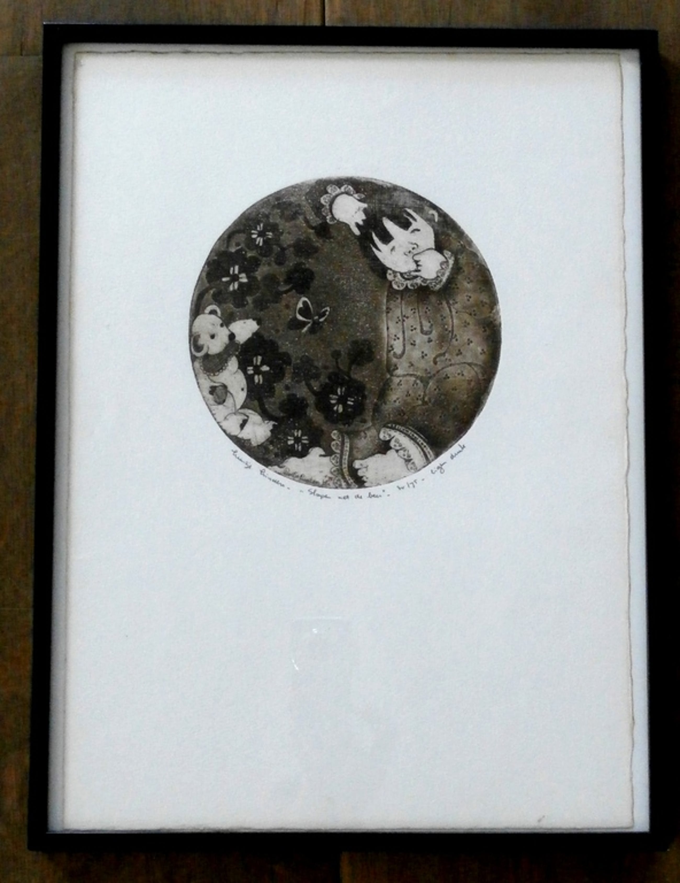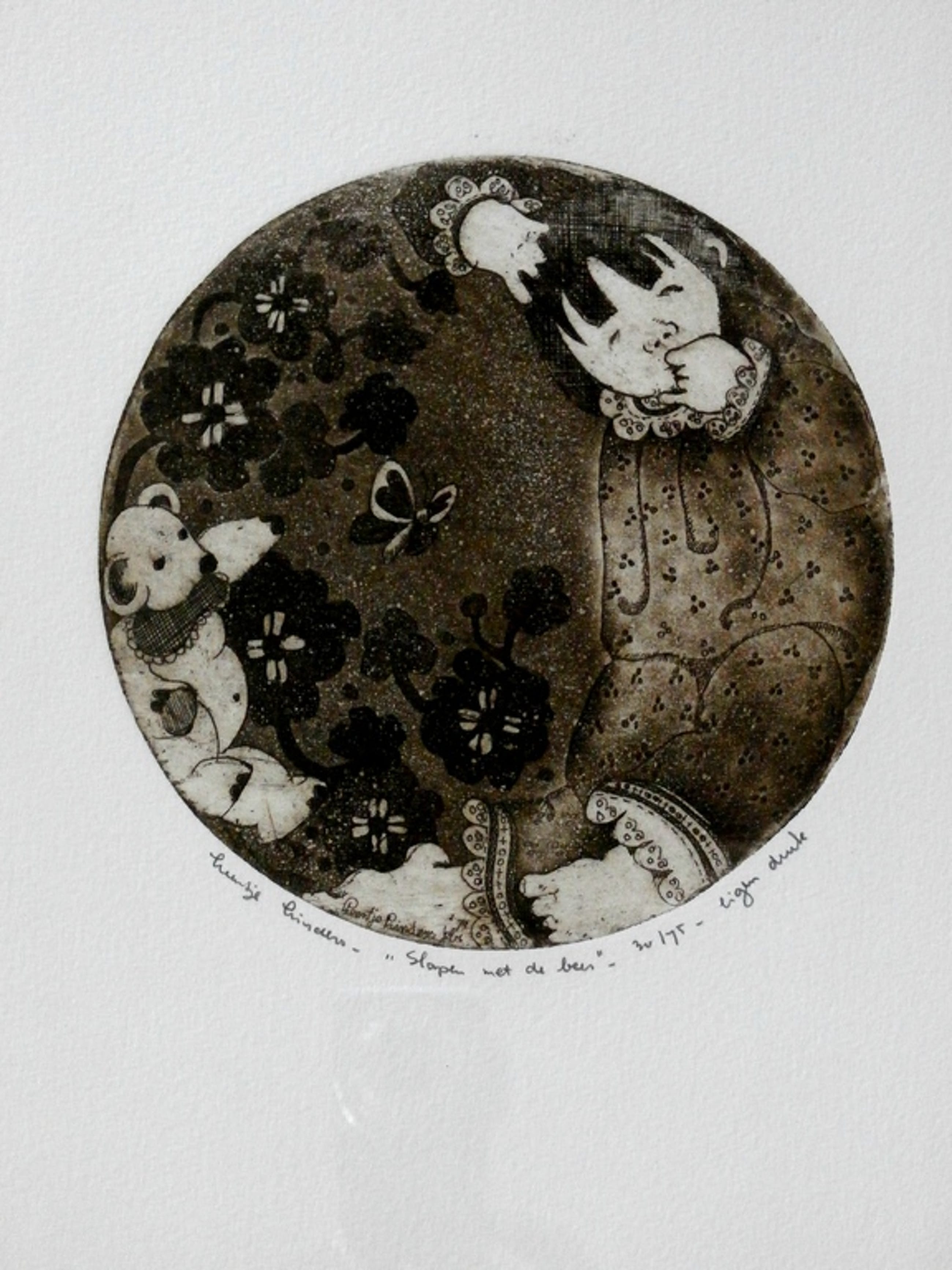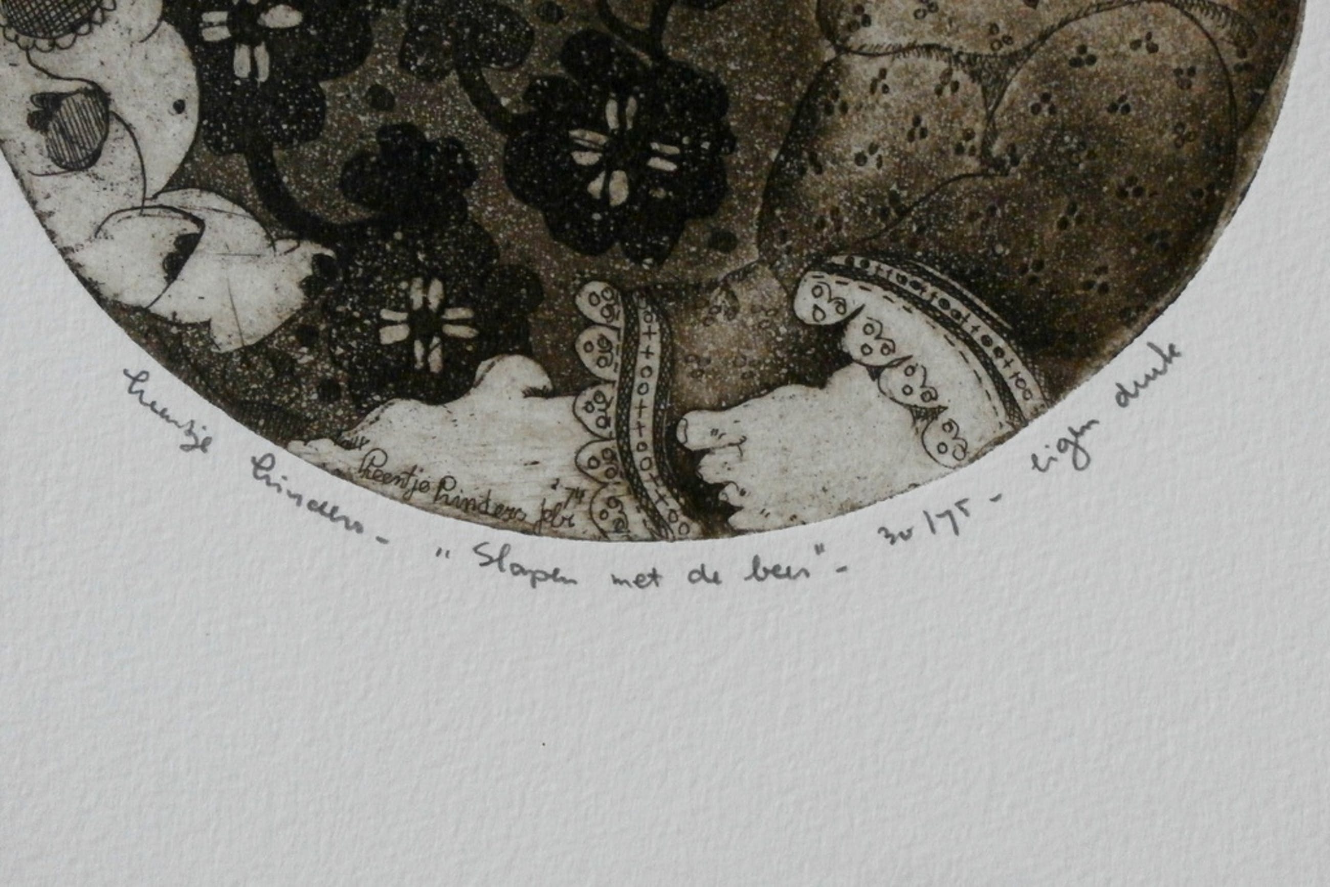 Ingelijste ets van Leentje Linders met de titel "Slapen met de beer". Nummer: 30/75. Afmetingen incl. lijst: H41 x b31 cm. Afmetingen voorstelling: h15,5 x b15,5 cm. Conditie: in goede staat. De authenciteit van dit werk wordt volledig gegarandeerd. Een certificaat van echtheid kan, op verzoek, worden meegestuurd.