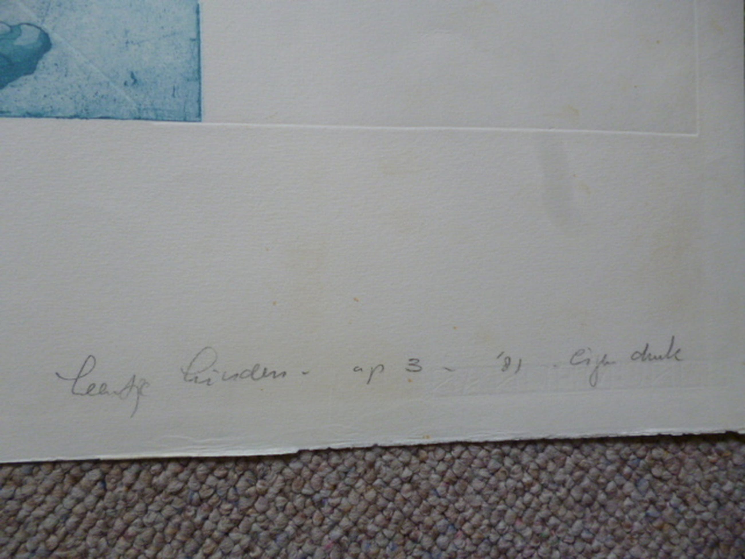 Kleurenets met reliëfdruk uit 1981. Potlood gesigneerd, gedateerd en genummerd "a.p. 3 " rechtsonder.