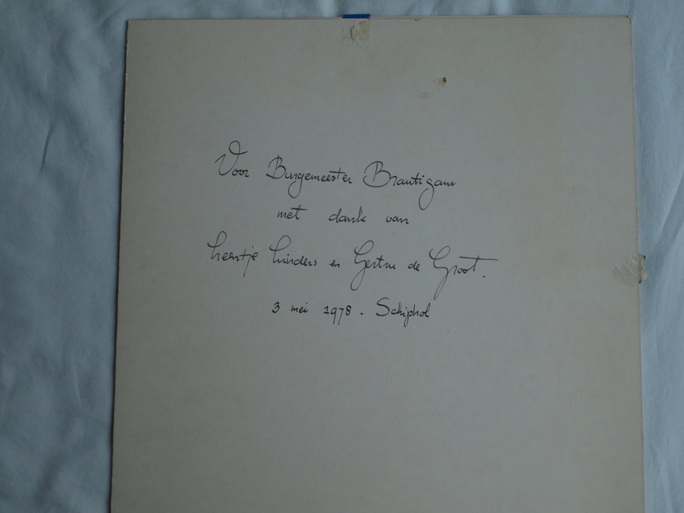 -De ets is niet ingelijst en ook nooit ingelijst geweest. De ets zit in een papieren omslag met een geschreven boodschap van de kunstenares (“Voor burgemeester Brautigam........”).