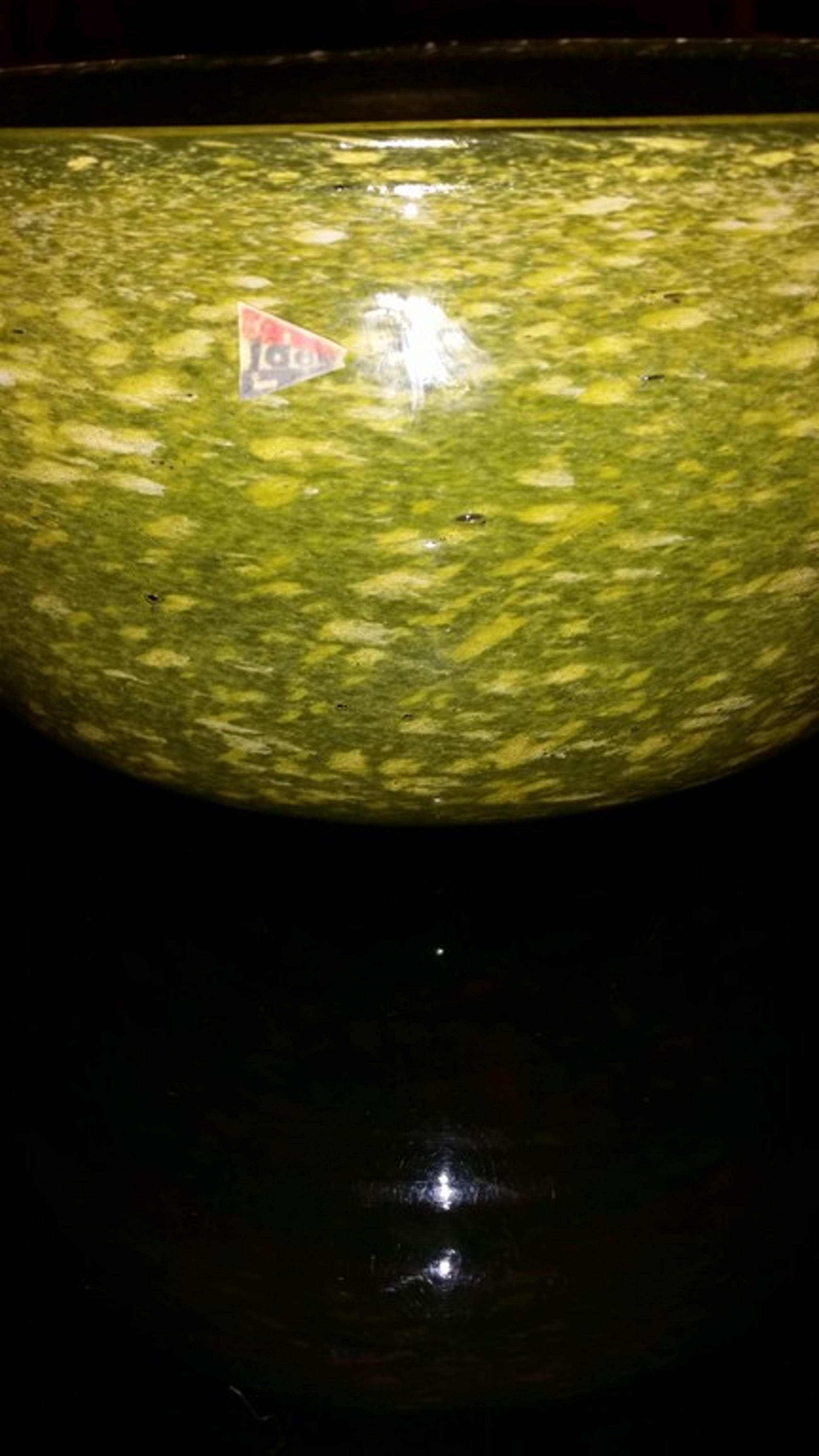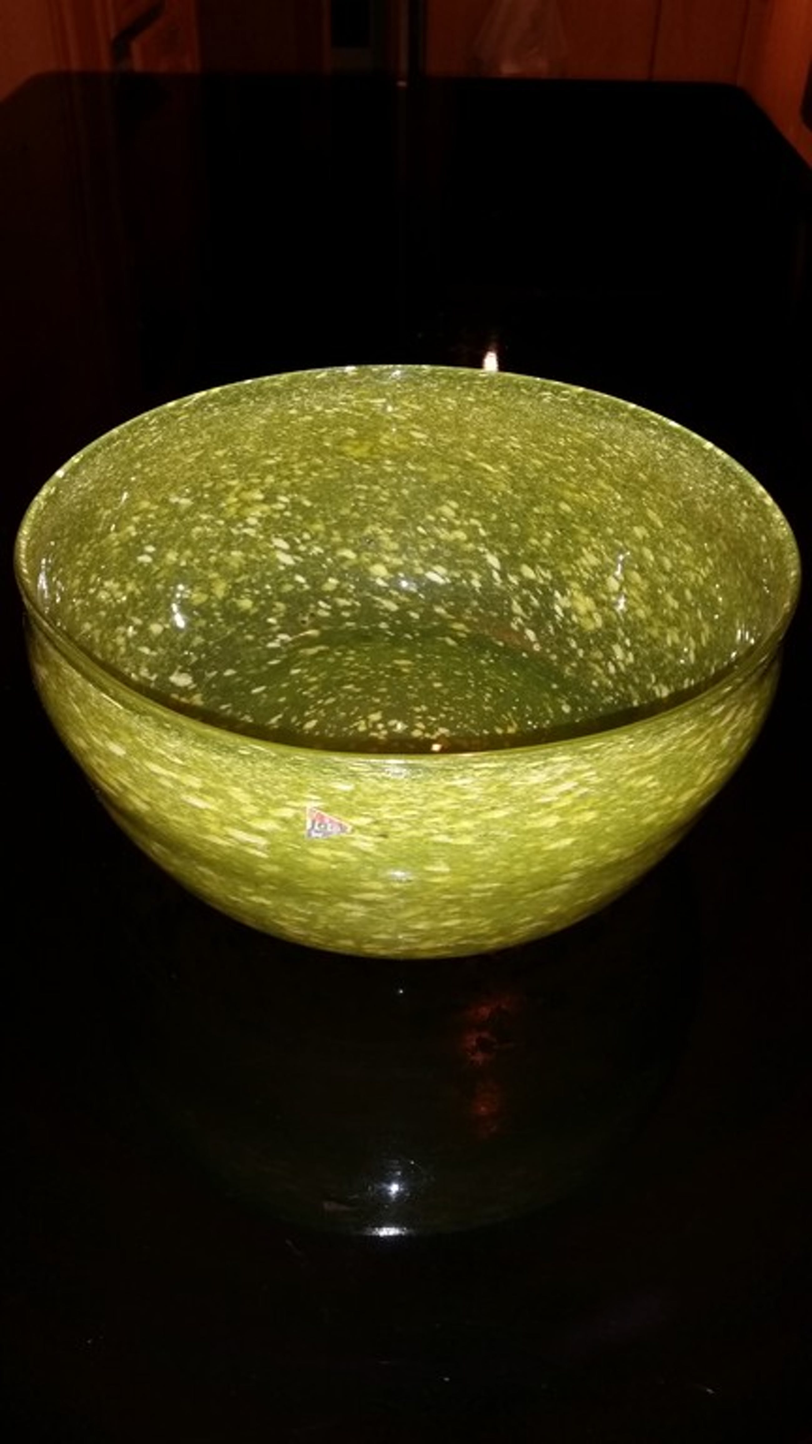 Leerdam glazen zware schaal uit eind jaren 20 de schaal is geel met witte vlokken en zwarte stippen en licht heel mooi op in het licht als het donker is
