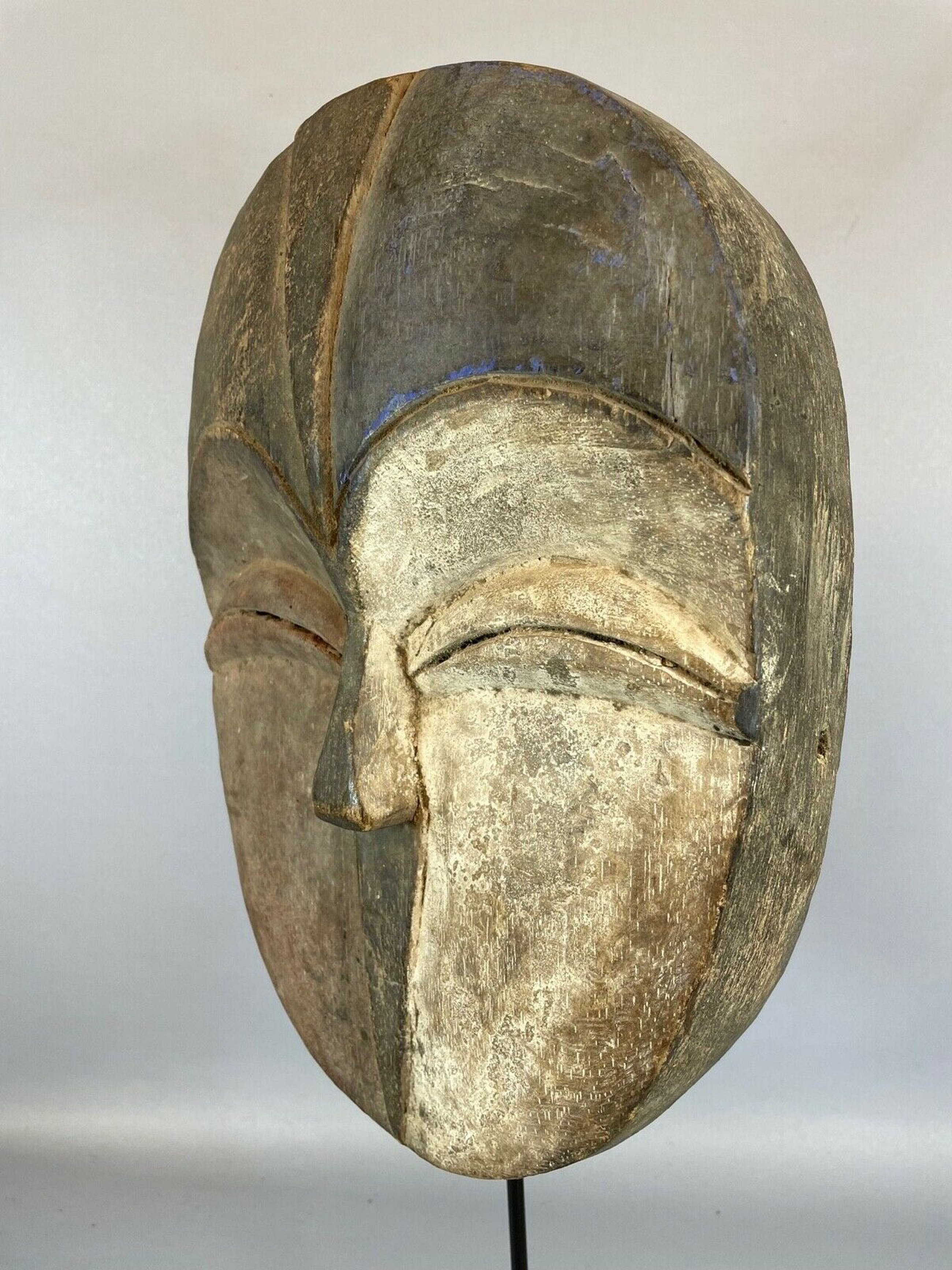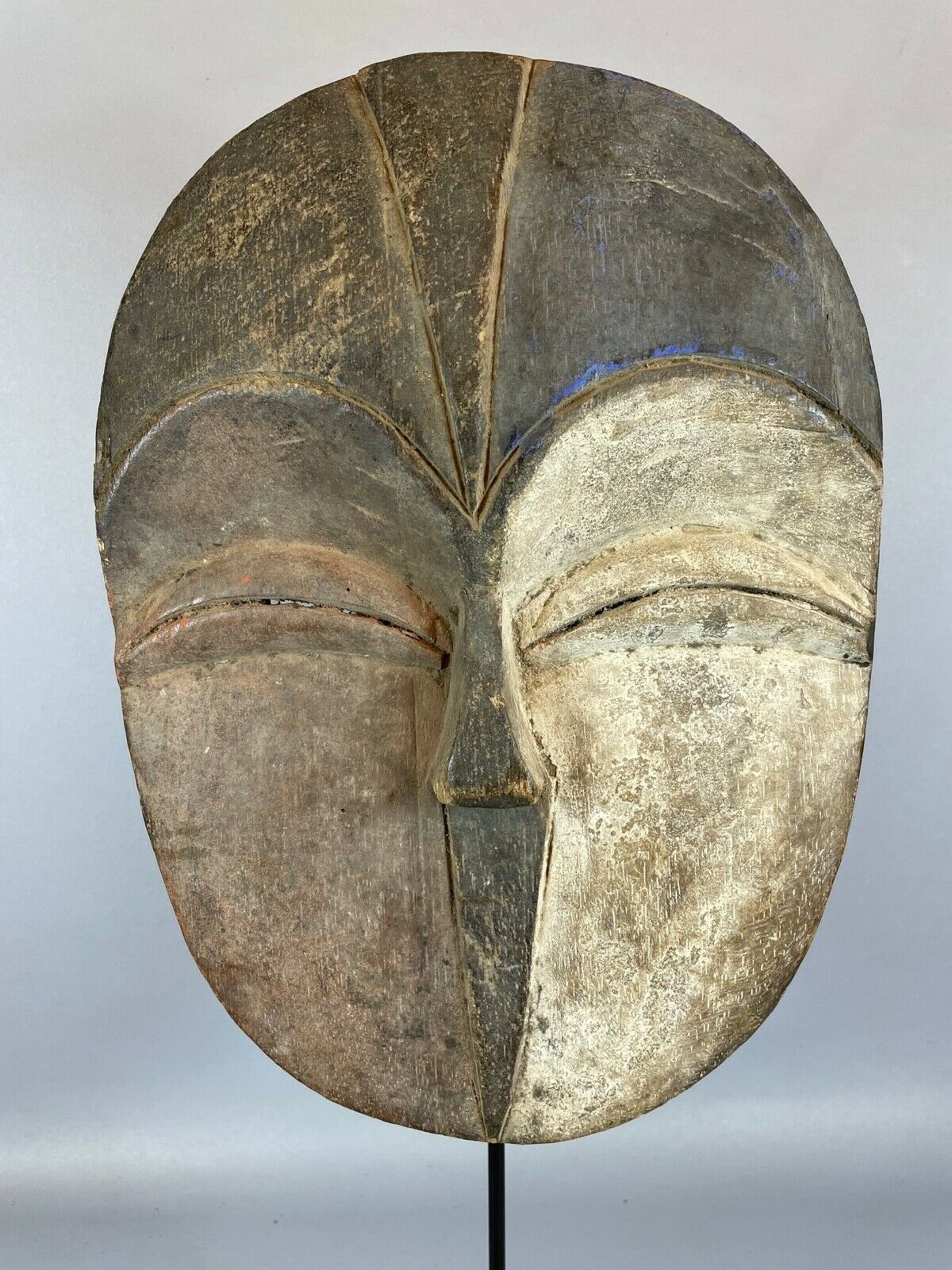 Some artwork can only be seen, handled or owned by the highest grades of the society. The objects are typically small and simple in form, and have a striking patina that derives from being handled or worn on the body. Ivory objects usually have russet or yellow patinas. The masks are fairly standardized, although the most important masks with special ritual use or symbolic meaning may have distinctive design. A typical mask will have a concave heart-shaped face. The forehead protrudes slightly, the nose is narrow, eyes are slits and the mouth is slightly open. Every time a mask is used it is rubbed with white clay, over time acquiring a white patina.