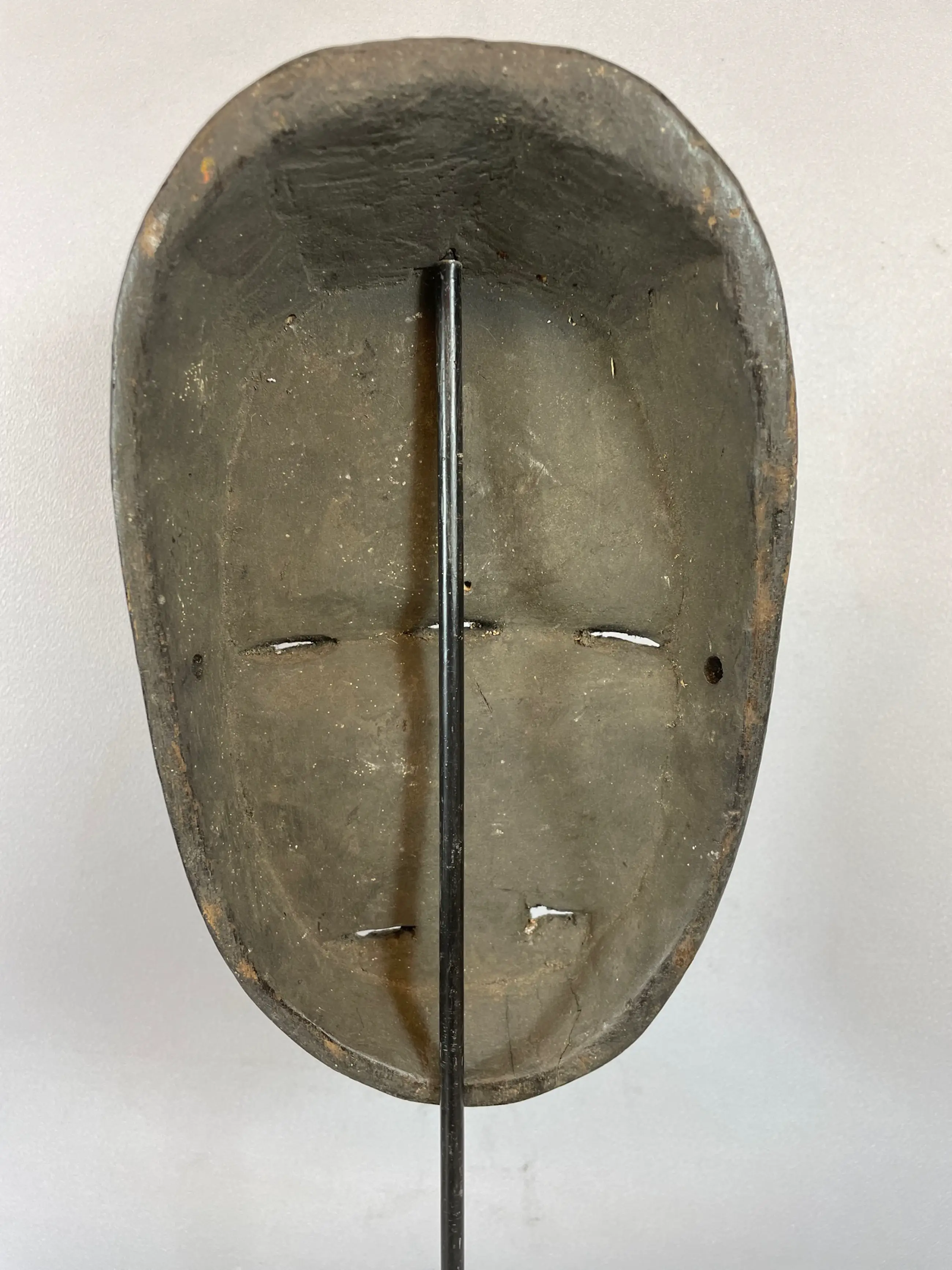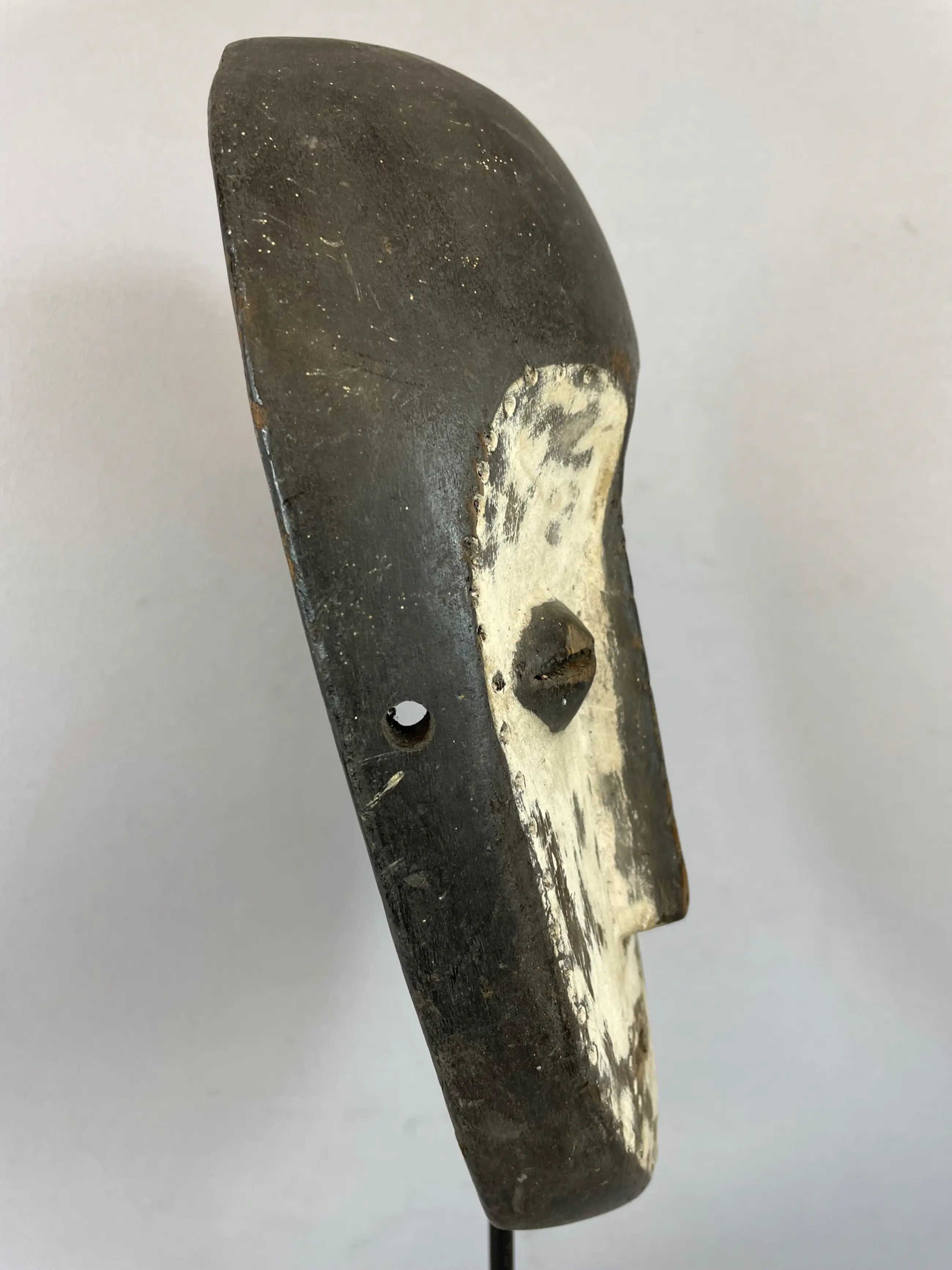 Some artwork can only be seen, handled or owned by the highest grades of the society. The objects are typically small and simple in form, and have a striking patina that derives from being handled or worn on the body. Ivory objects usually have russet or yellow patinas. The masks are fairly standardized, although the most important masks with special ritual use or symbolic meaning may have distinctive design. A typical mask will have a concave heart-shaped face. The forehead protrudes slightly, the nose is narrow, eyes are slits and the mouth is slightly open. Every time a mask is used it is rubbed with white clay, over time acquiring a white patina.