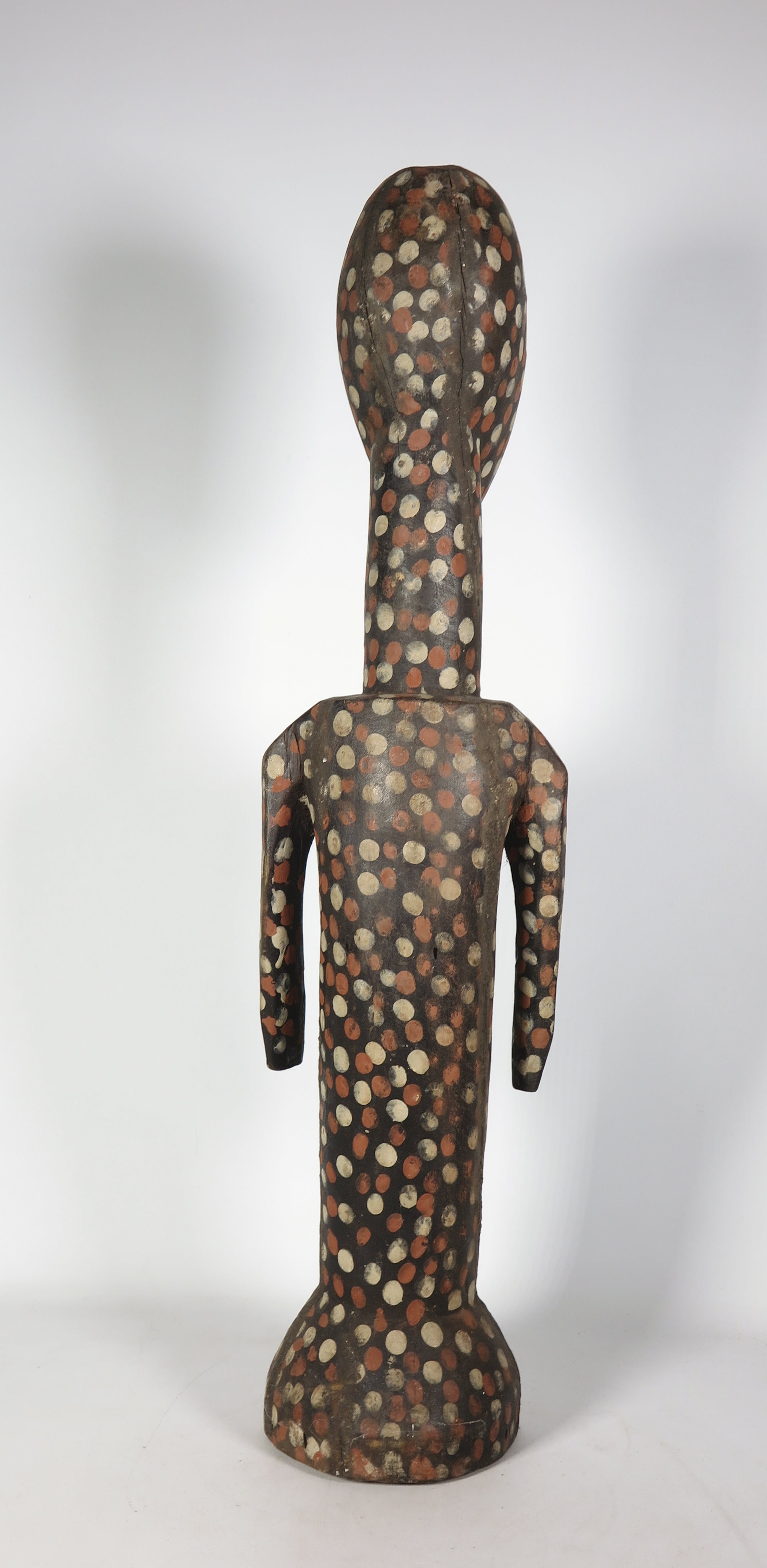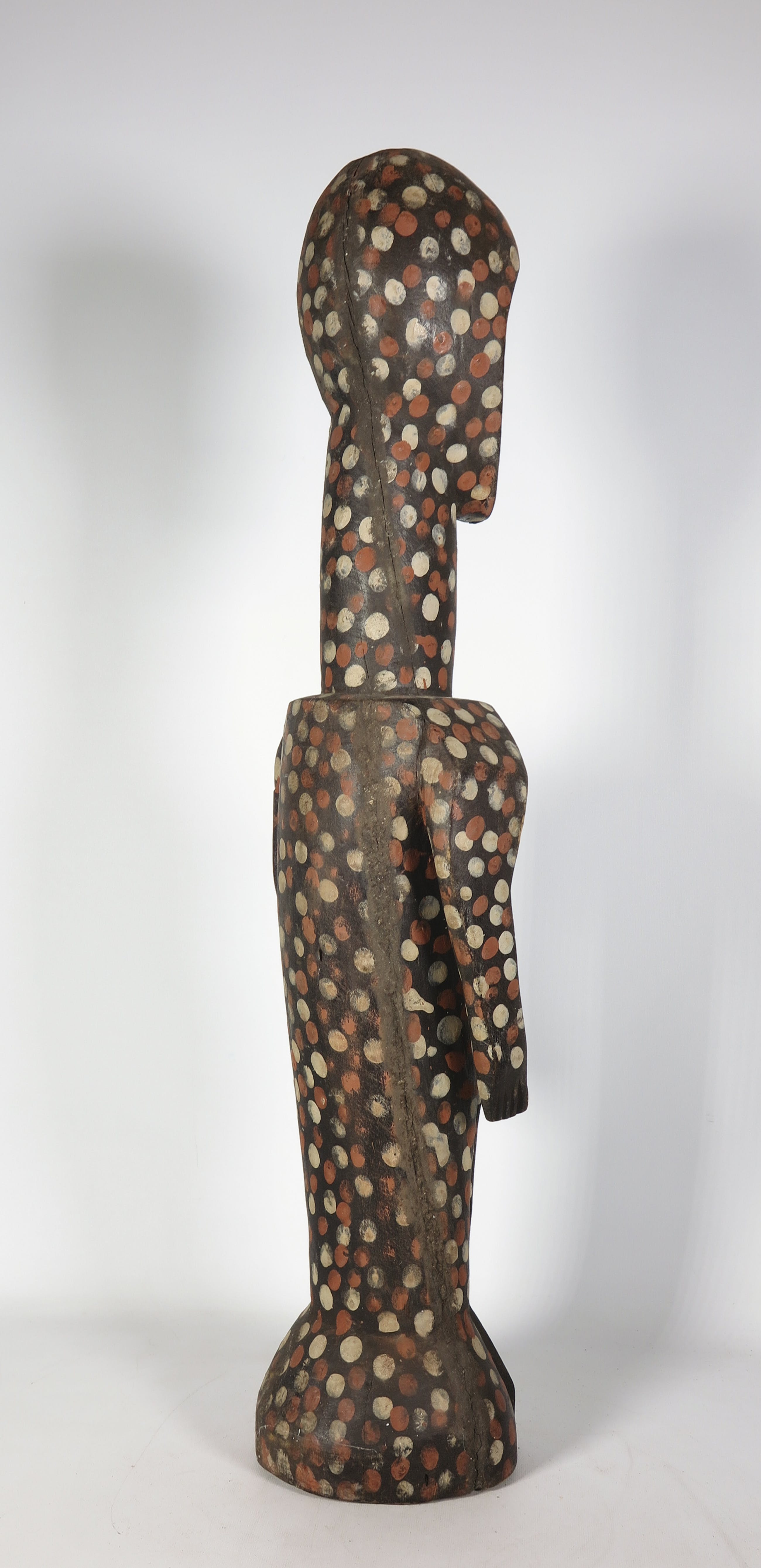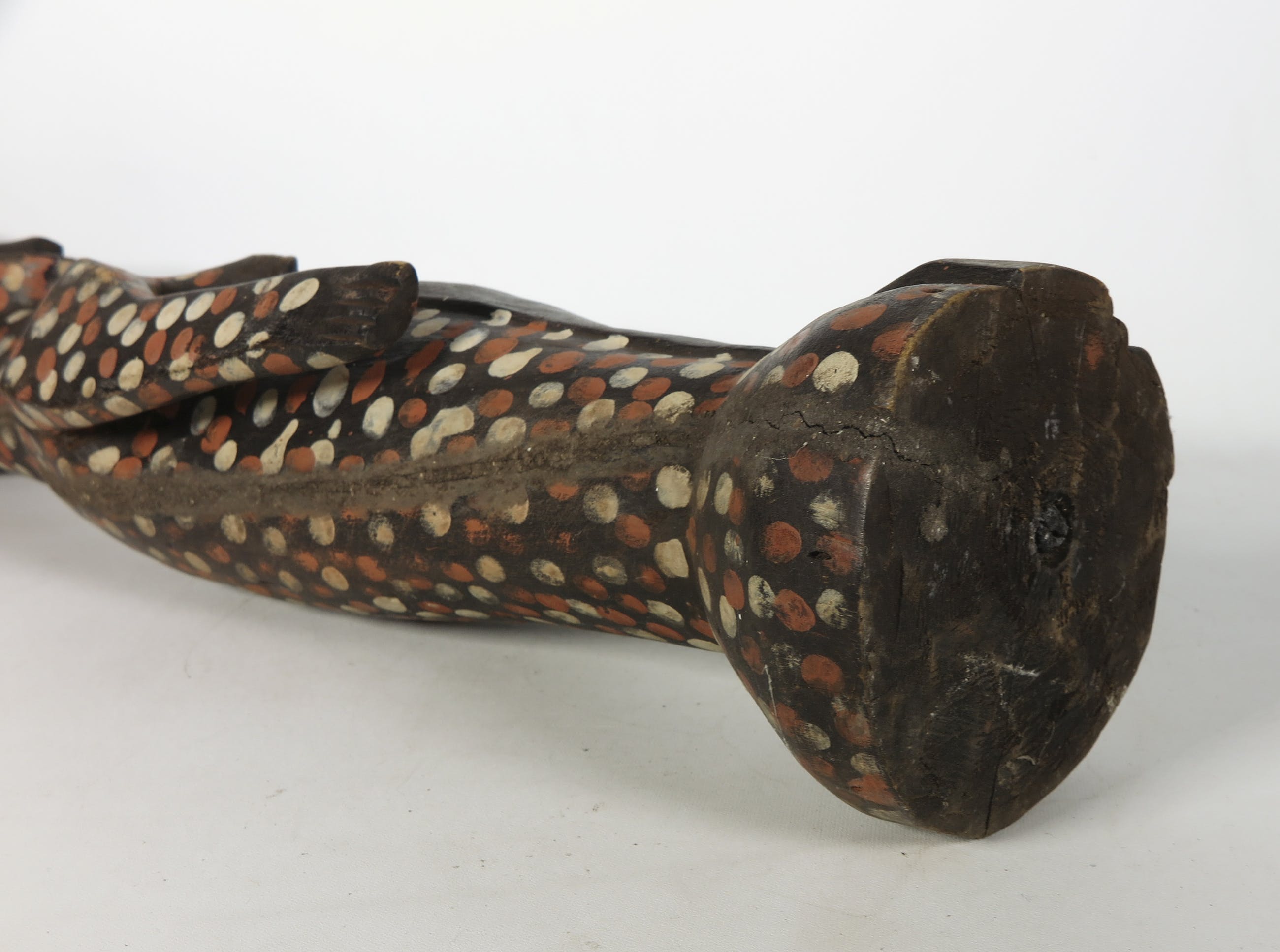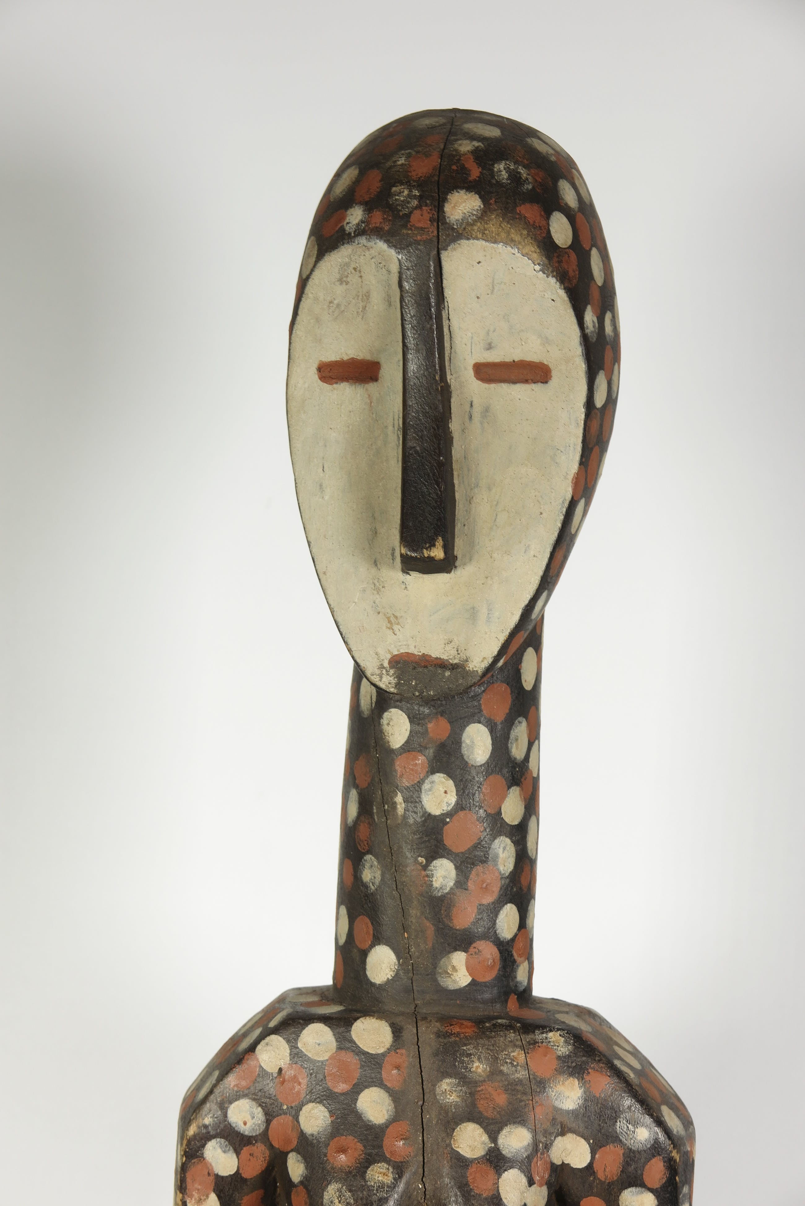 Houten gestoken beeld, beschilderd met rood en witte stippen.