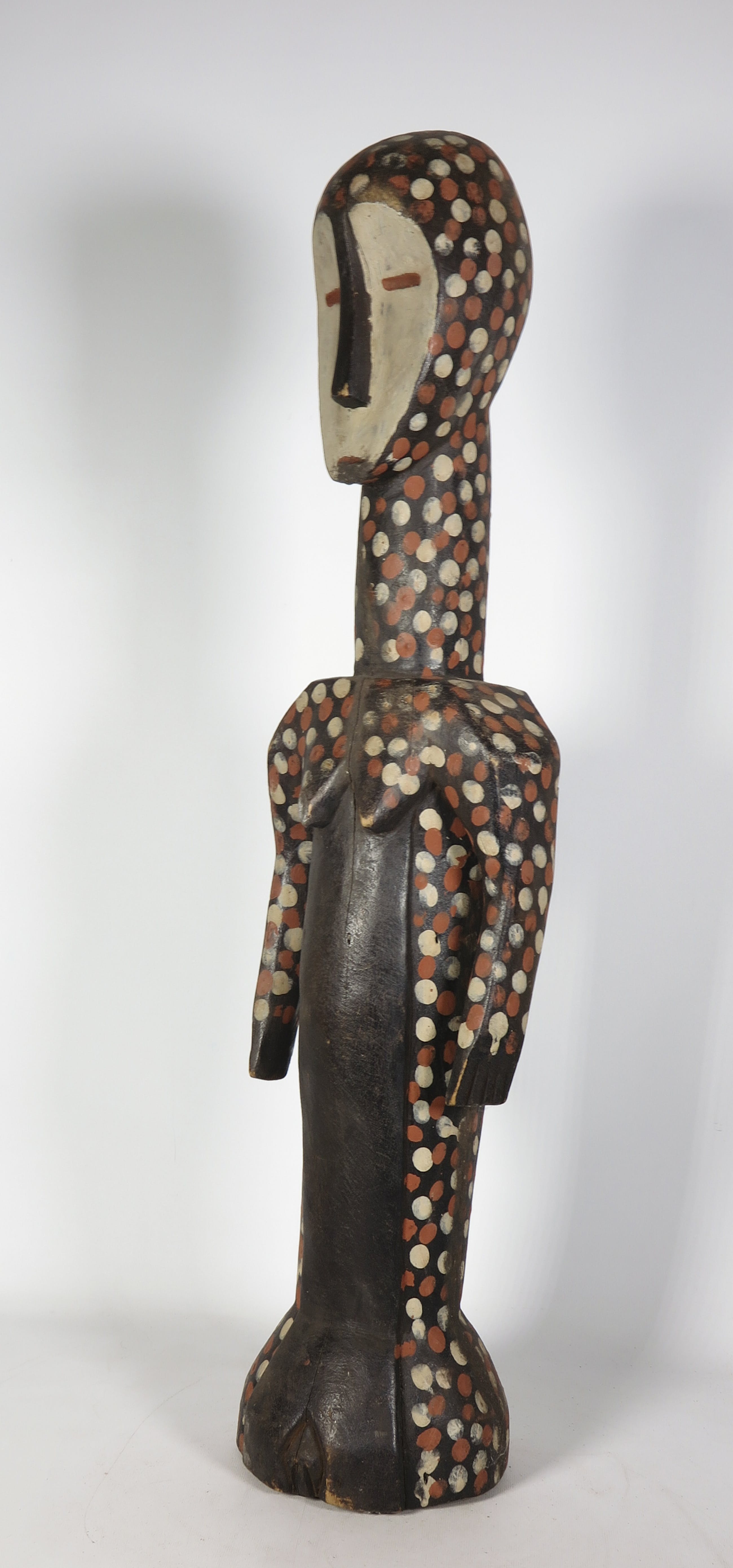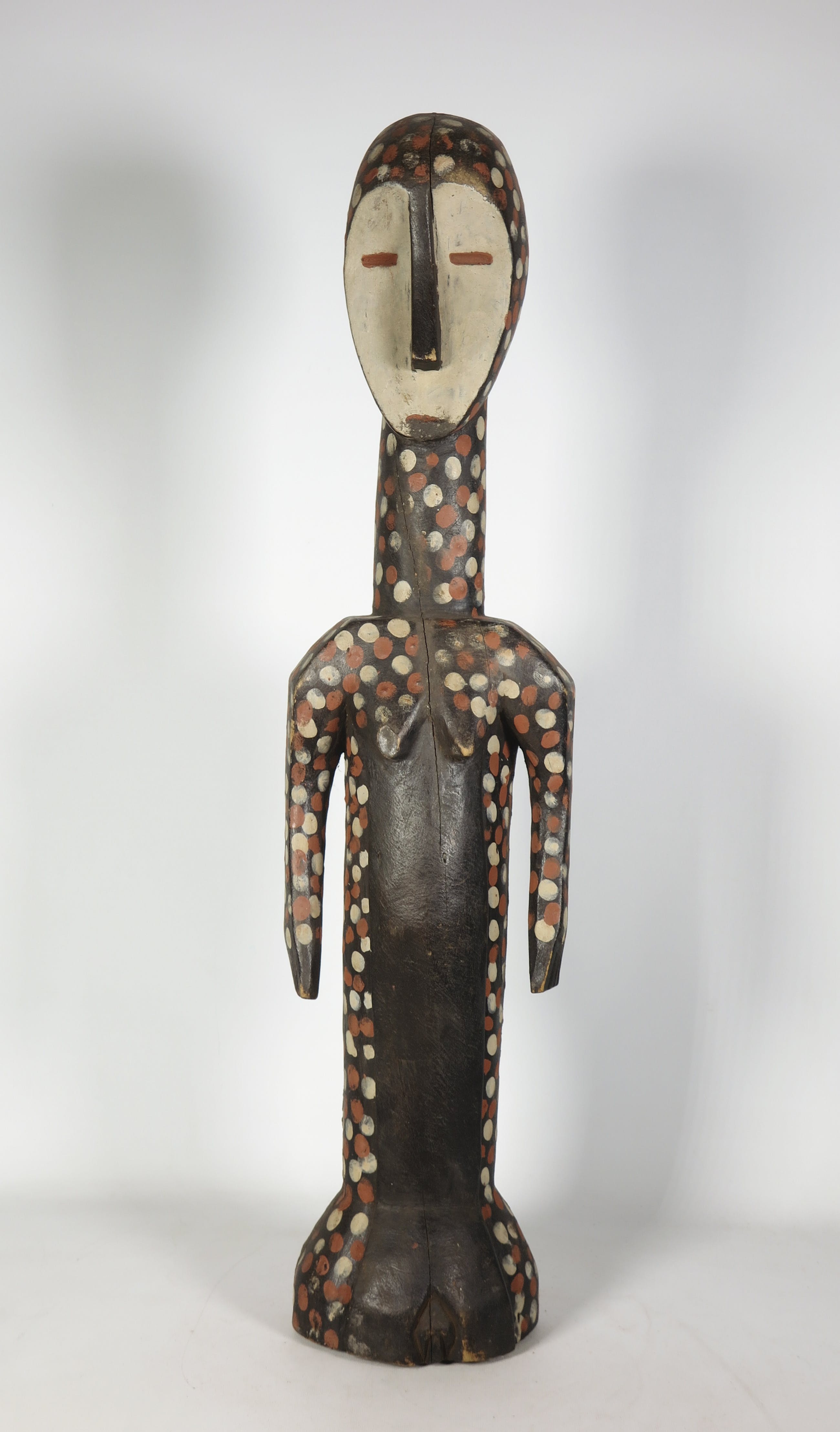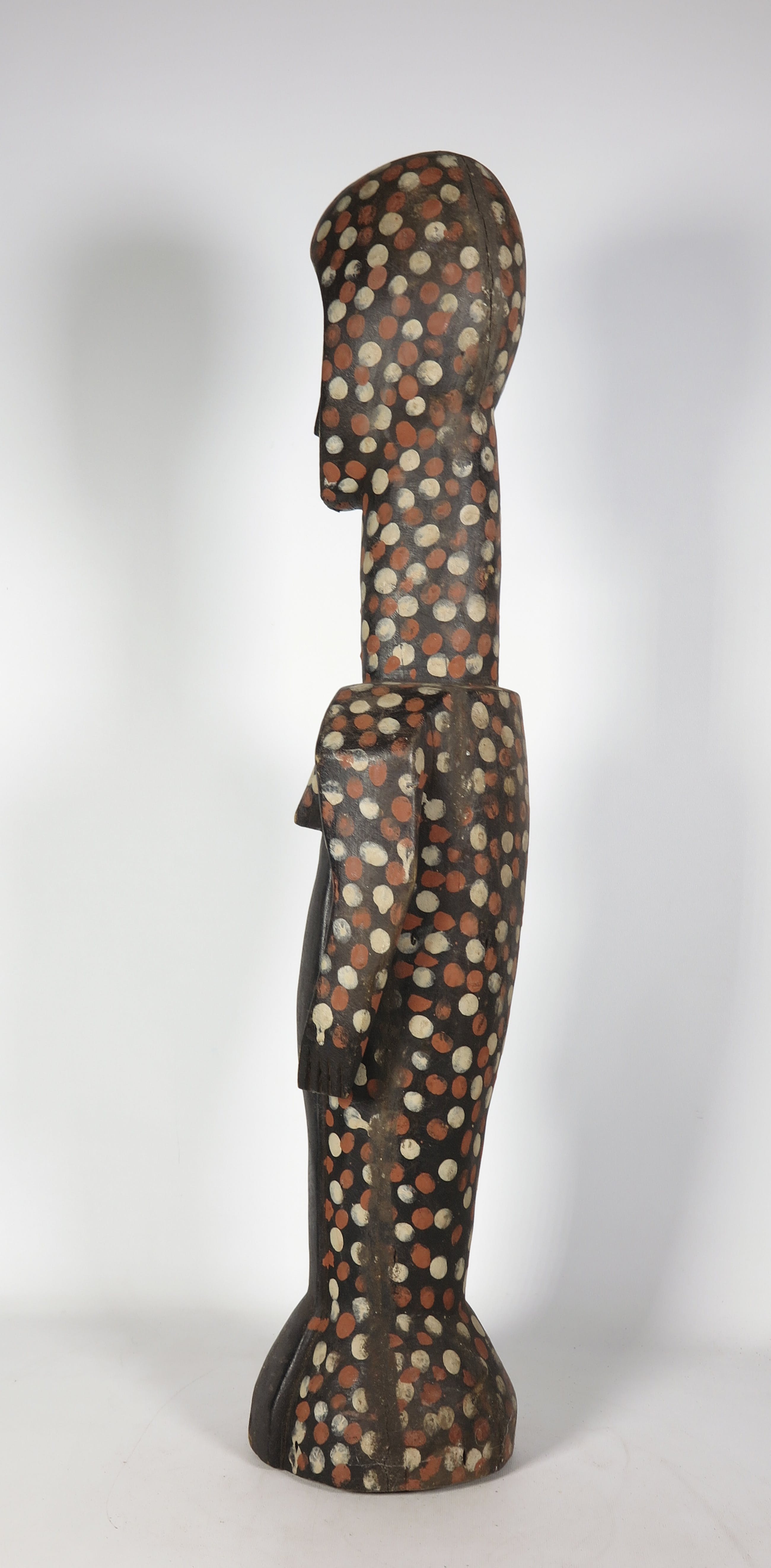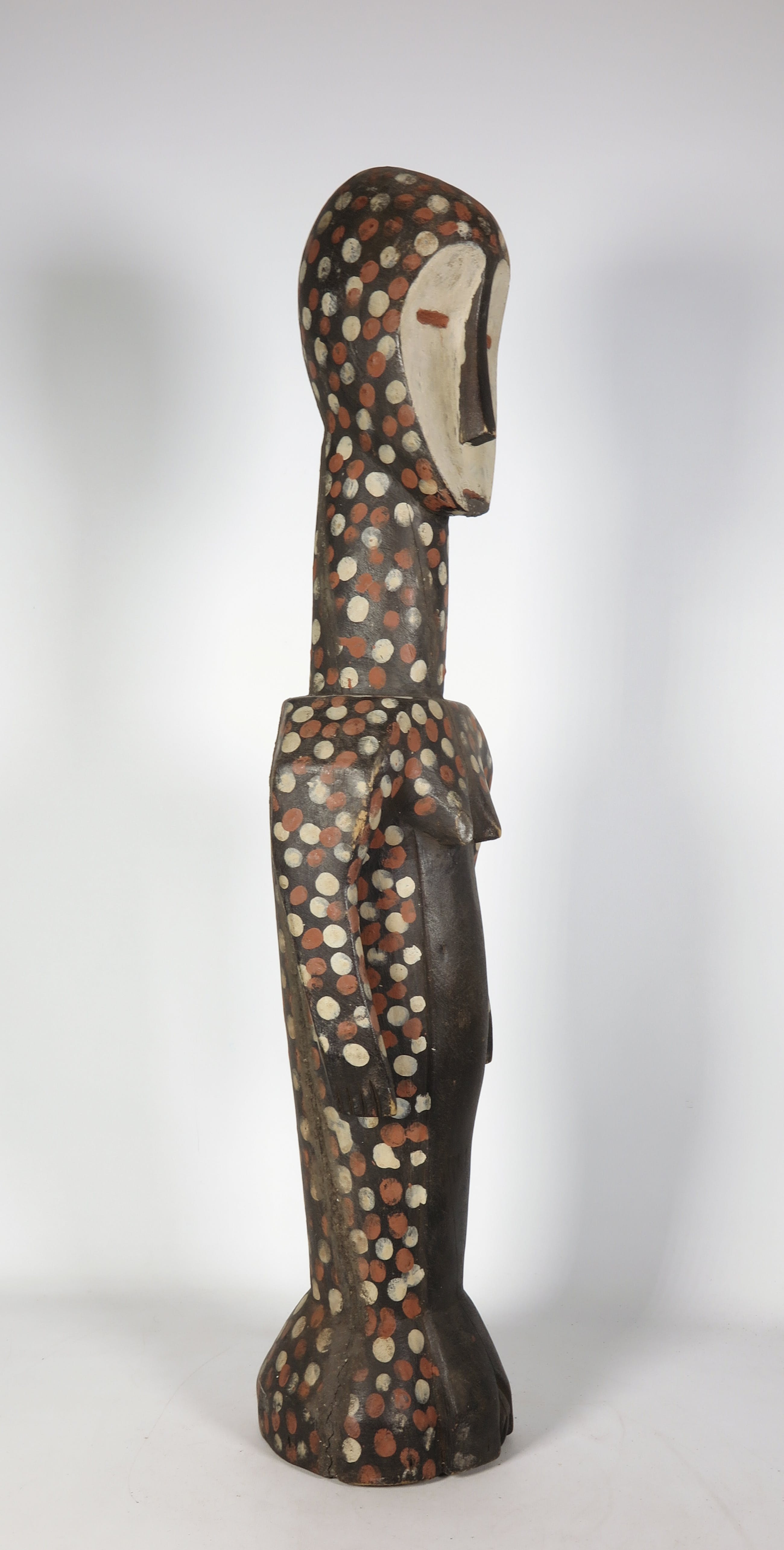 Houten gestoken beeld, beschilderd met rood en witte stippen.